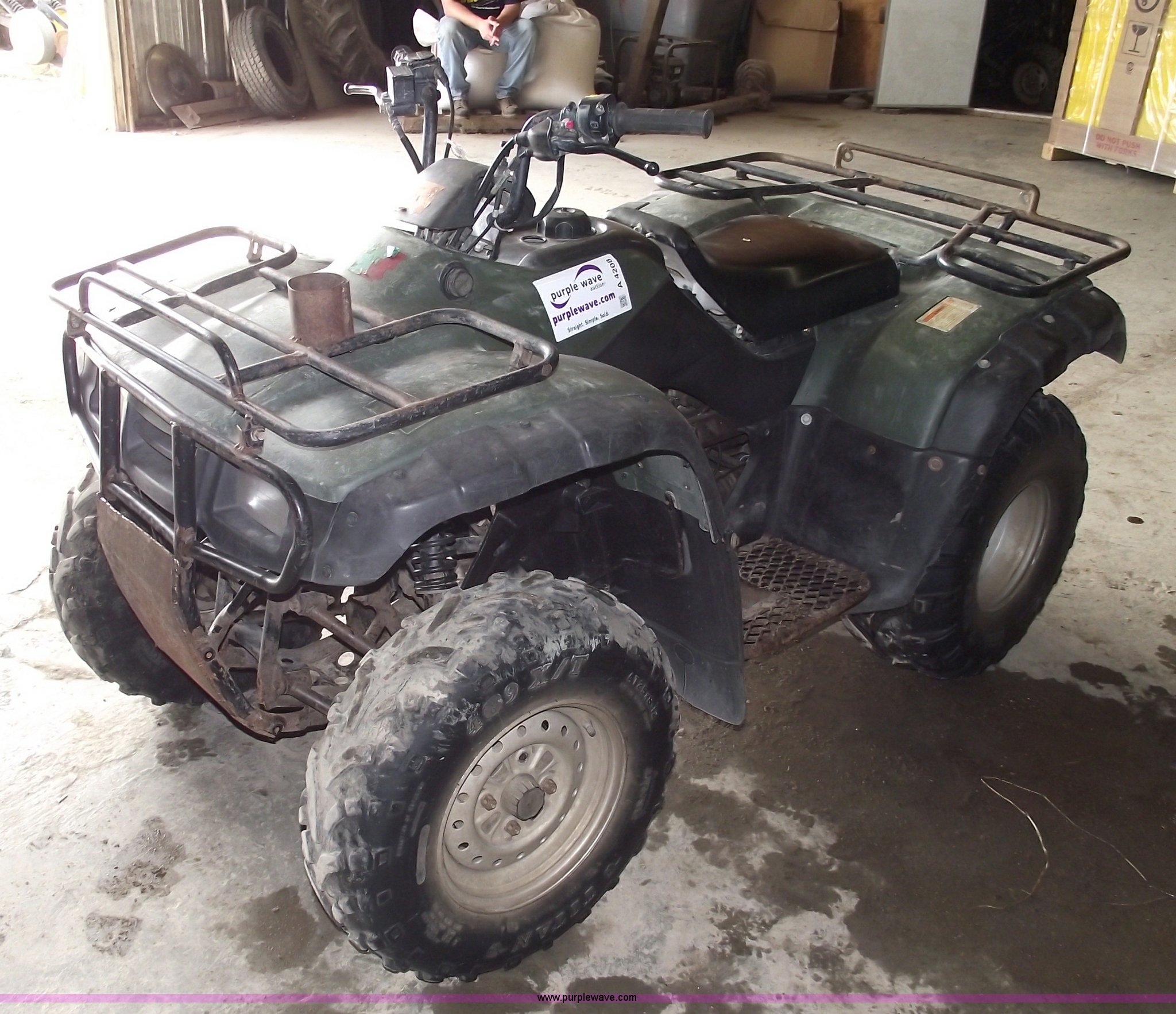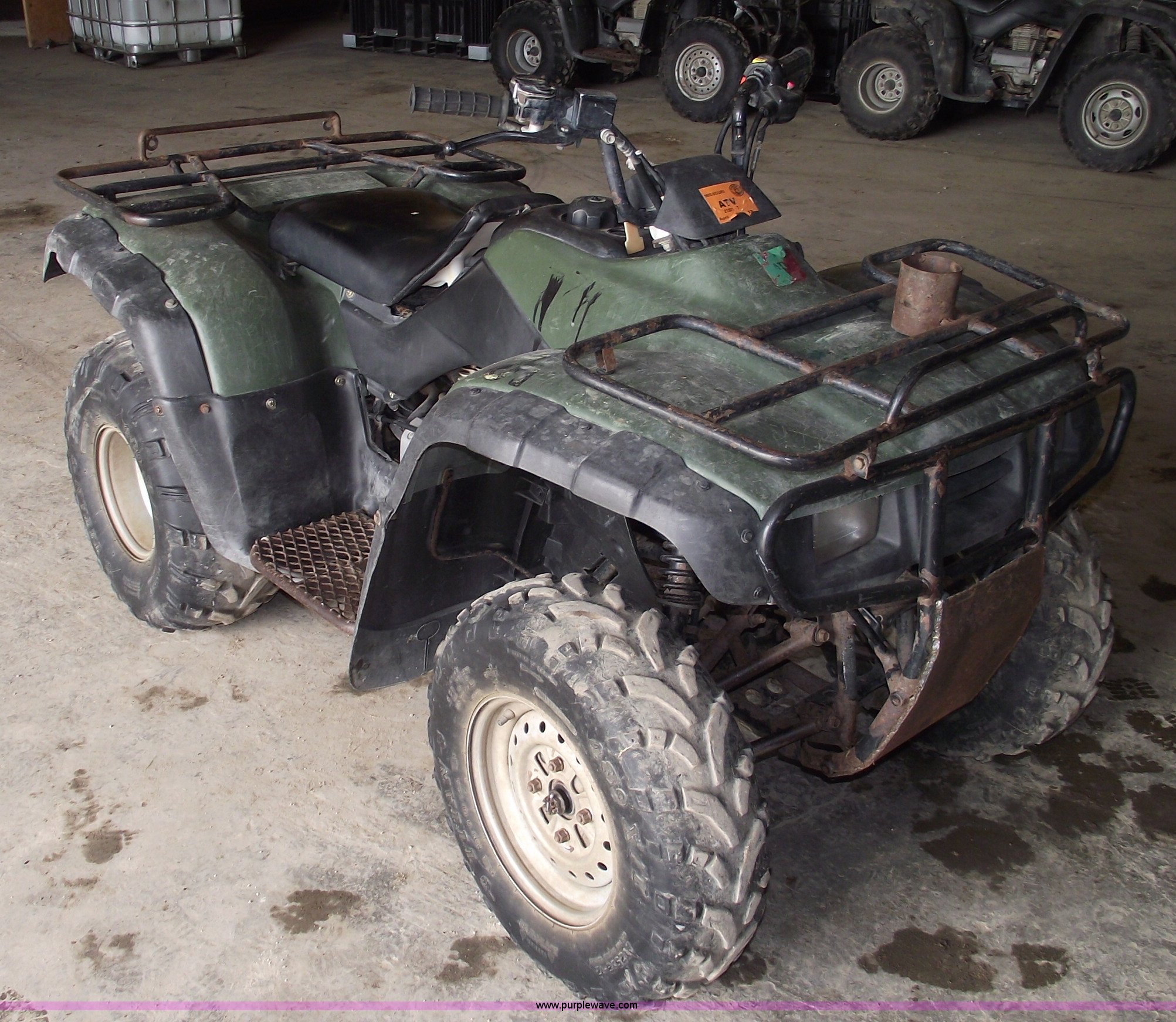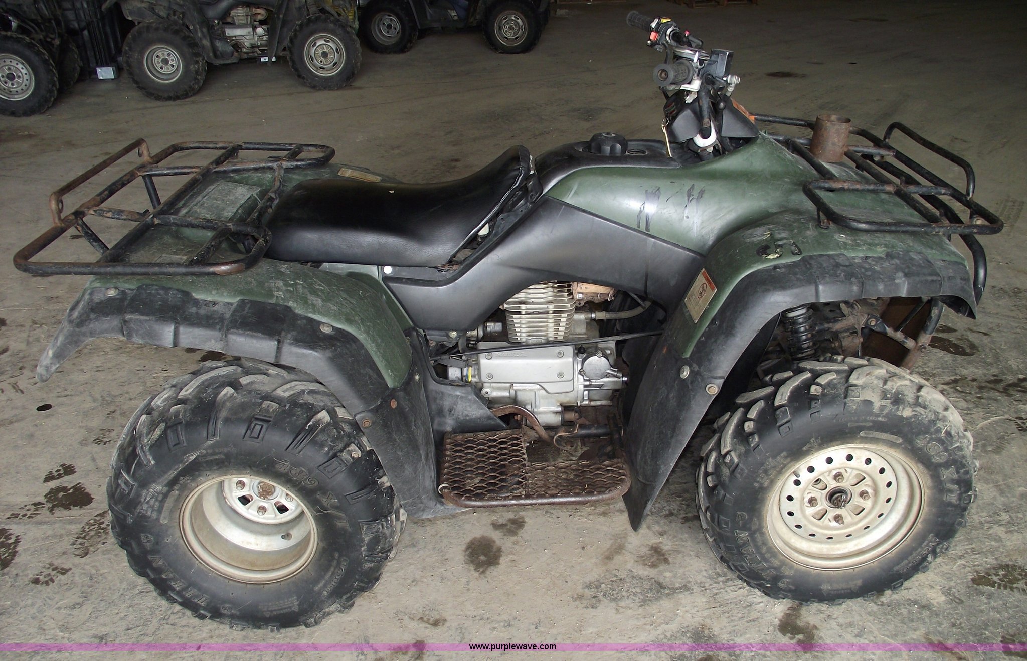 Purple Wave is selling a used ATV in Missouri. This item is a 2002 Honda TRX350 Rancher four wheeler with the following: Five speed manual transmission with reverse, Shaft driven, Electric start, Front and rear racks, Two wheel drive, 25x11-10 rear tires, 25x8-12 front tires, Needs front brakes, Cust.# 65