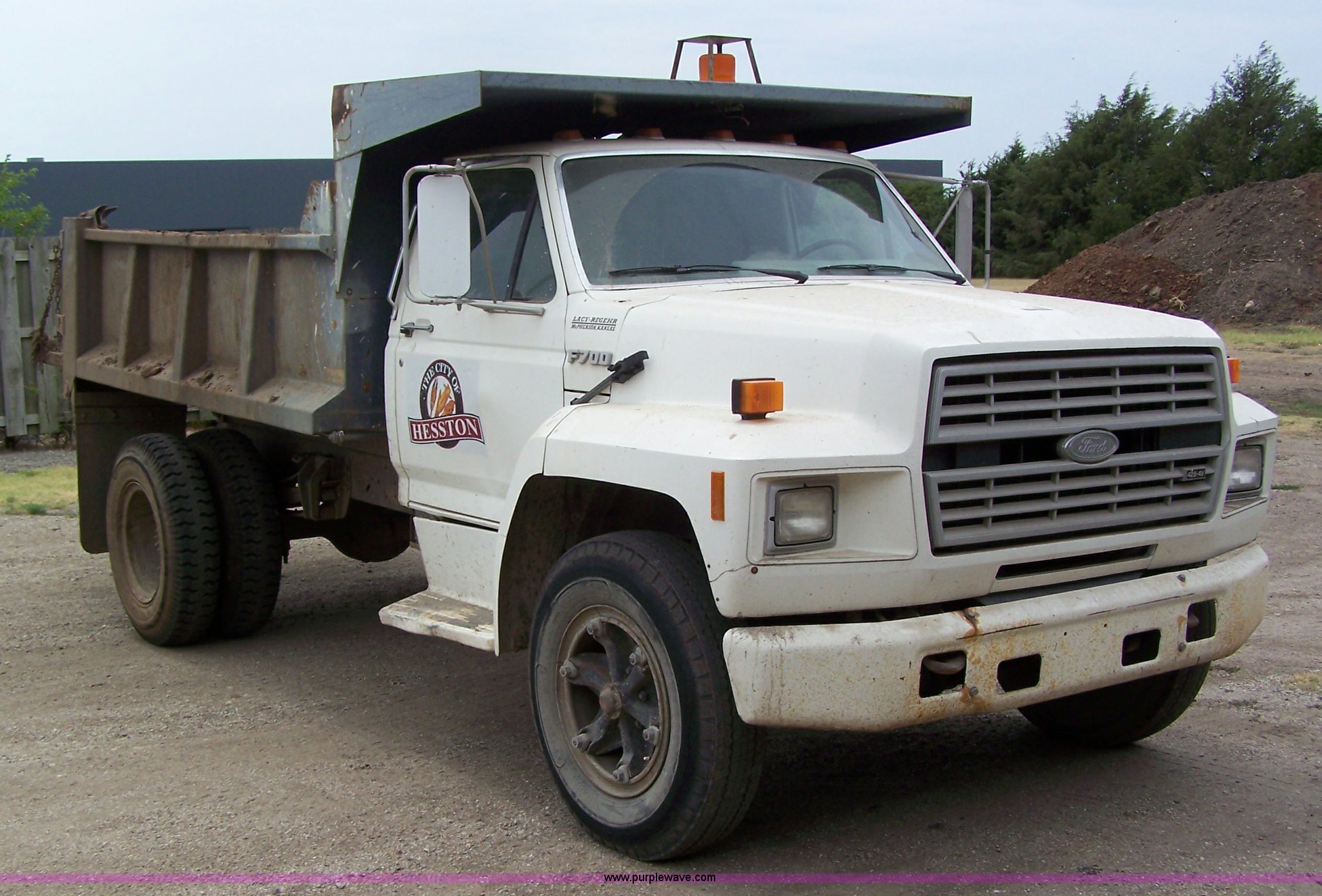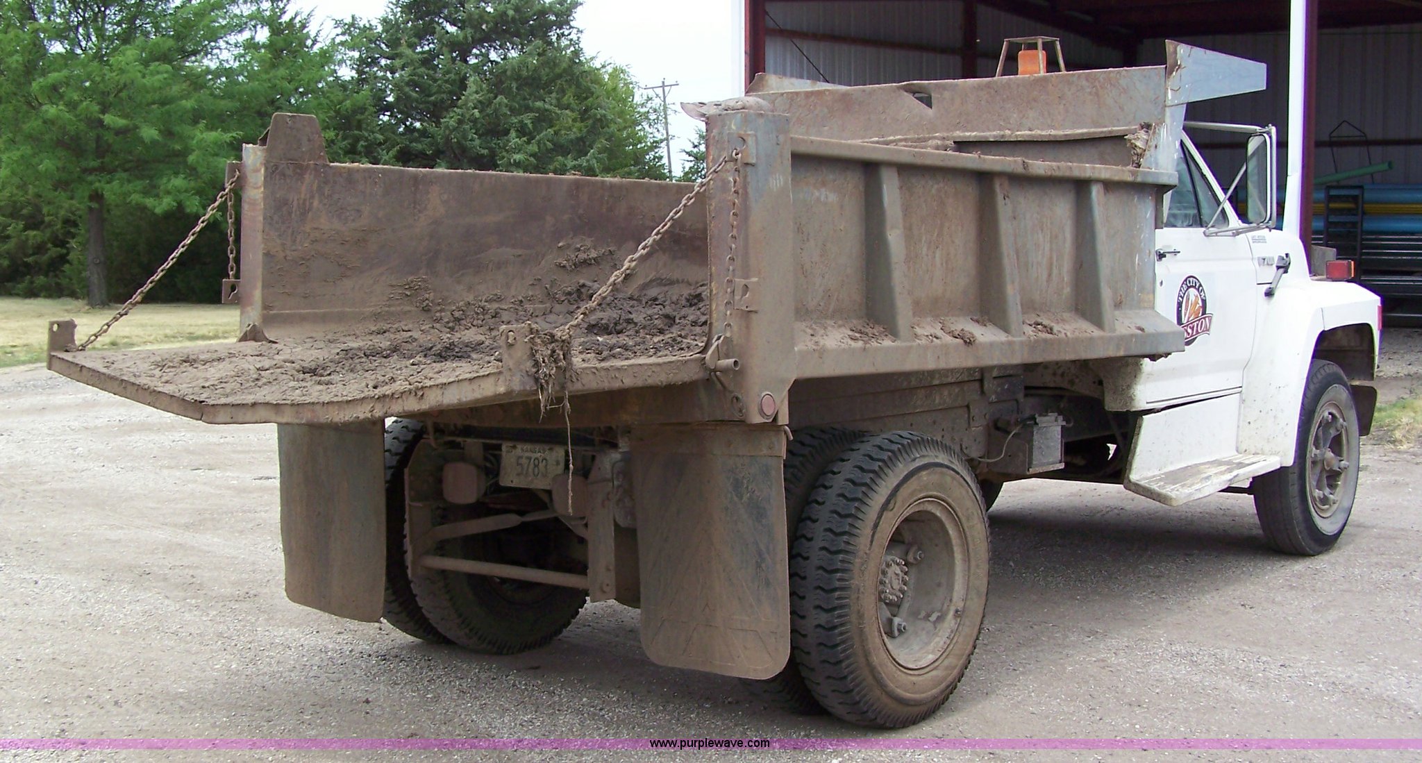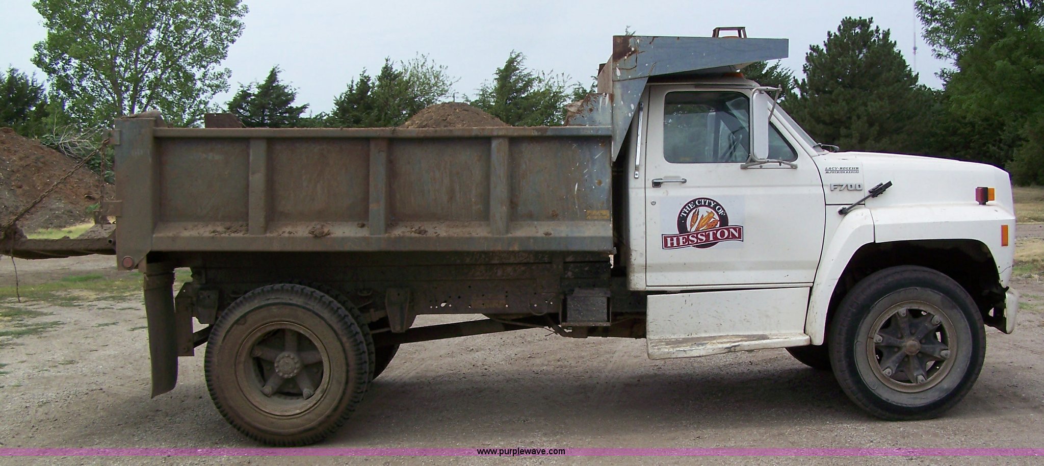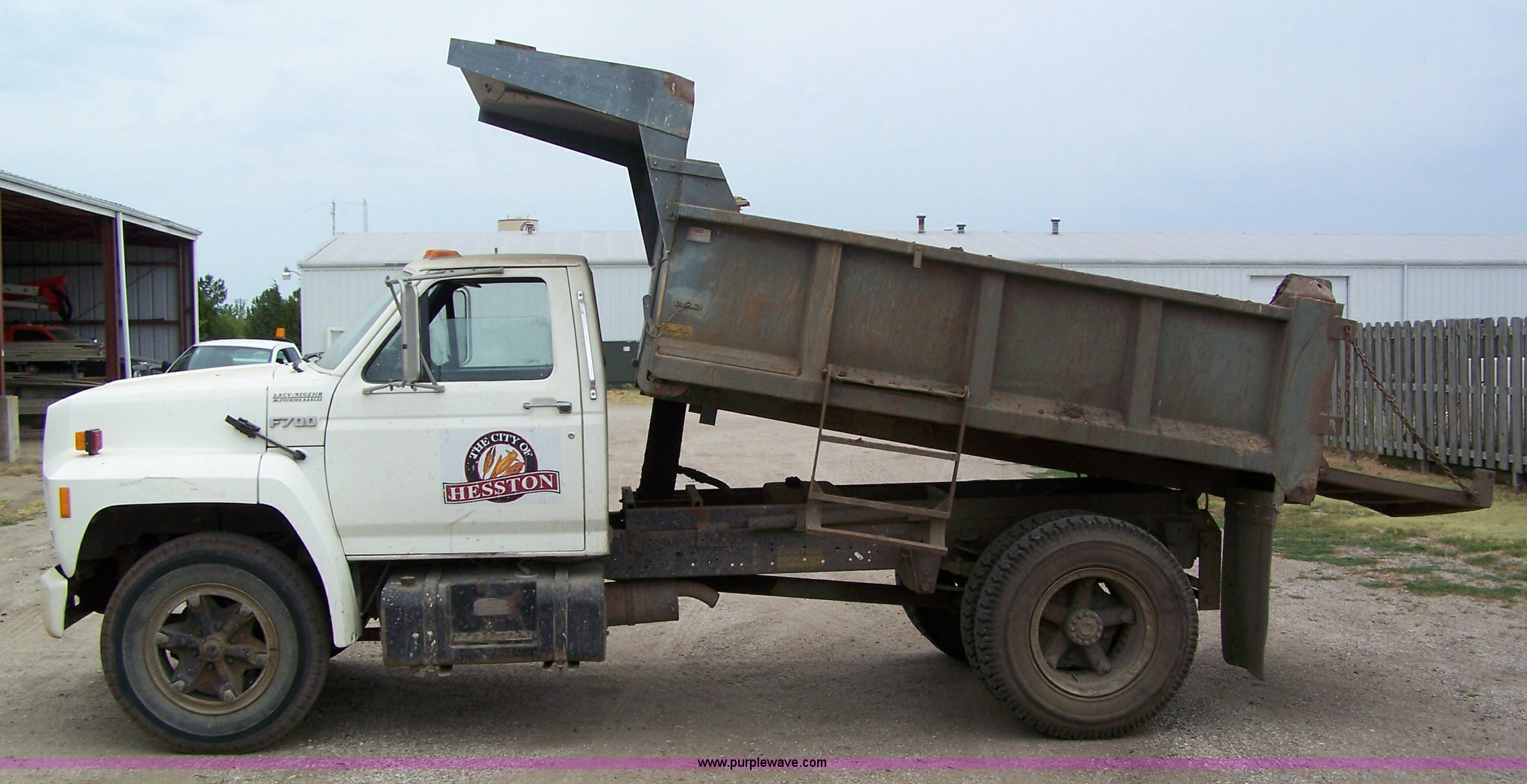 Purple Wave is selling a used Construction Dump Truck in Kansas. This item is a 1989 Ford F700 dump truck with the following: 47,450 miles on odometer, 429 V8 7.0L gas engine, 10 speed split axle manual transmission, Heater, Manual windows and locks, Chelsea PTO, Three stage single ram hoist, GVWR 24,500 lbs, Tailgate will not latch, Unknown drain on electric system