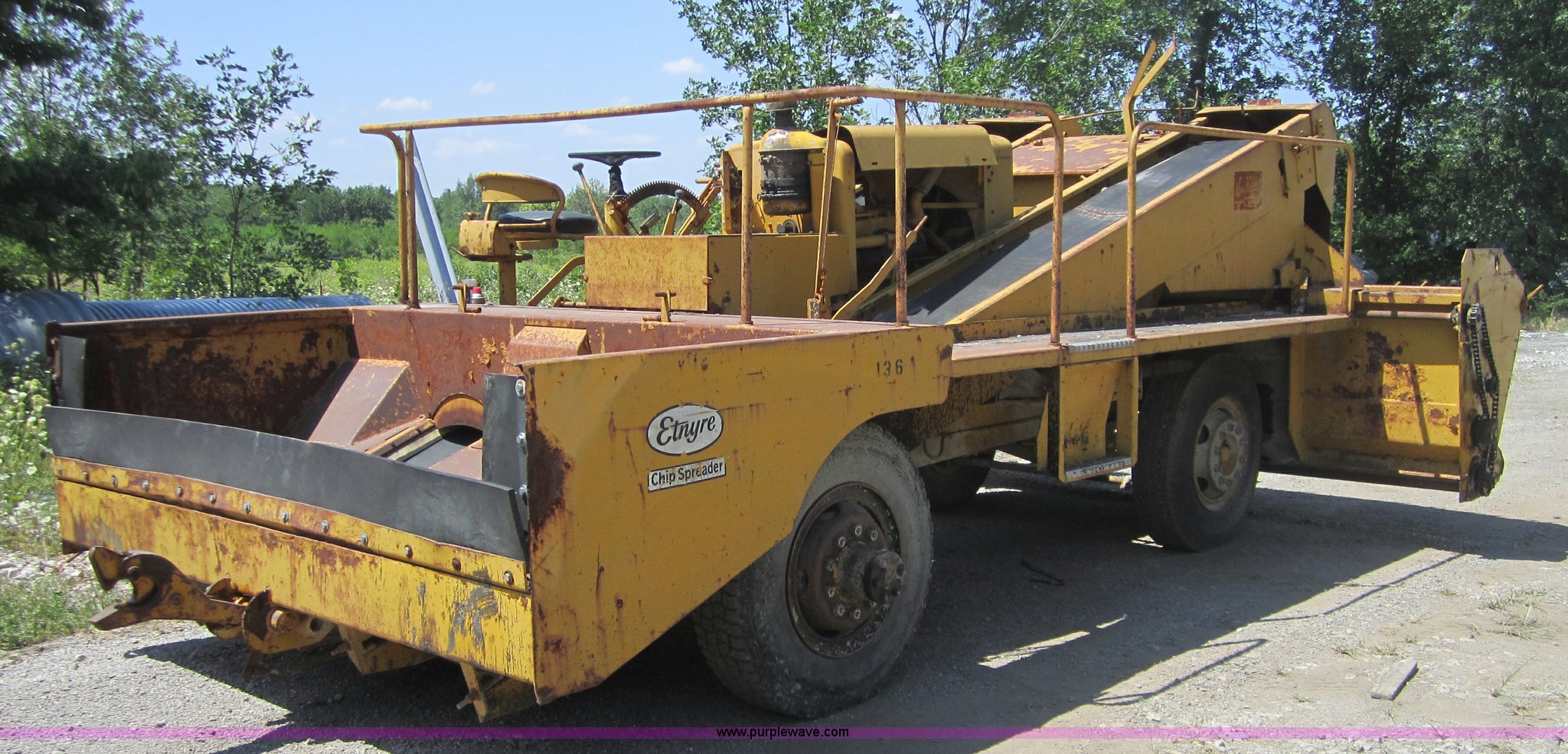 Purple Wave is selling a used Chip Spreader in Kansas. This item is a Etnyre chip spreader with the following: 9.5'W, International six cylinder engine, Manual gate controls, 10.00R20 tires, No brakes, Serial X3587, Unit 136