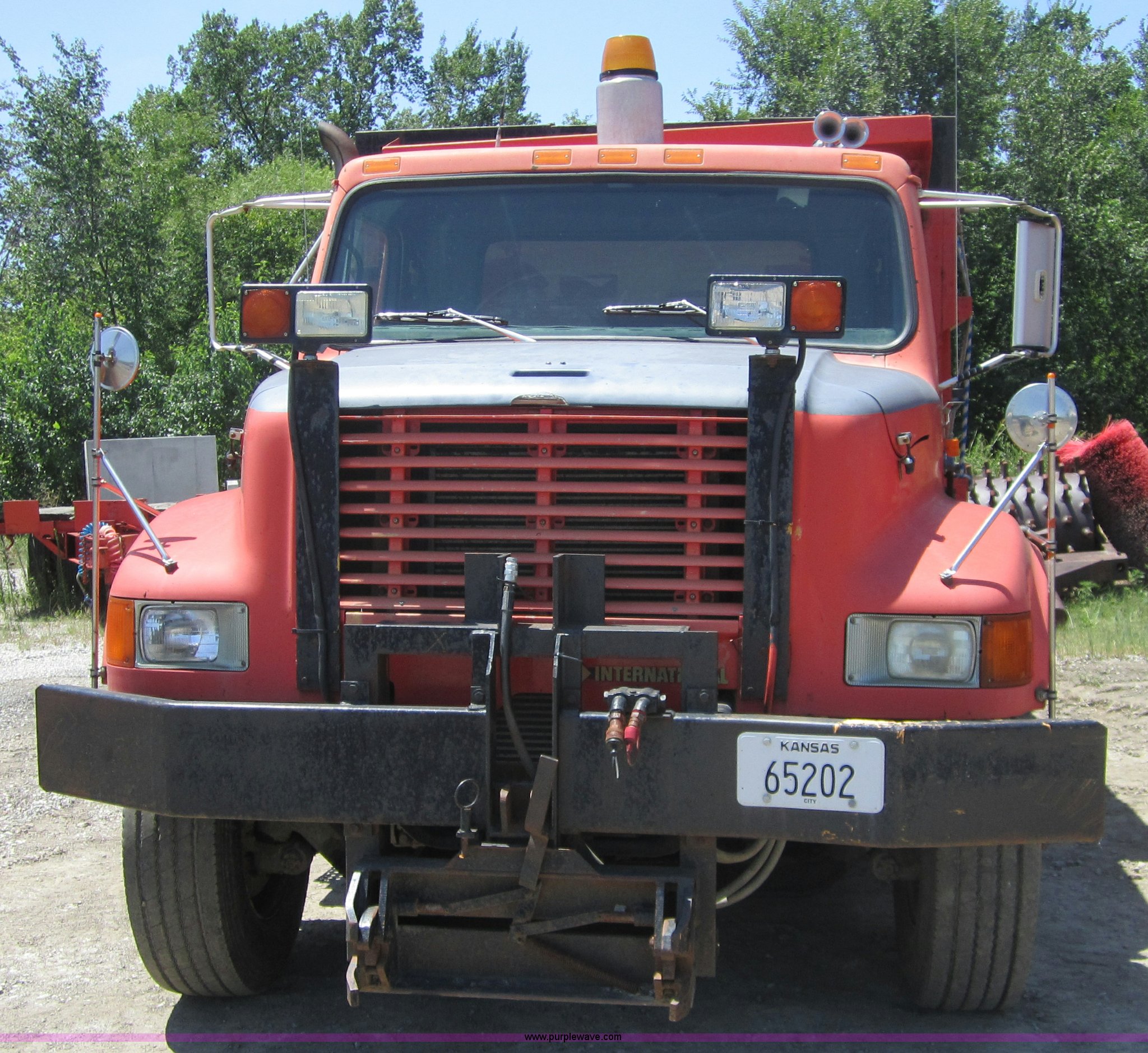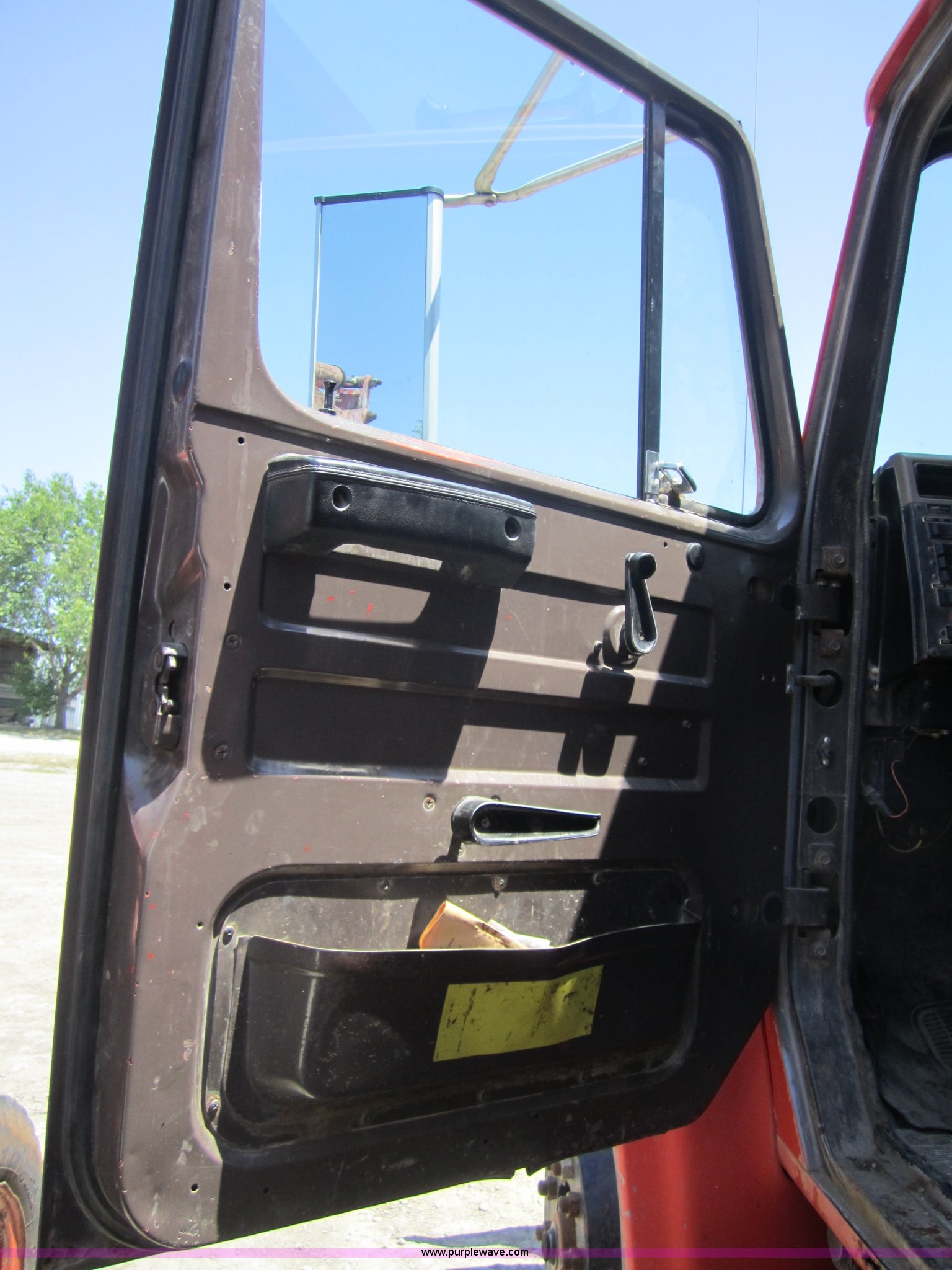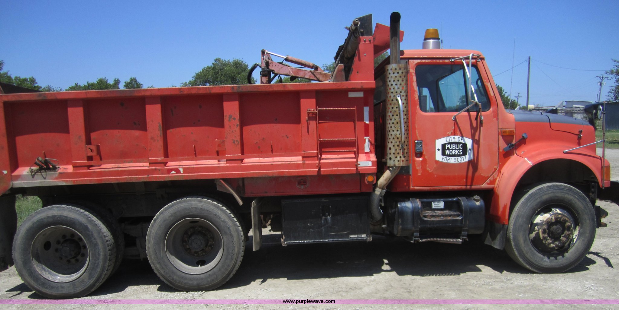 Purple Wave is selling a used Construction Dump Truck in Kansas. This item is a 1993 International 4900 dump truck with the following: 205,790 miles on odometer, 12,801 hours on meter, International DT466 7.6L I6 diesel engine, Five speed automatic transmission, Twin screw, Heater, AM/FM, Air ride seat, Heated mirrors, 13' dump bed, Air end gate, Roll over tarp, Bumper, Block heater, Trailer wiring, Pintle hitch, Dual 50 gallon fuel tanks, Spring suspension, PTO, Air brakes, Brake controller, 176" wheelbase, Coolant in oil, ID 250