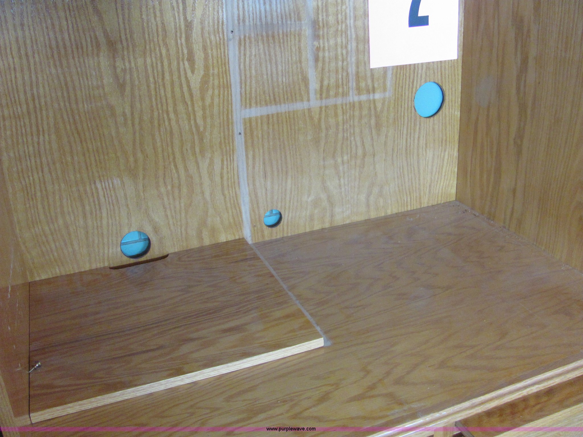 Purple Wave is selling a used Furniture in Kansas. This item is a (4) assorted oak computer desks with the following: 56" x 48" x 26", Solid oak doors, Lockable drawers, Polyurethane stain
