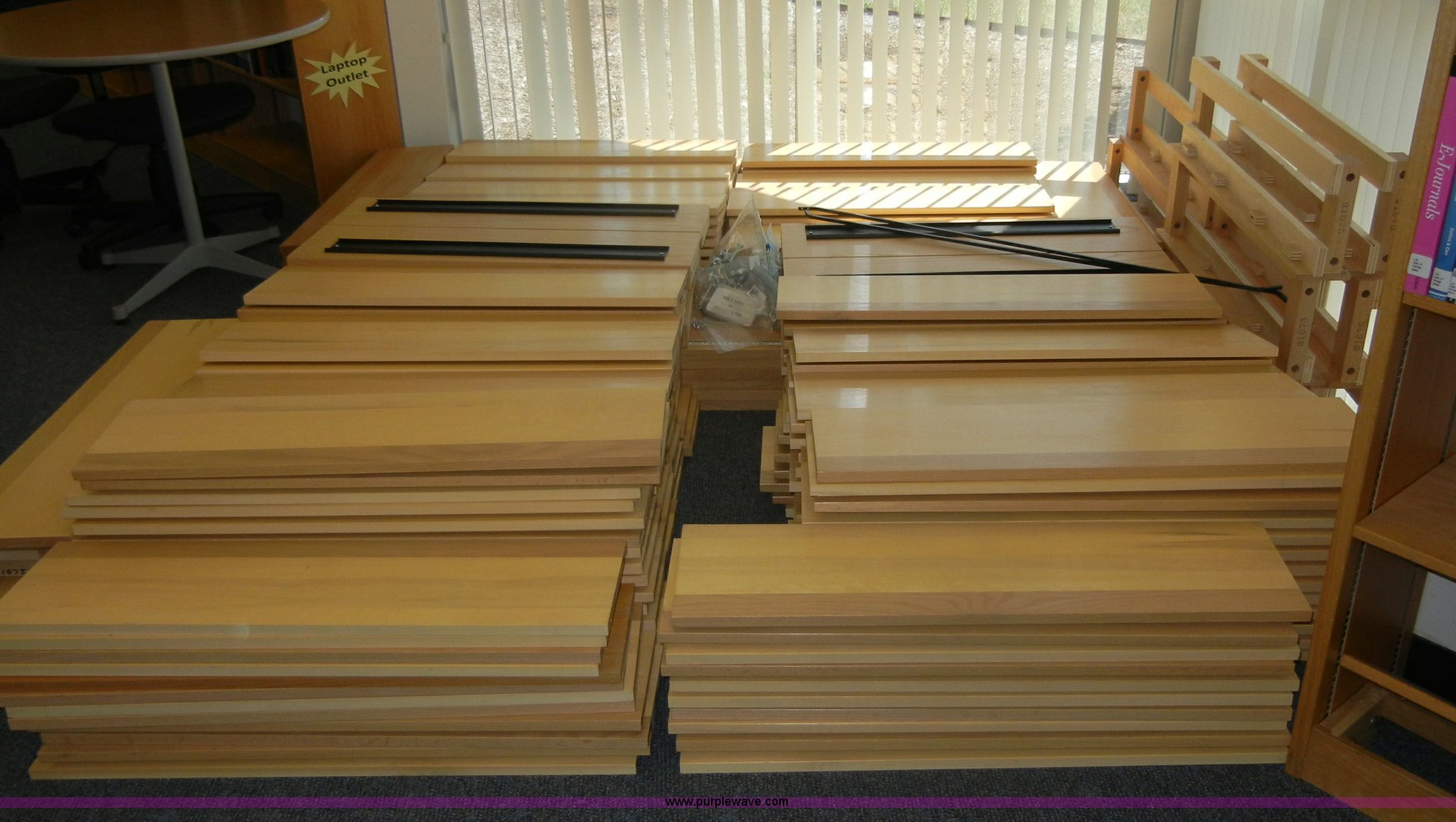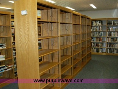 Purple Wave is selling a used Shelving and Storage in Kansas. This item is a (4) light oak wooden shelving units with the following: 7' x 15' x 20", Double sided, (8) end panels, (16) support panels, (240) shelves, 35"L x 9"D, (800) shelf brackets, (240) metal overhead wire book supports