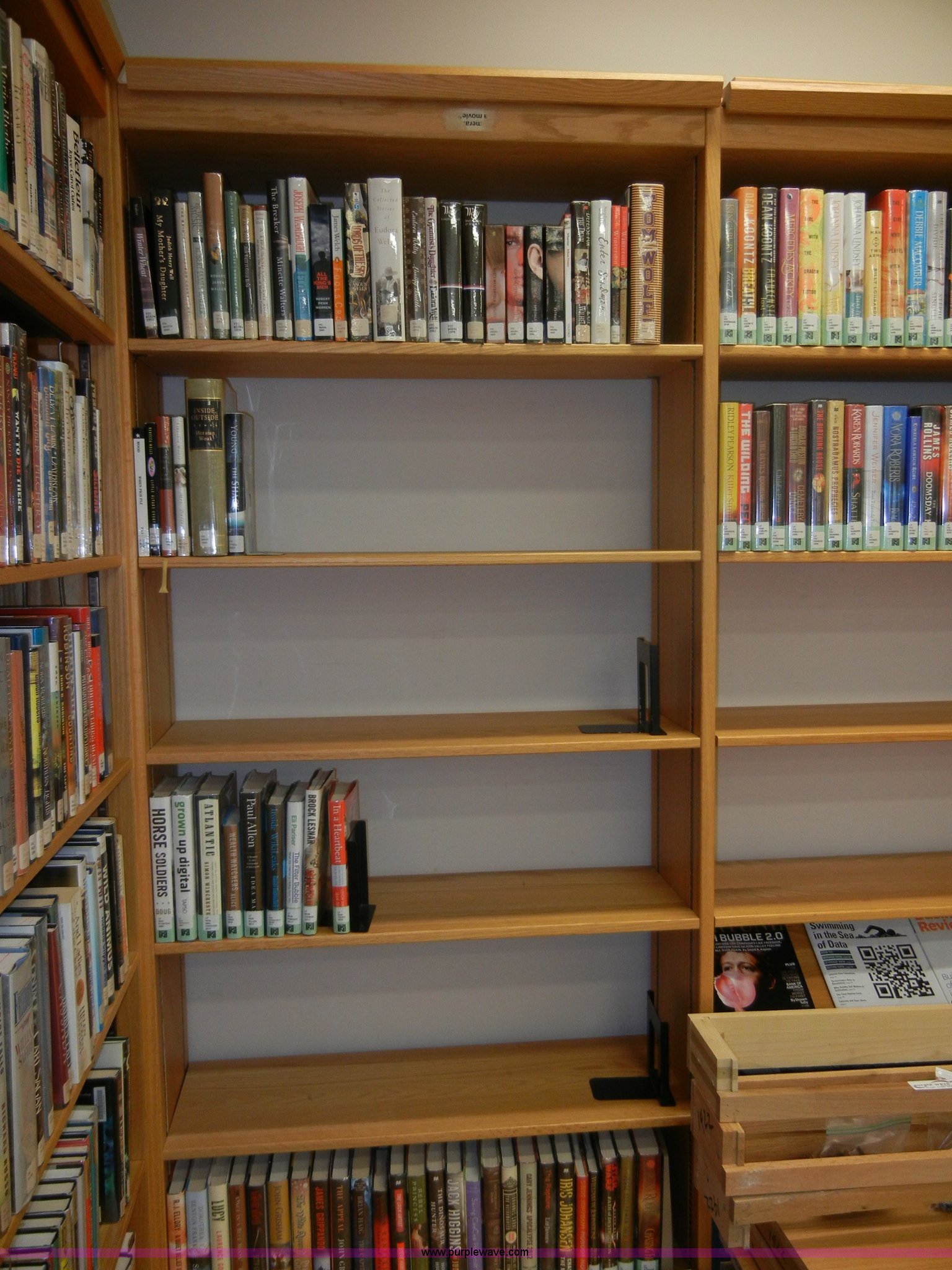 Light oak wooden shelving units. 7' x 15' x 12", Single side, wall mounted, (2) end panels, (4) support panels, (42) shelves, 35"L x 11.5"D, (168) shelf brackets, Books not included. KSU Salina Facilities. 1832 Burchinal Rd. Salina, KS 67401