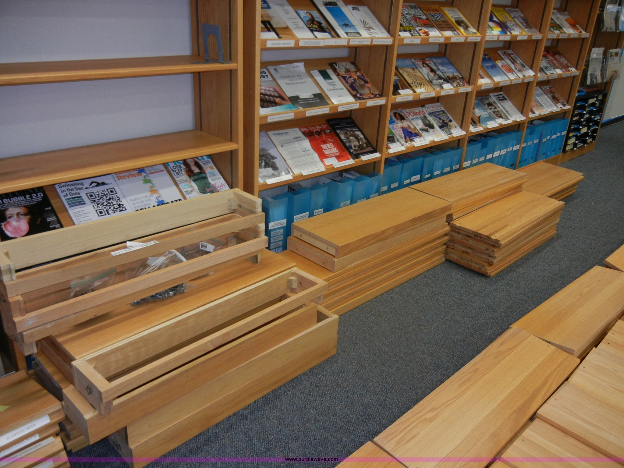 Purple Wave is selling a used Shelving and Storage in Kansas. This item is a Light oak wooden shelving units with the following: 7' x 15' x 12", Single side, wall mounted, (2) end panels, (4) support panels, (42) shelves, 35"L x 11.5"D, (168) shelf brackets, Books not included