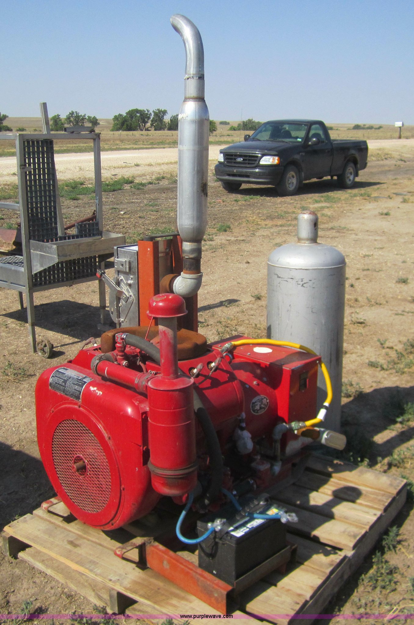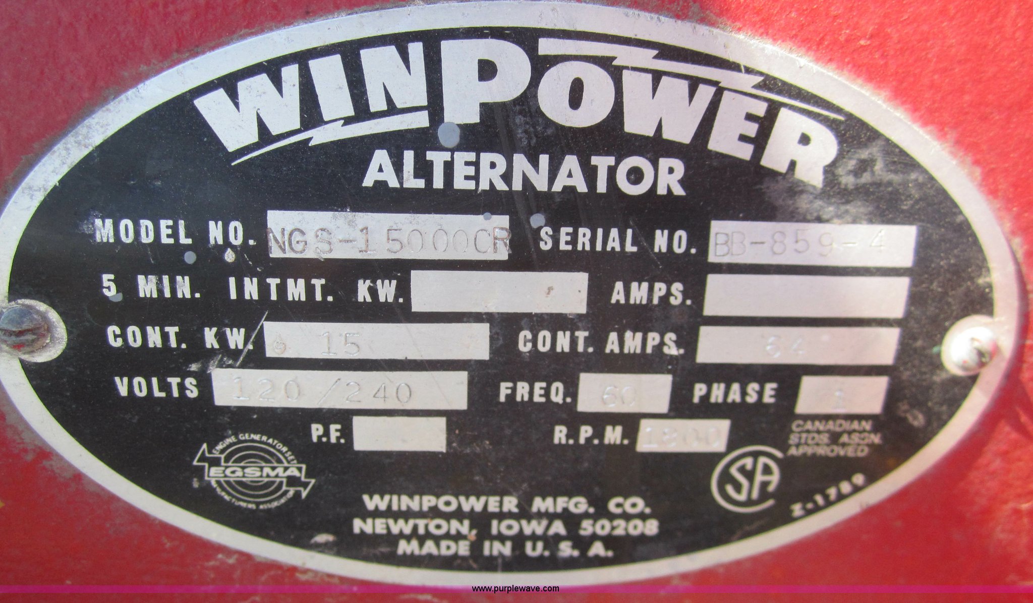 Purple Wave is selling a used Generator Set in Kansas. This item is a Winpower NGS-15000CR propane generator with the following: Wisconsin VG4D four cylinder engine, Electric start with battery, 15 KW continuous, 64 amps continuous, Single phase, 120/240 volt, 69 lb propane tank, Stainless steel breaker box