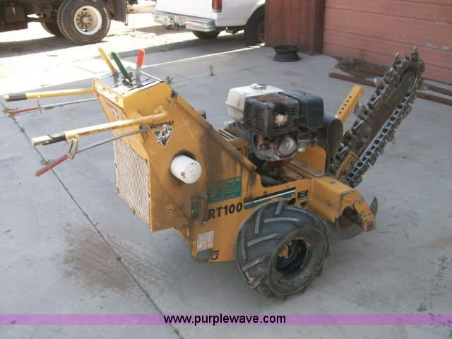 Purple Wave is selling a used Trencher or Rock Saw in California. This item is a 2005 Vermeer RT100 with the following: Kohler 13 HP gas engine, 34.5"W x 86"L, 4" or 6" trench width, 24", 30", or 36" trench depth, Non operational