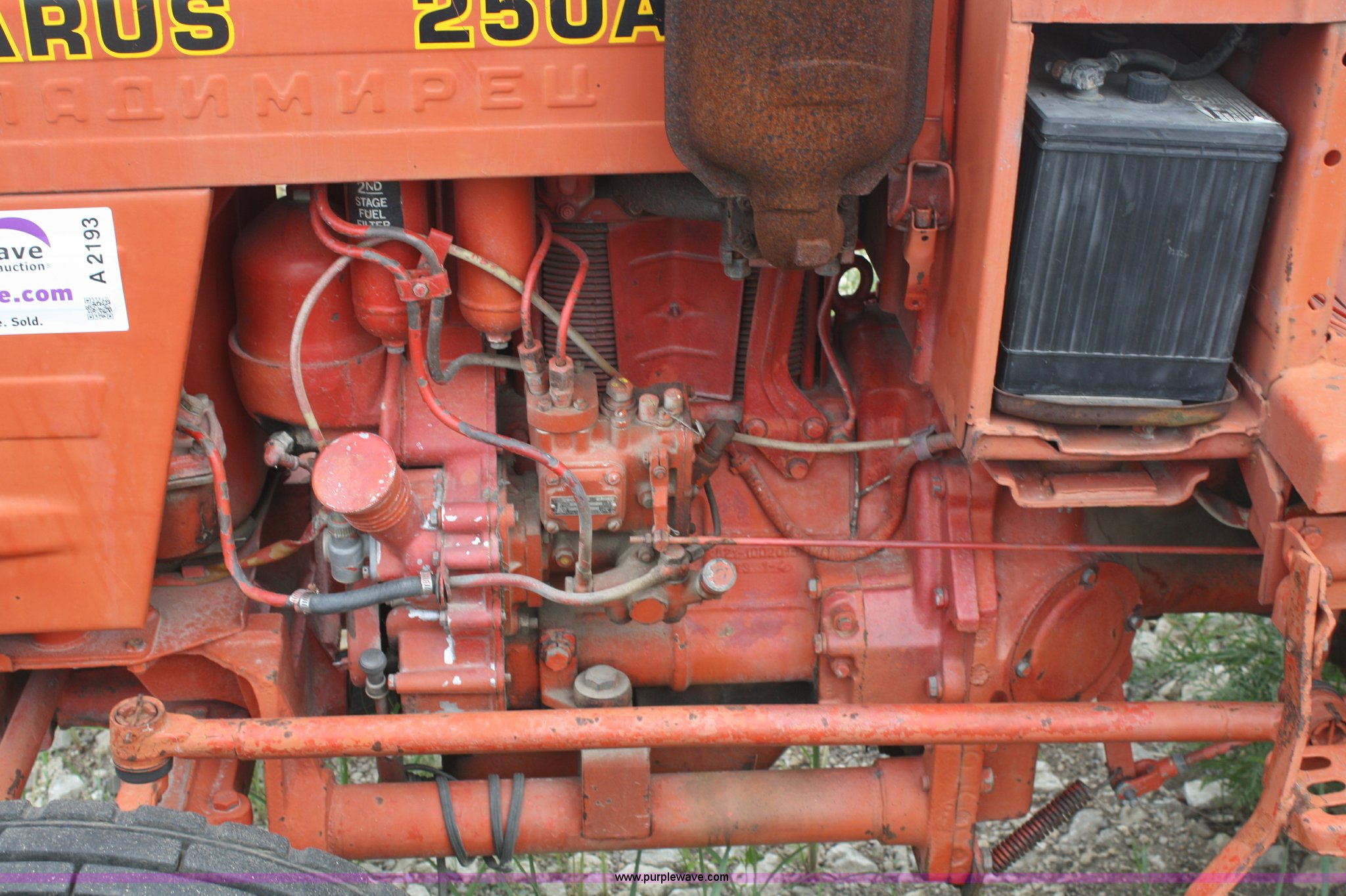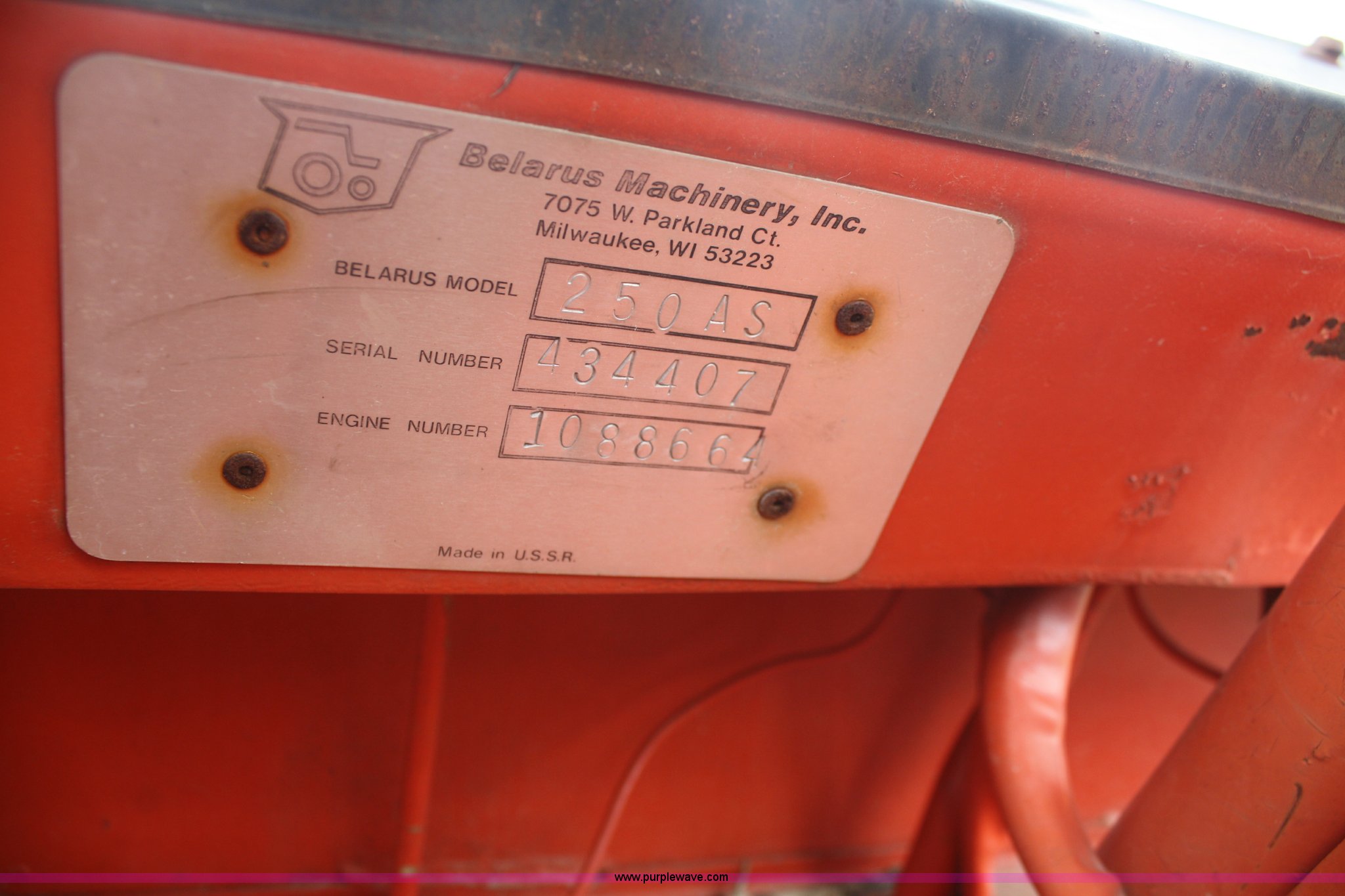 Purple Wave is selling a used Tractor in Kansas. This item is a Belarus 250AS tractor with the following: Two cylinder diesel engine, Does not start or run, Six speed transmission, 540 PTO, 10-28 tires, Serial 434407