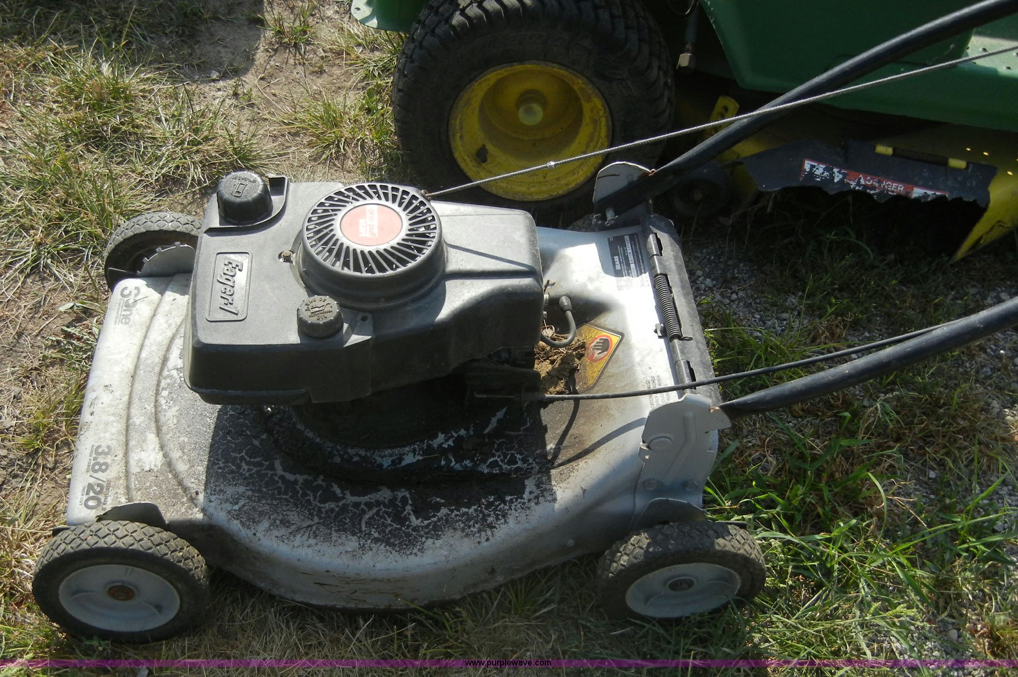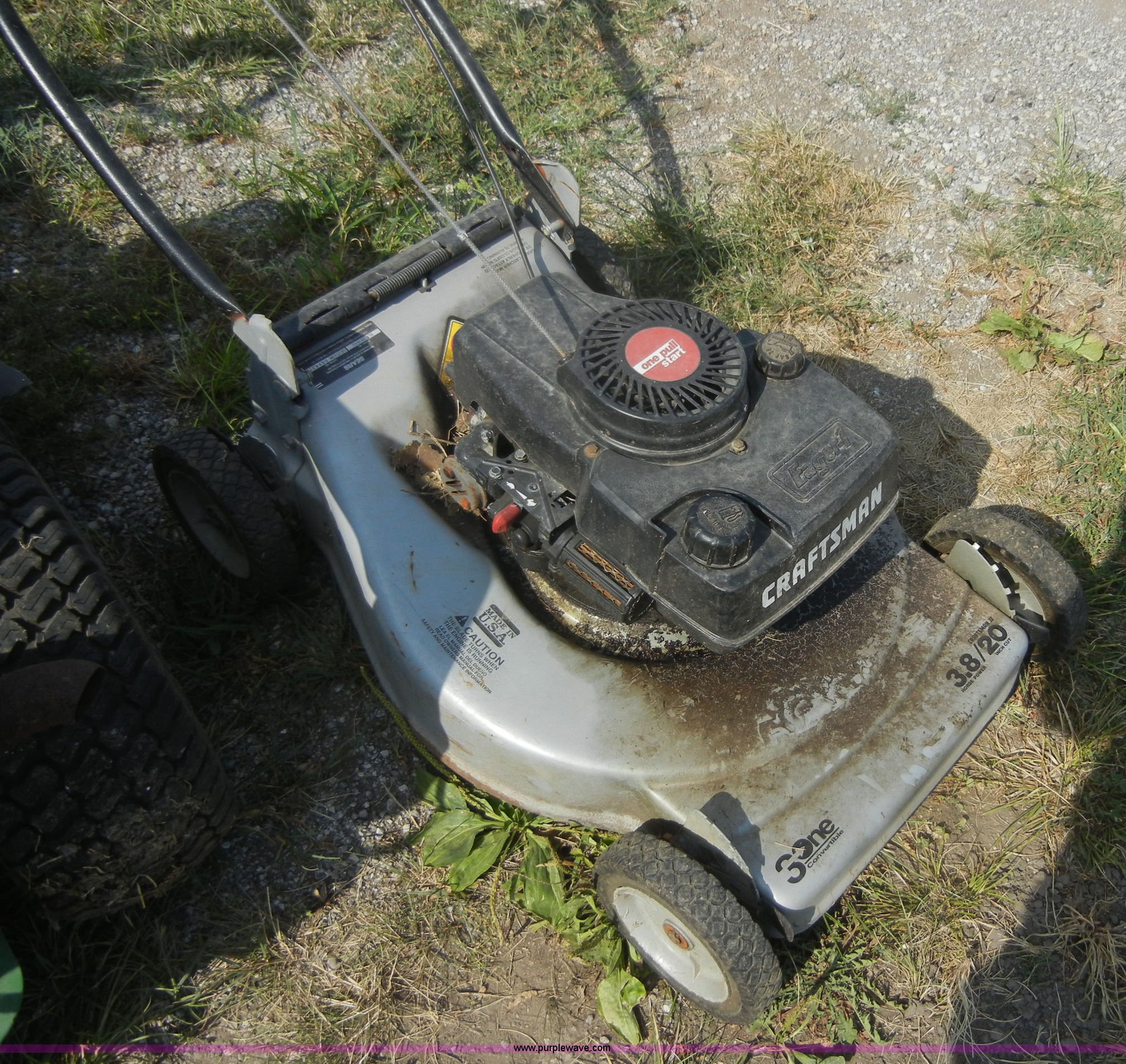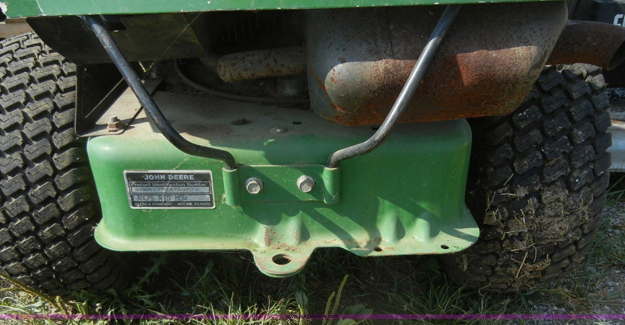 Purple Wave is selling a used Lawn and Garden in Kansas. This item is a John Deere RX75 lawn mower with the following: 32" cut, 9 HP OHV engine, Electric start, Spark plug issue, Seven speed transmission, 11x4.00-5 front tires, 16x6.50-8 rear tires, Cosmetic damage at rear body frame, Craftsman 20" push mower included, Eager-1 3.8 HP engine, Model 917.383640, Serial 082593M049437, Serial M0RX75X476453