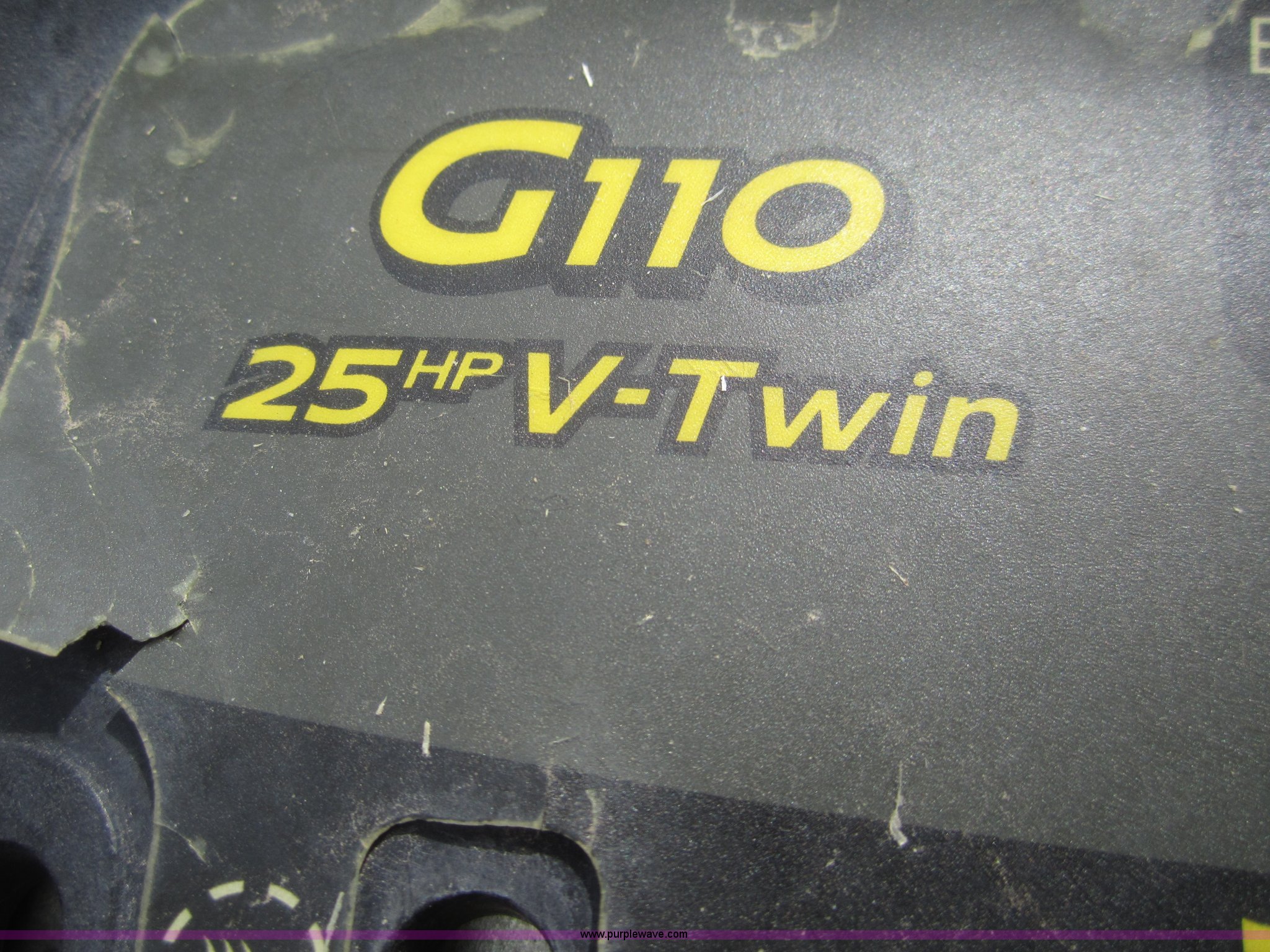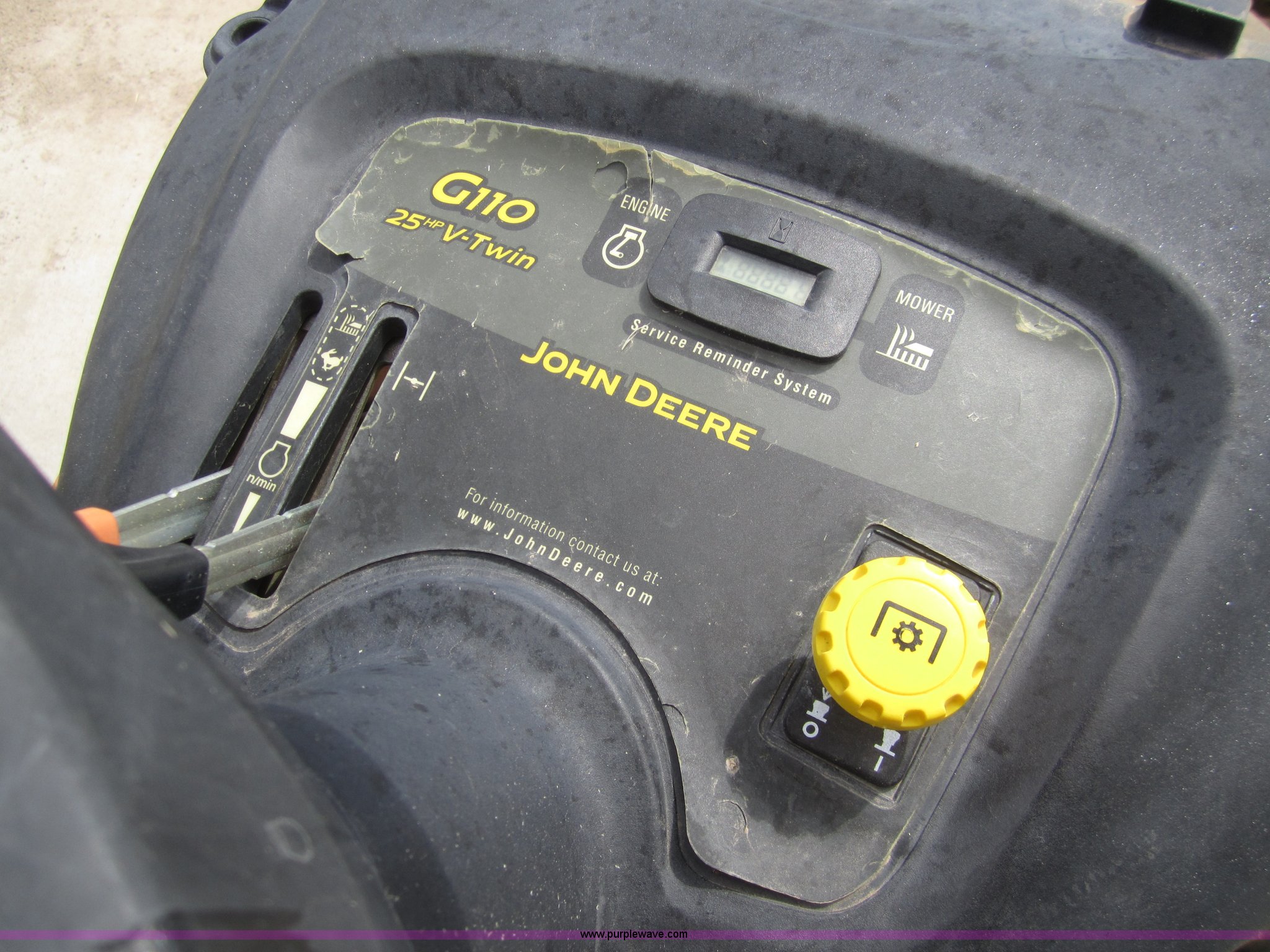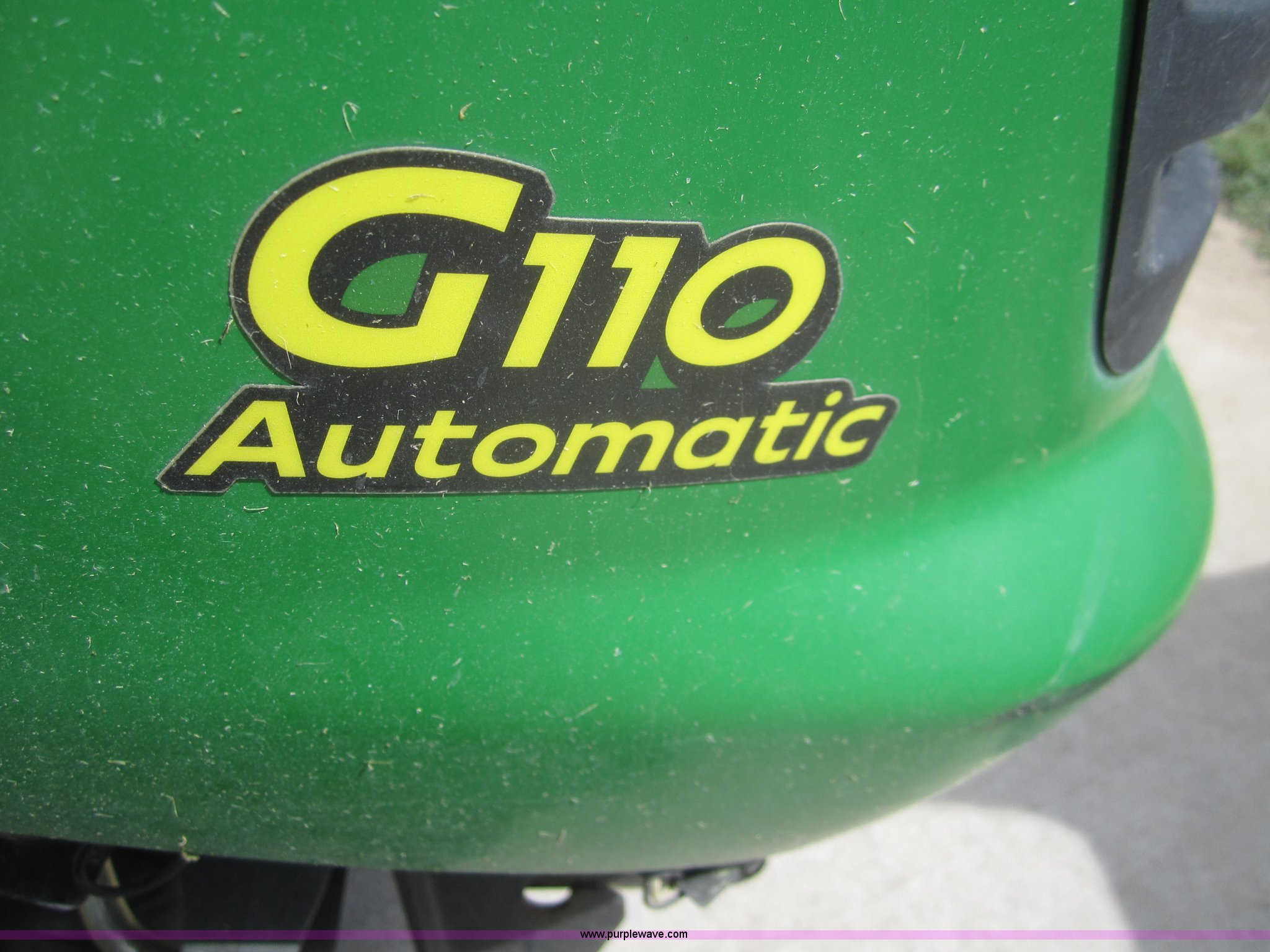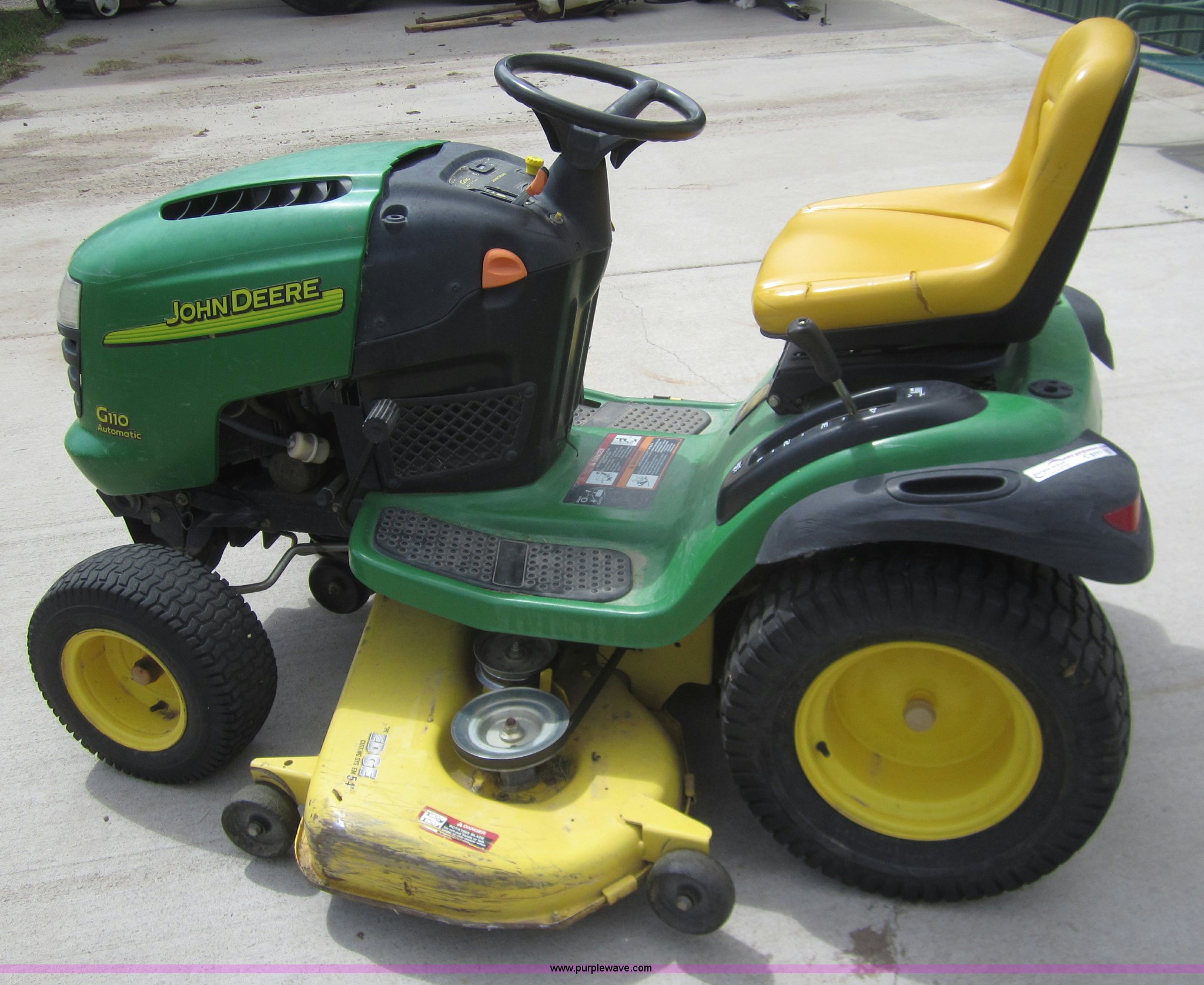 Purple Wave is selling a used Lawn and Garden in Kansas. This item is a John Deere G110 automatic lawn mower with the following: 405 hours on meter, 54" cut, Kohler Command 25 HP engine, 23x10.5 rear tires, 16x6.50 front tires