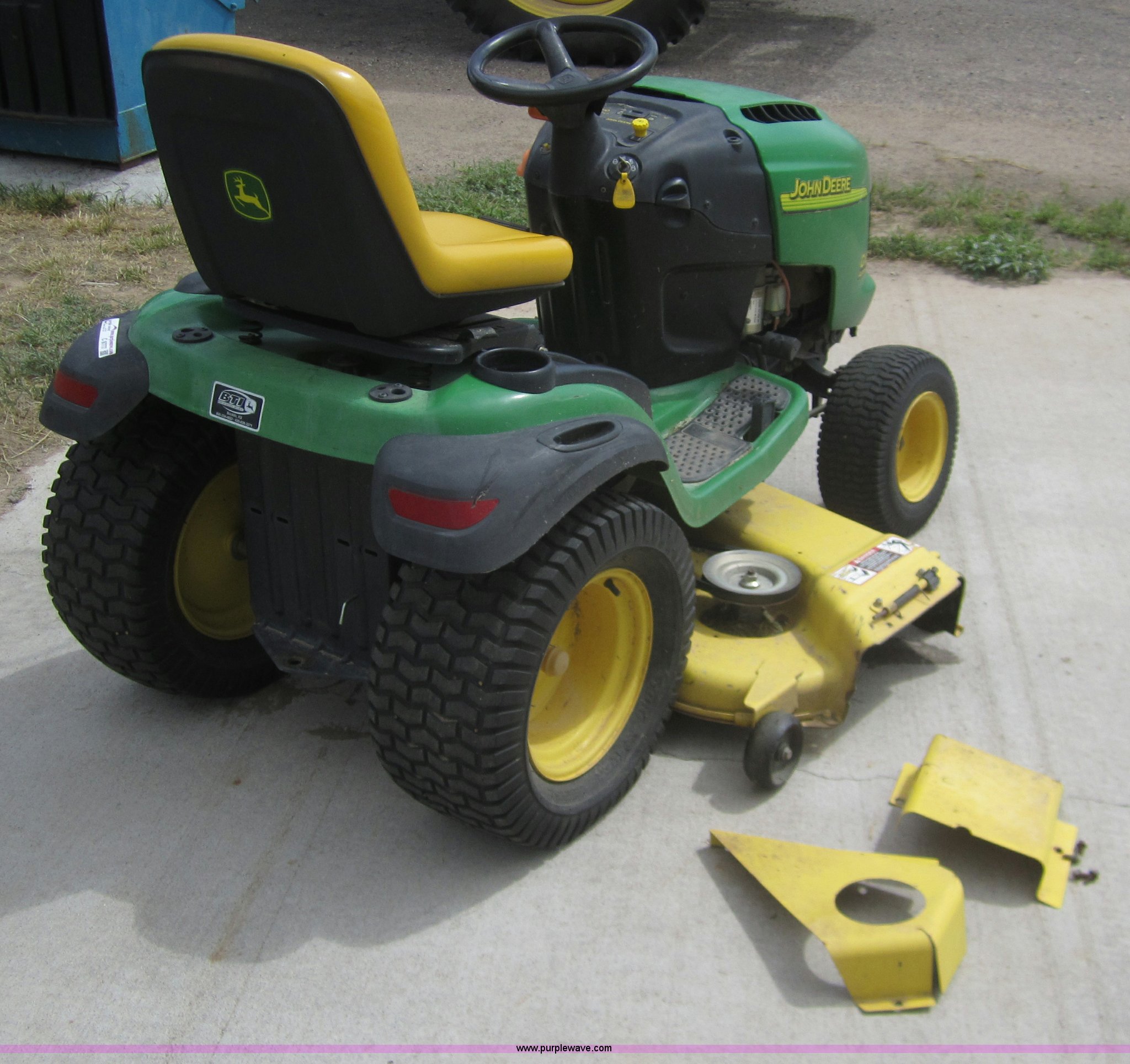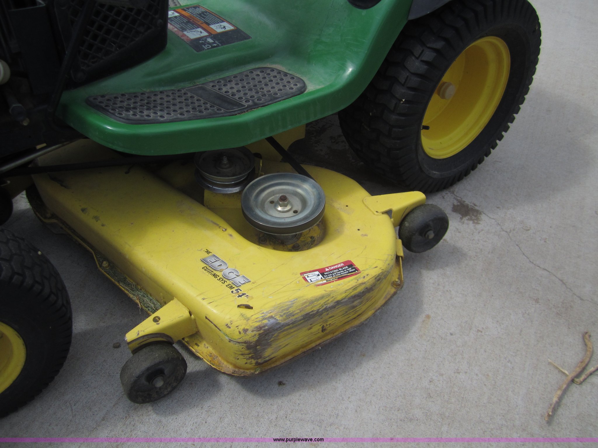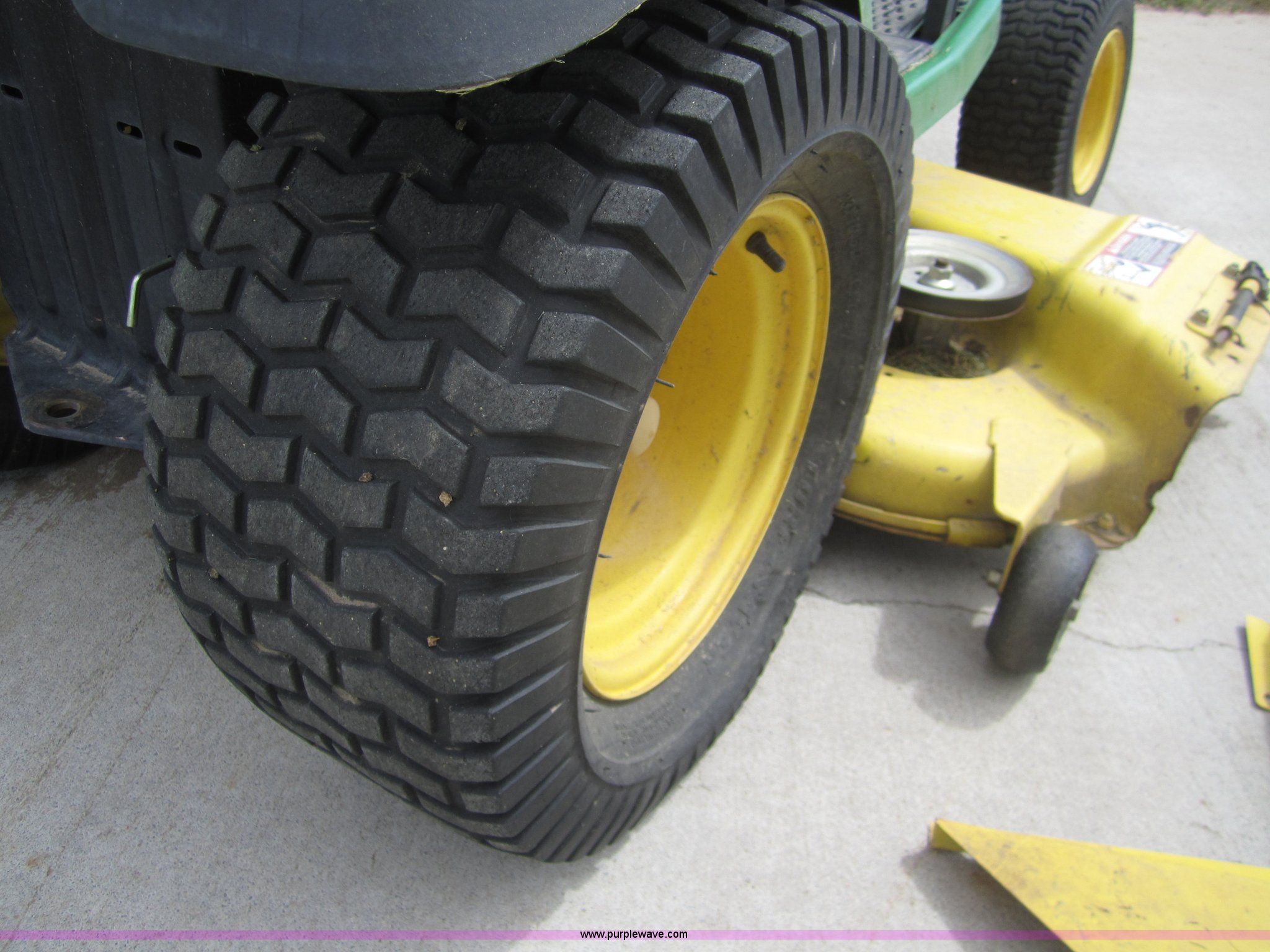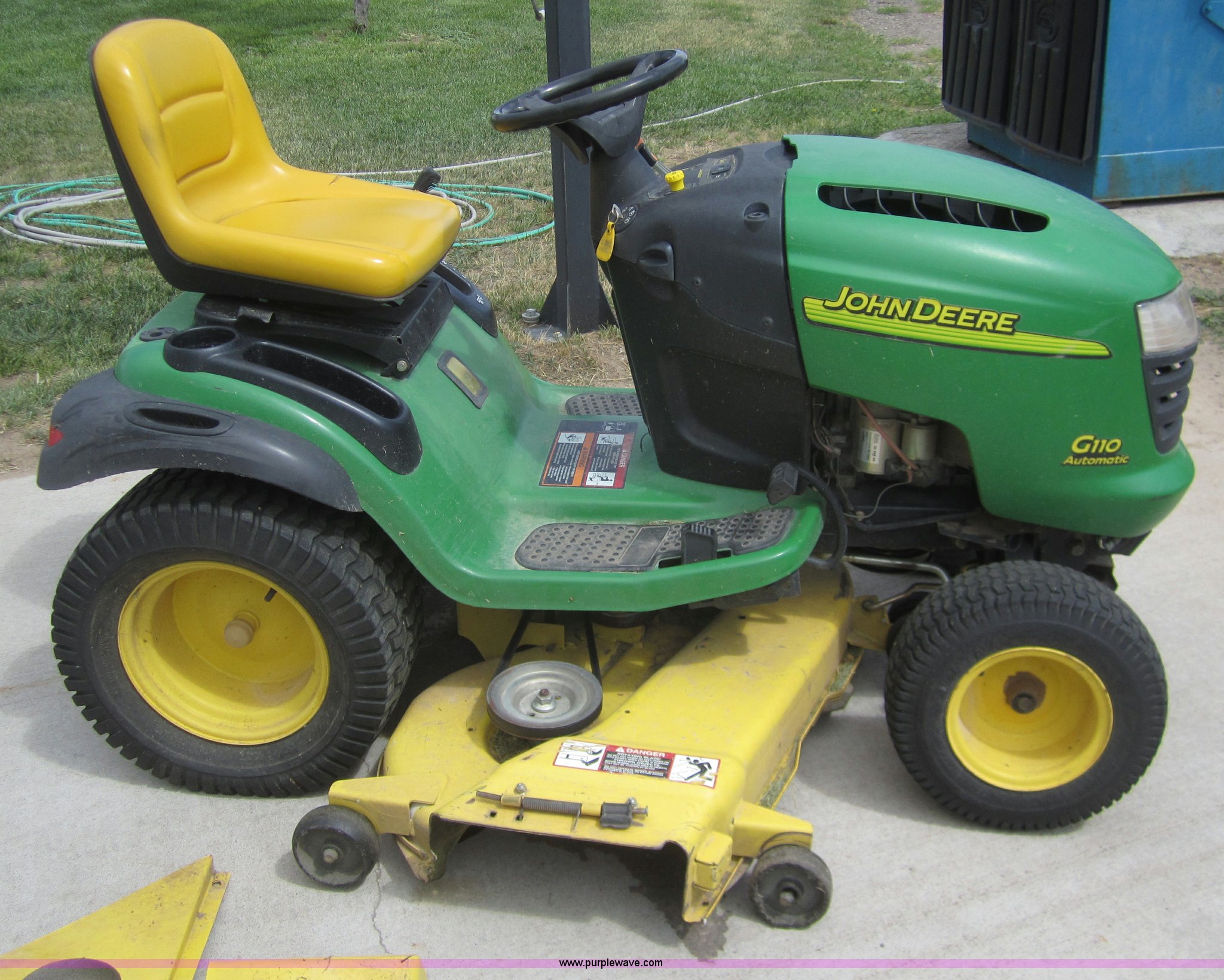 Purple Wave is selling a used Lawn and Garden in Kansas. This item is a John Deere G110 automatic lawn mower with the following: 405 hours on meter, 54" cut, Kohler Command 25 HP engine, 23x10.5 rear tires, 16x6.50 front tires