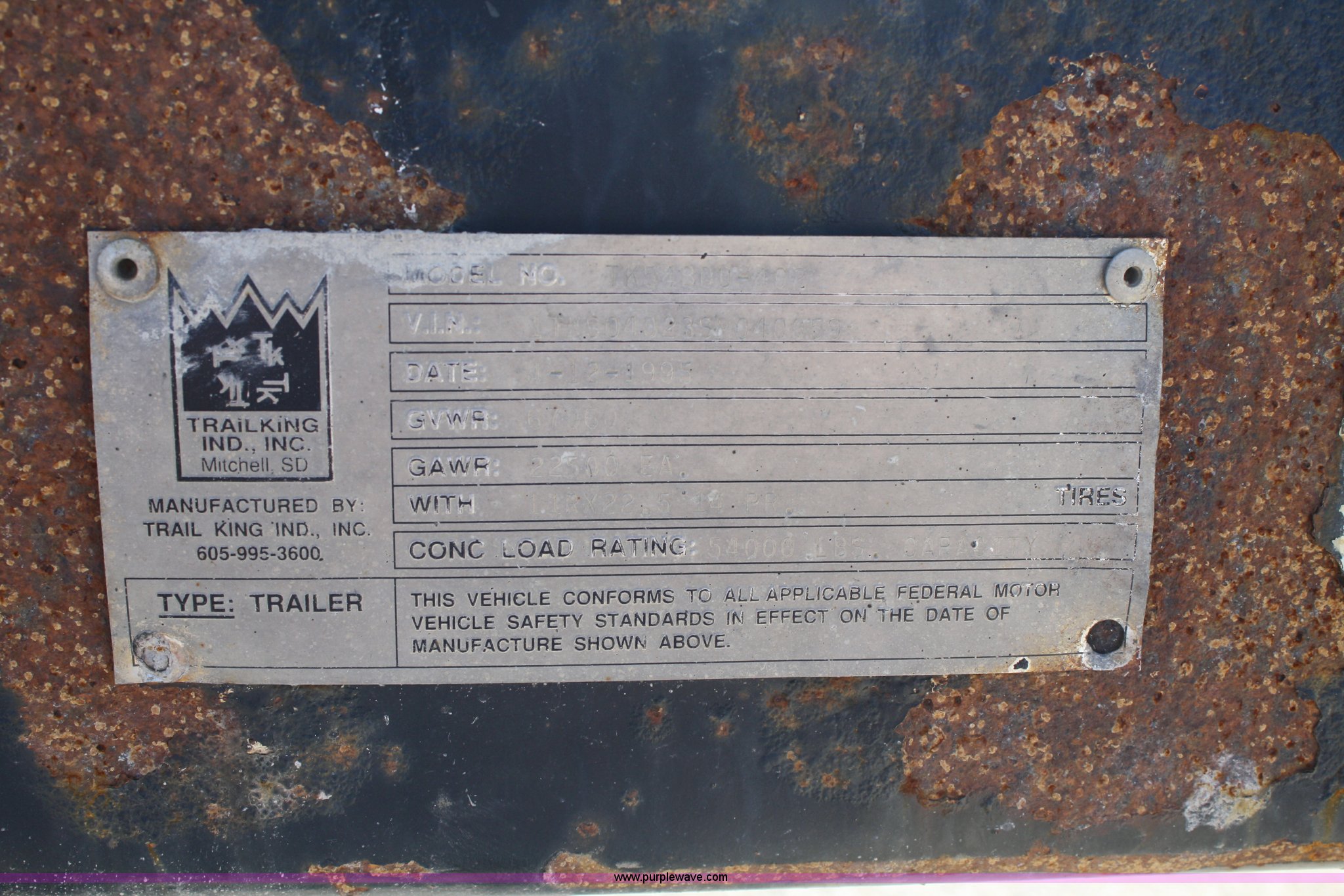 Purple Wave is selling a used Bottom Dump Trailer in Kansas. This item is a 1995 Trail King belly dump trailer with the following: Air operated gates, Electric mesh tarp, Air brakes, Spring suspension, 54,000 lb capacity, GVWR 67,060 lbs, GAWR 22,500 lbs, Model TK54BDV-402