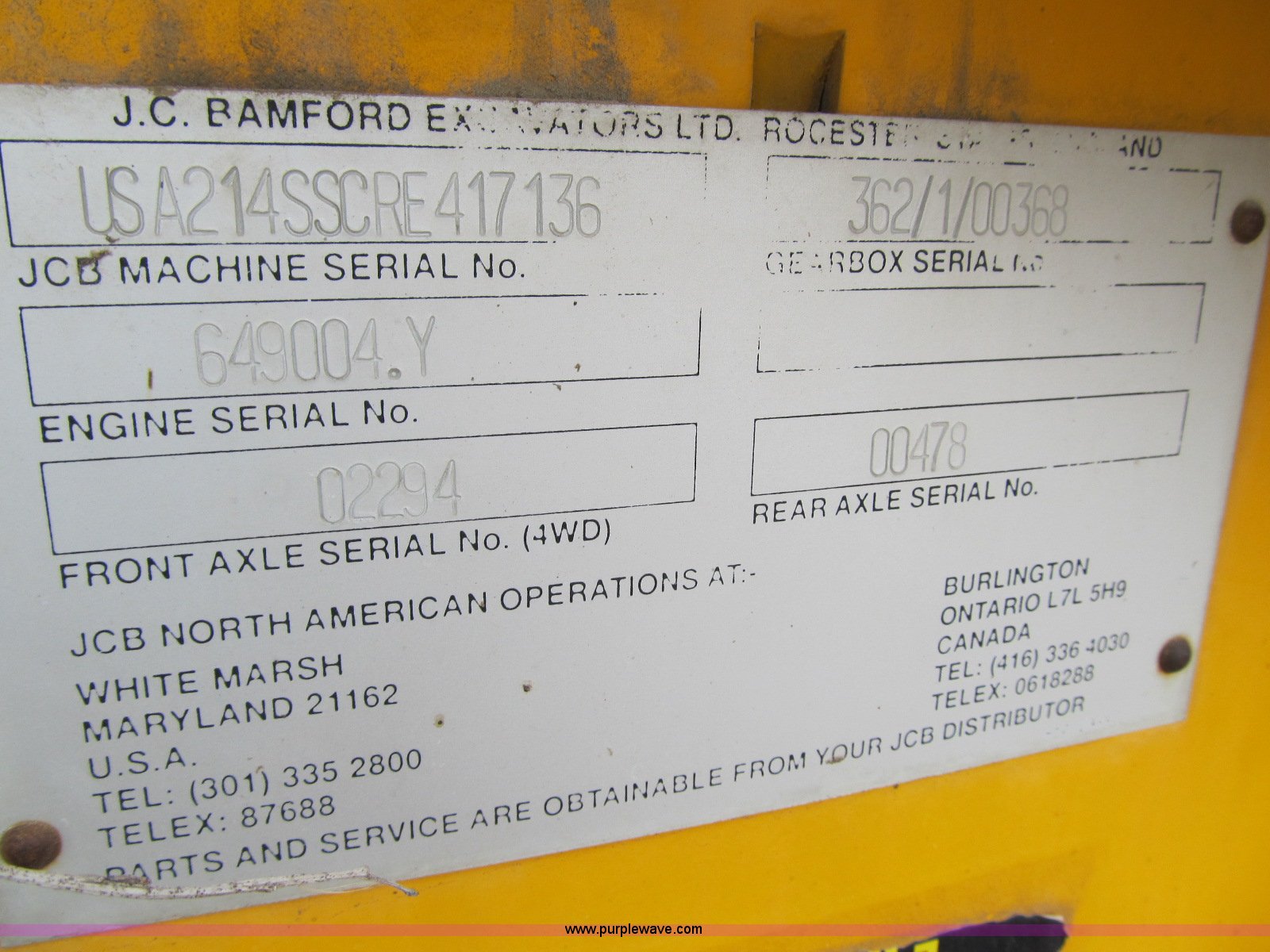Purple Wave is selling a used Tractor Loader Backhoe in Iowa. This item is a 1994 JCB 214S Sitemaster backhoe with the following: 5,521 hours on meter, Perkins 1004THR diesel engine, 92 HP, Serial 649004.Y, Powershift transmission, Four wheel drive, ROPS, 8' front bucket, 2' rear bucket, 169/14-24 tires, 17,444 lbs. base operating weight, Serial USA214SSCRE417136