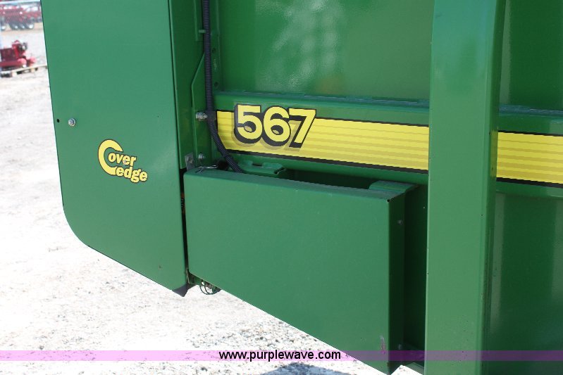 Purple Wave is selling a used Round Baler in Kansas. This item is a John Deere 567 mega wide round baler with the following: Twine or net wrap, 1000 PTO, Hydraulic pickup lift, Hydraulic gate lift, Bale kicker, Rear brake lights and turn signals, 5x6 bale capacity, 31x13.50-15 tires, Includes monitor, Serial E00567X301738