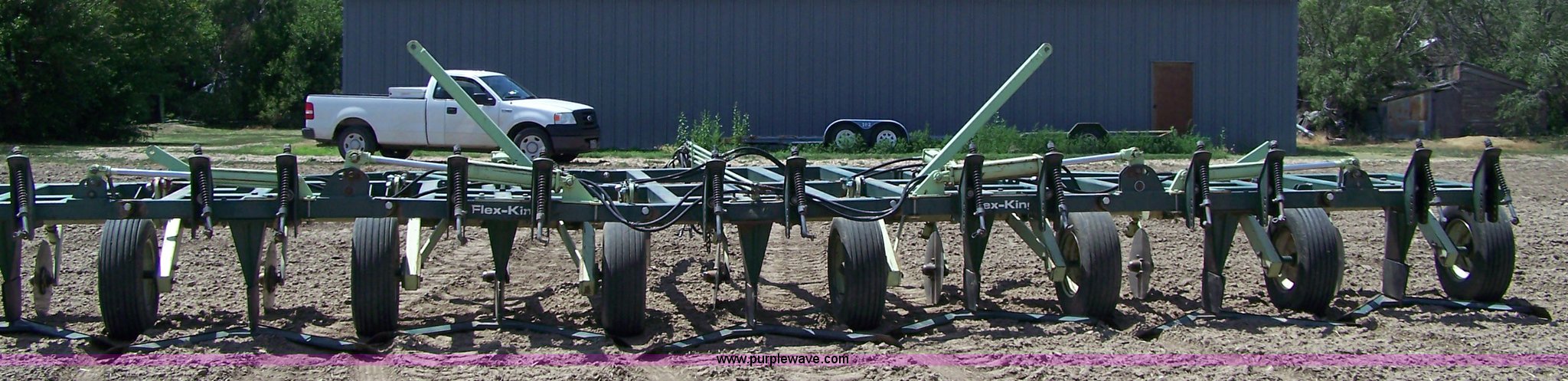Purple Wave is selling a used Field Cultivator or Sweep Plow in Kansas. This item is a Flex King K7M 33 7x5 sweep plow with the following: Hinge kit, Sunflower pickers included, Stored inside, 9.5L-15SL flotation tires, Serial 005749