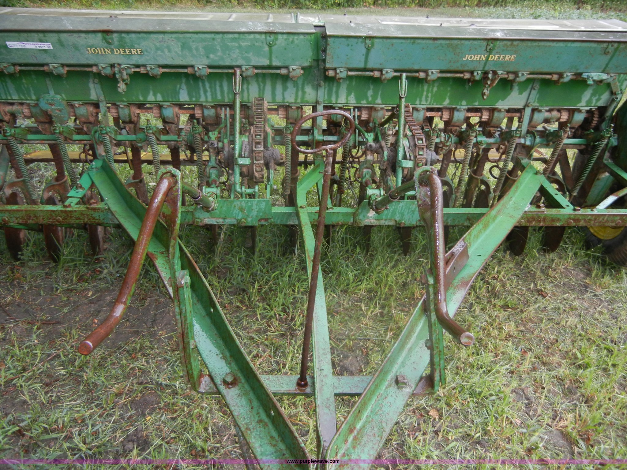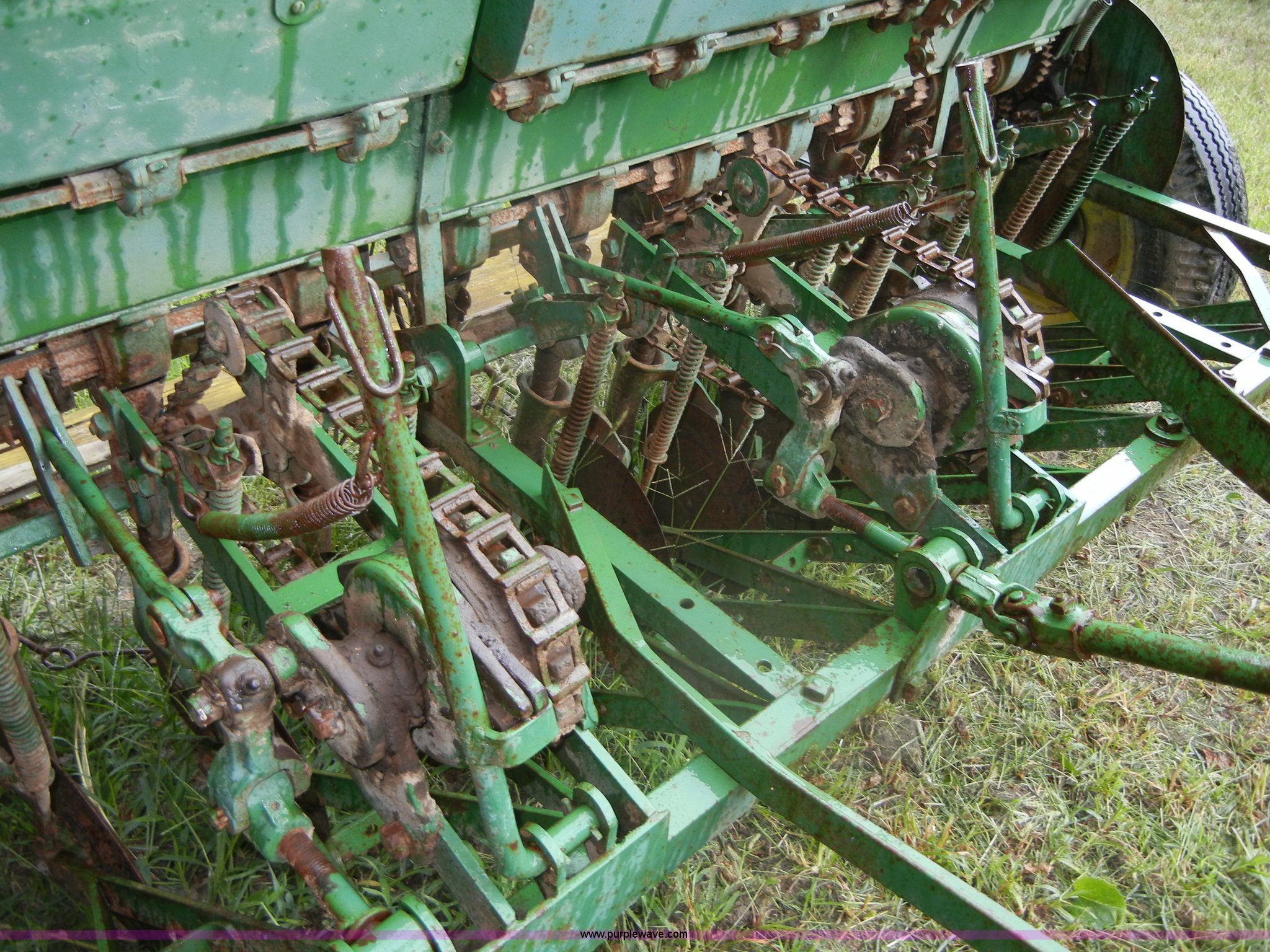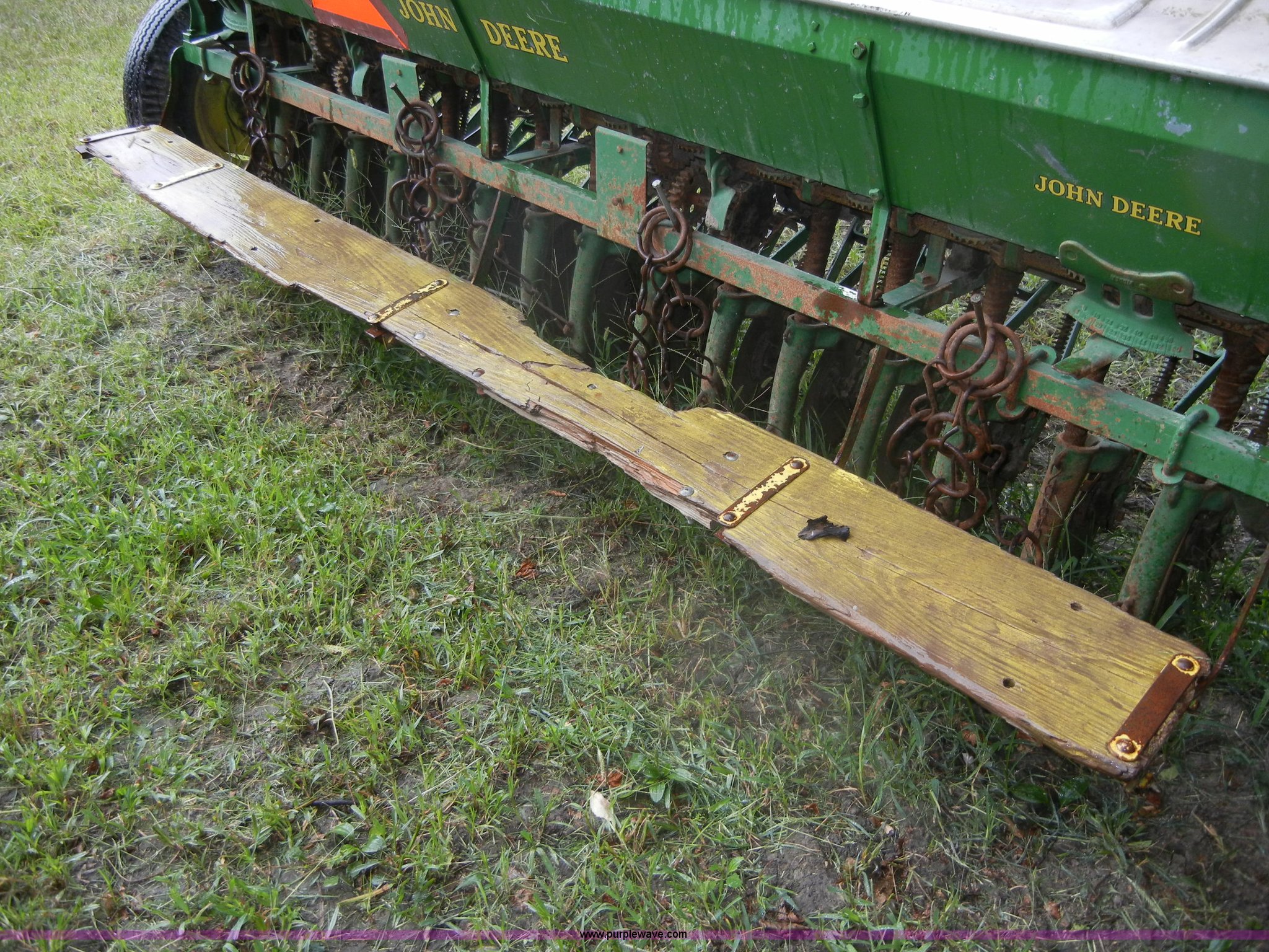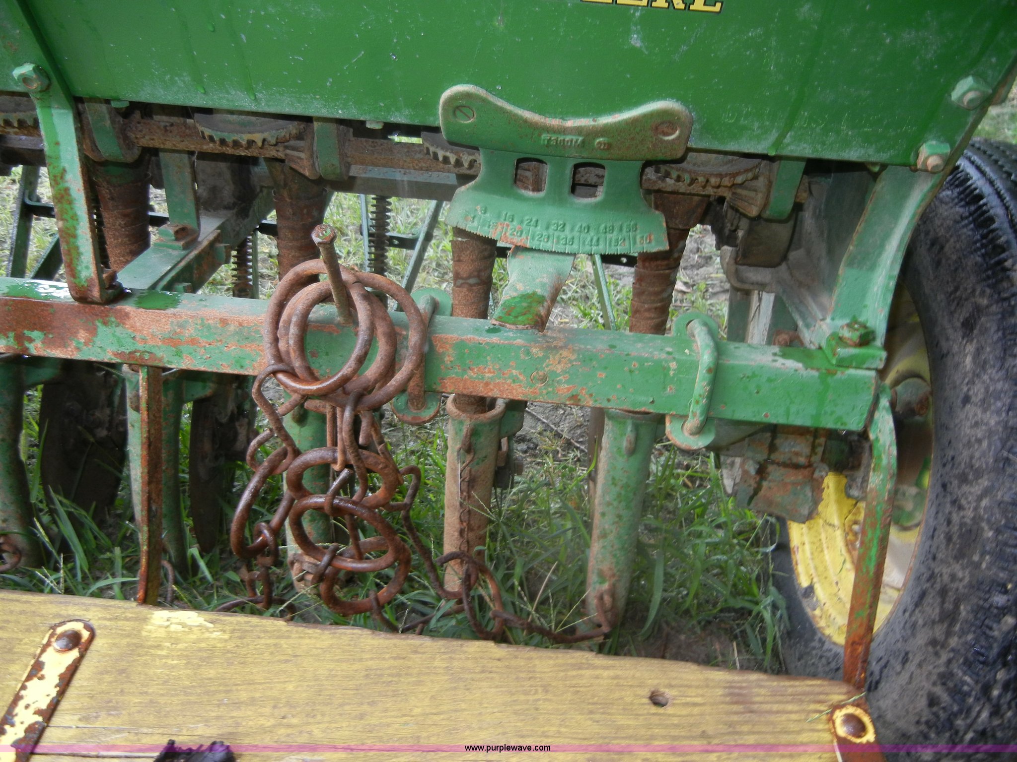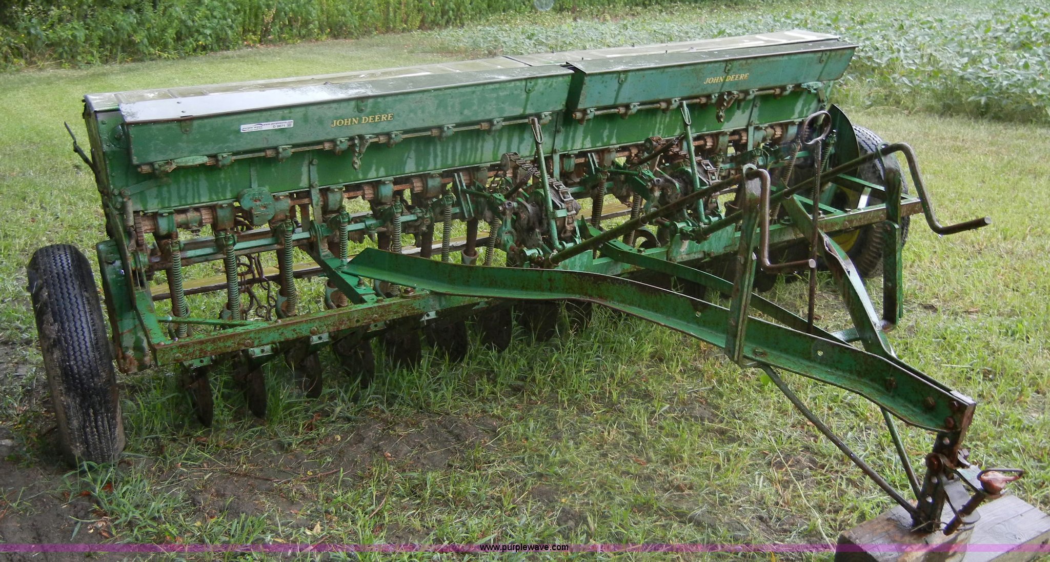 Purple Wave is selling a used Grain Drill or Seeder in Kansas. This item is a John Deere FB grain drill with grass seed boxes with the following: 110"L, 15 hole with 7" spacing, Chain driven, Pin hitch, 6.50-16 tires