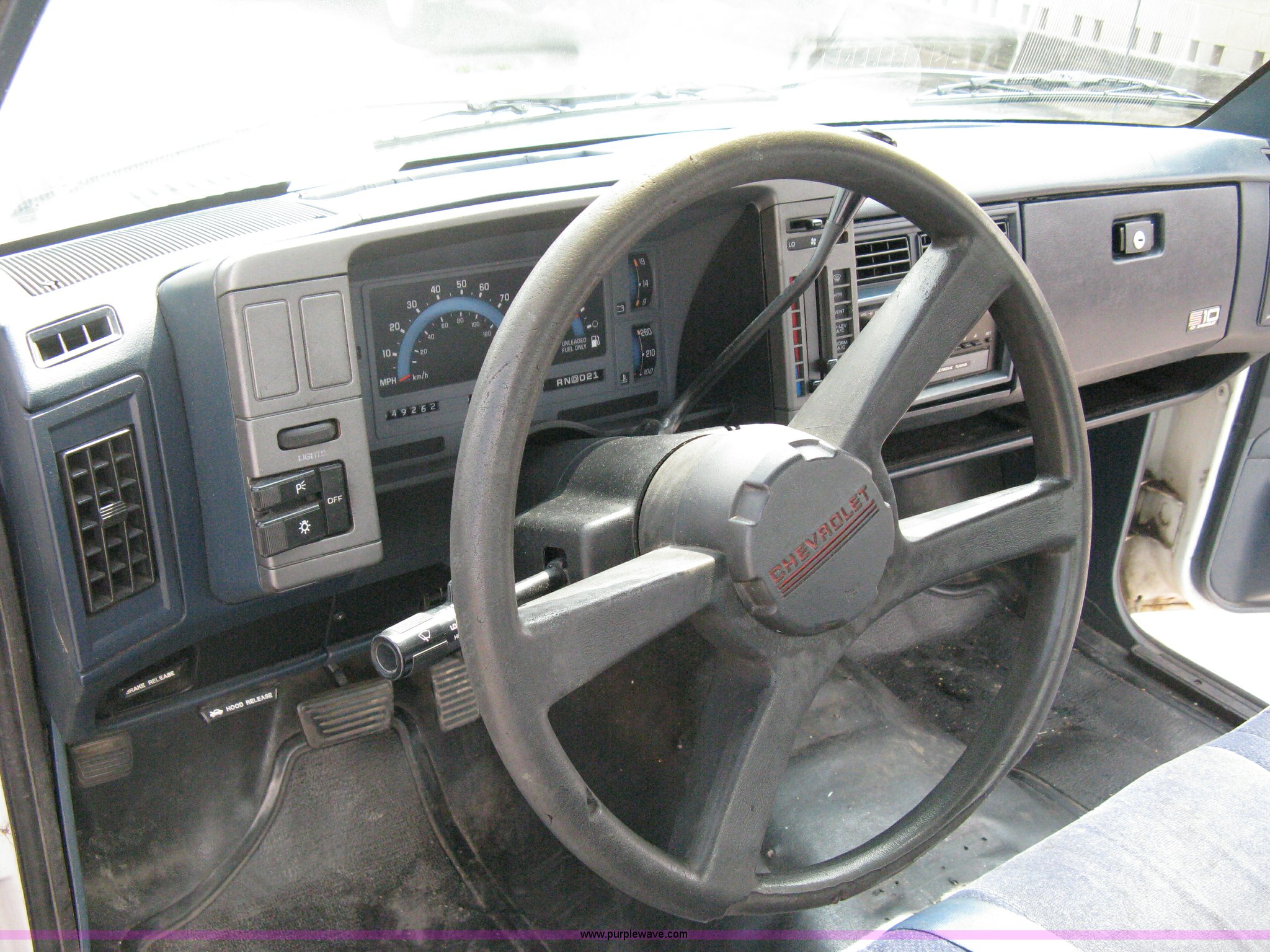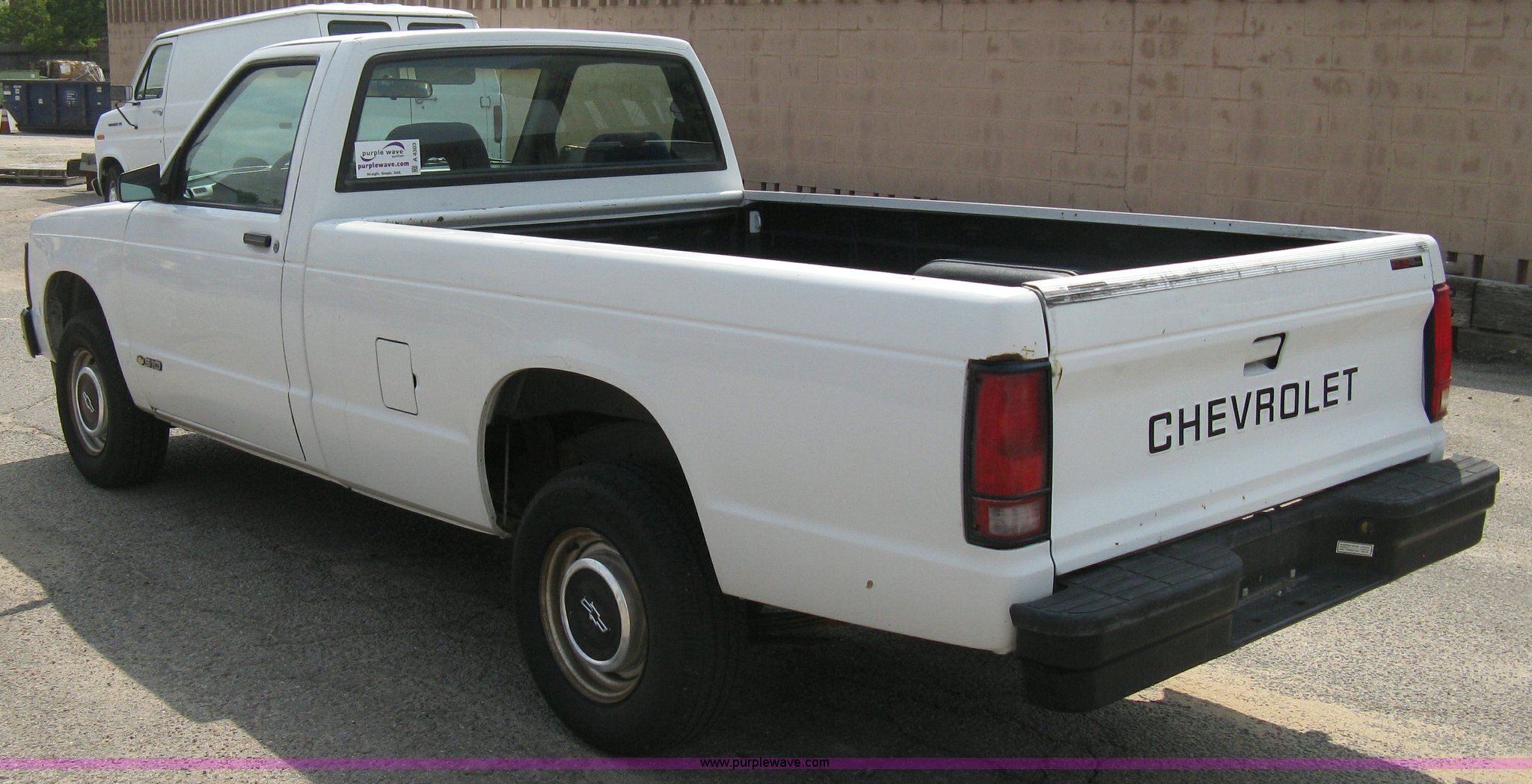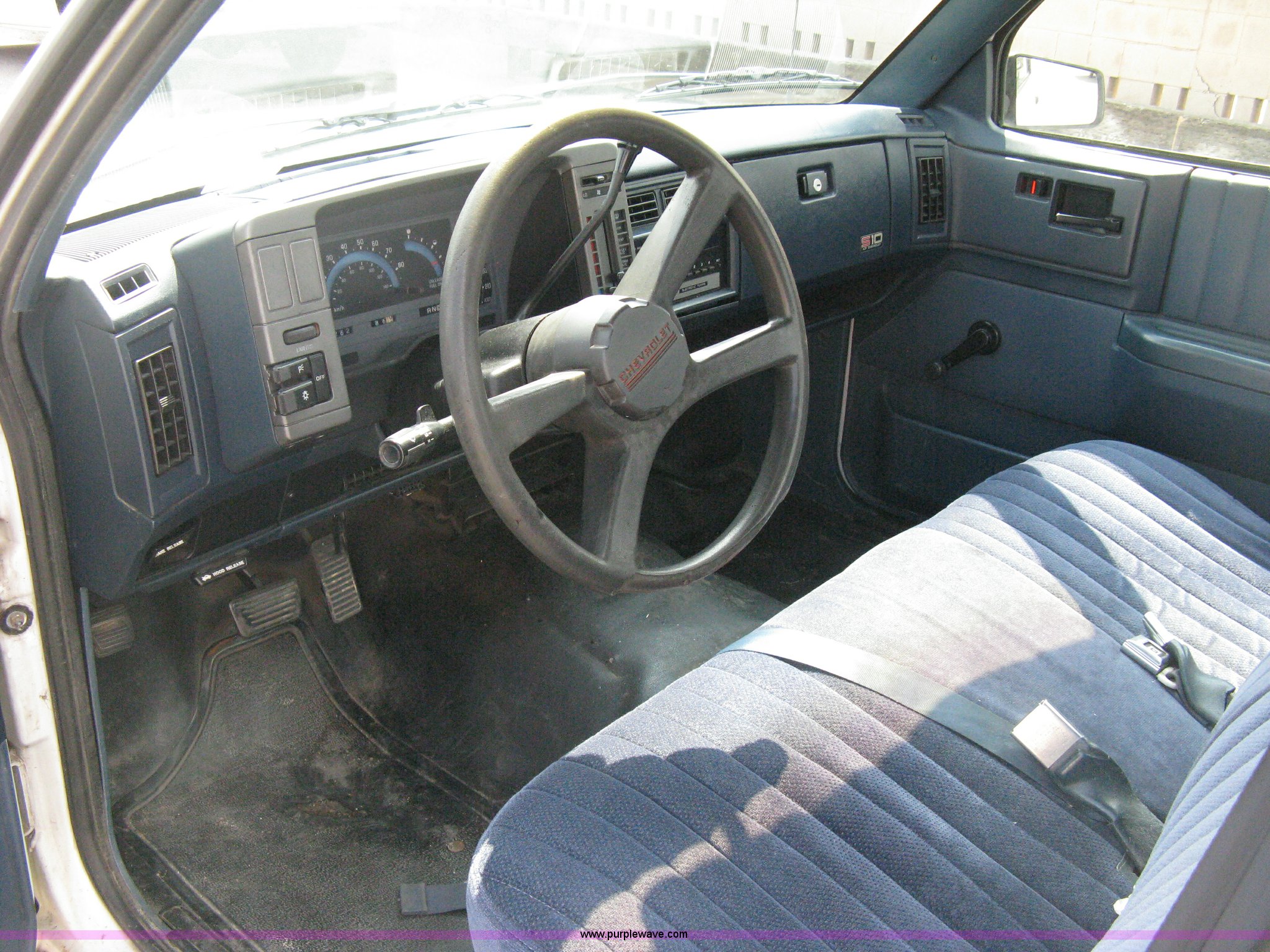 Purple Wave is selling a used Passenger Vehicle in Kansas. This item is a 1993 Chevrolet S10 pickup truck with the following: 49,262 miles on odometer, 4.3L V6 TBI engine, Automatic transmission, AC and heat, AM/FM, Manual windows and locks, Bench seat, Recently replaced head liner, Plastic bed liner, P205/75R14 tires, Spare tire