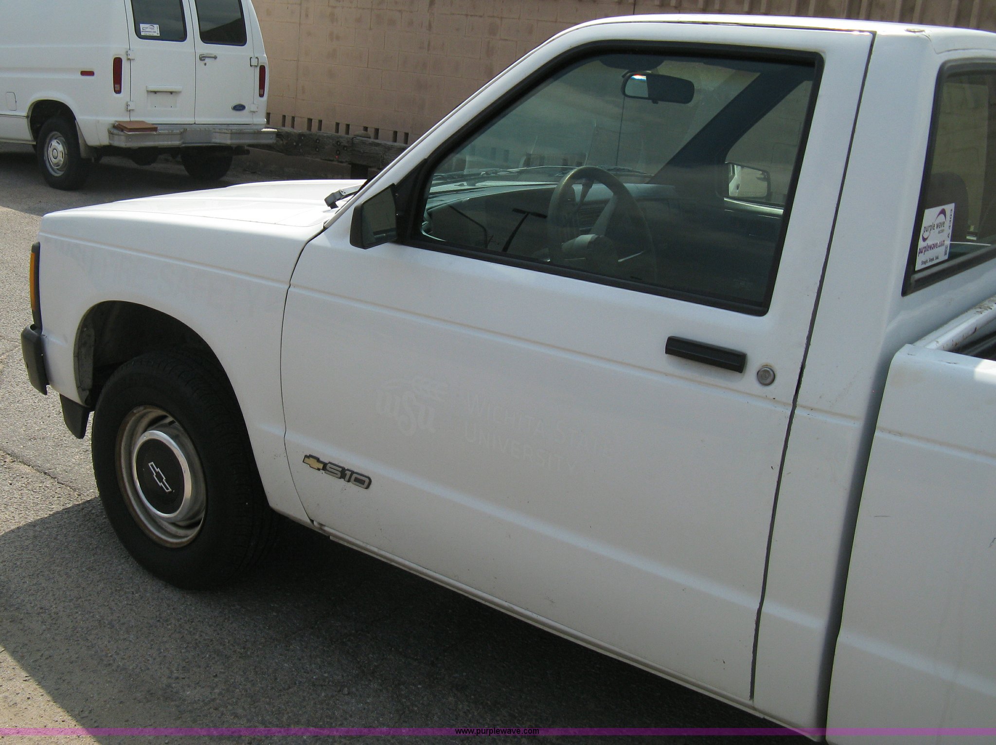 1993 Chevrolet S10 pickup truck. 49,262 miles on odometer, 4.3L V6 TBI engine, Automatic transmission, AC and heat, AM/FM, Manual windows and locks, Bench seat, Recently replaced head liner, Plastic bed liner, P205/75R14 tires, Spare tire. 1GCCS14Z4P0173875. Shipping quotes available. WSU Physical Plant. 1845 Fairmount St. Wichita, KS 67260
