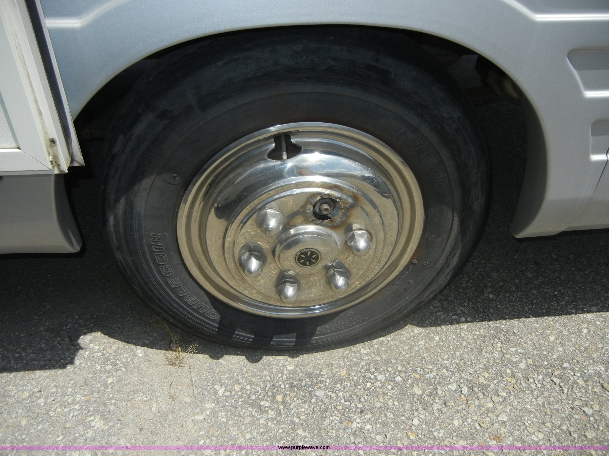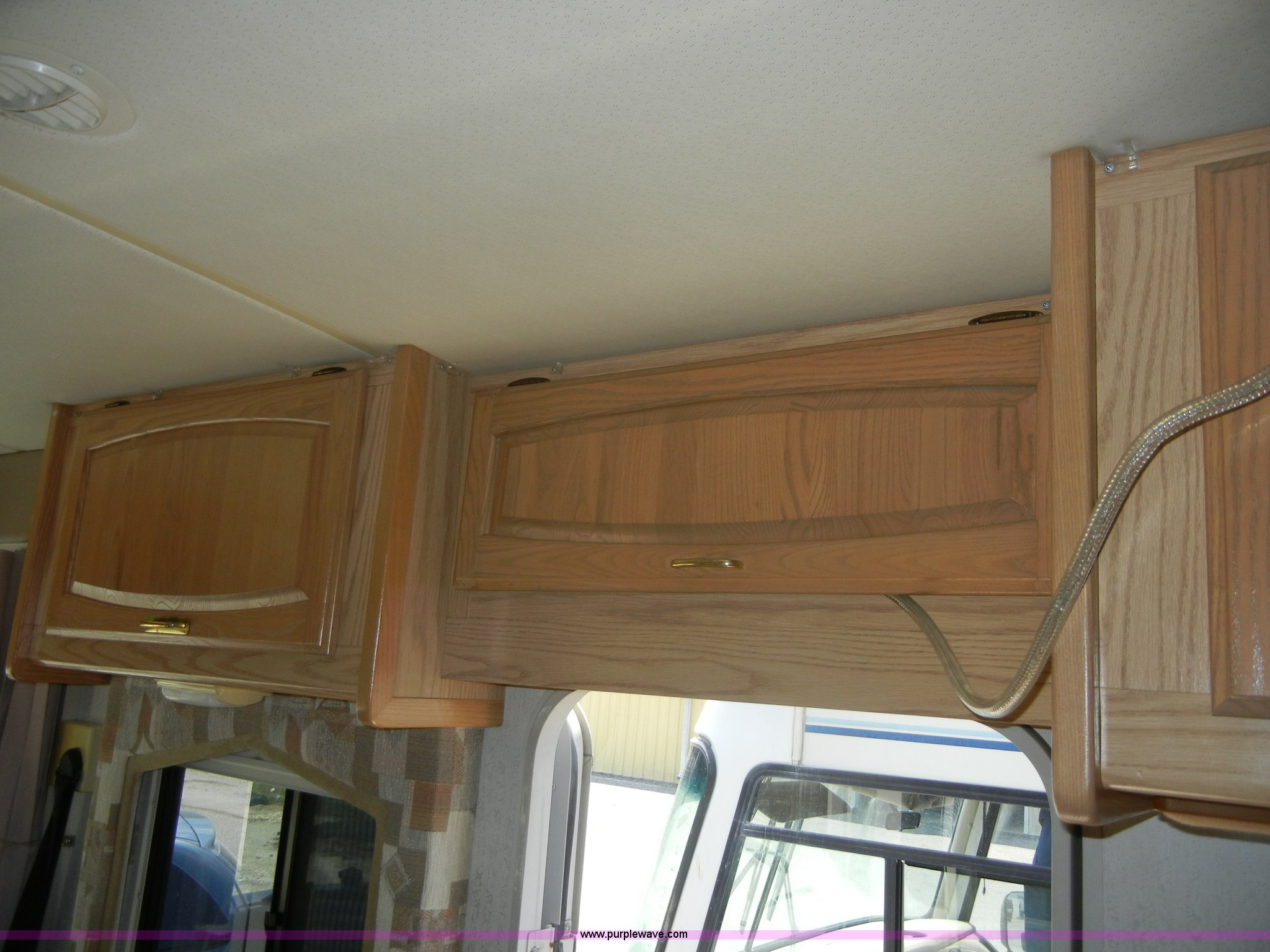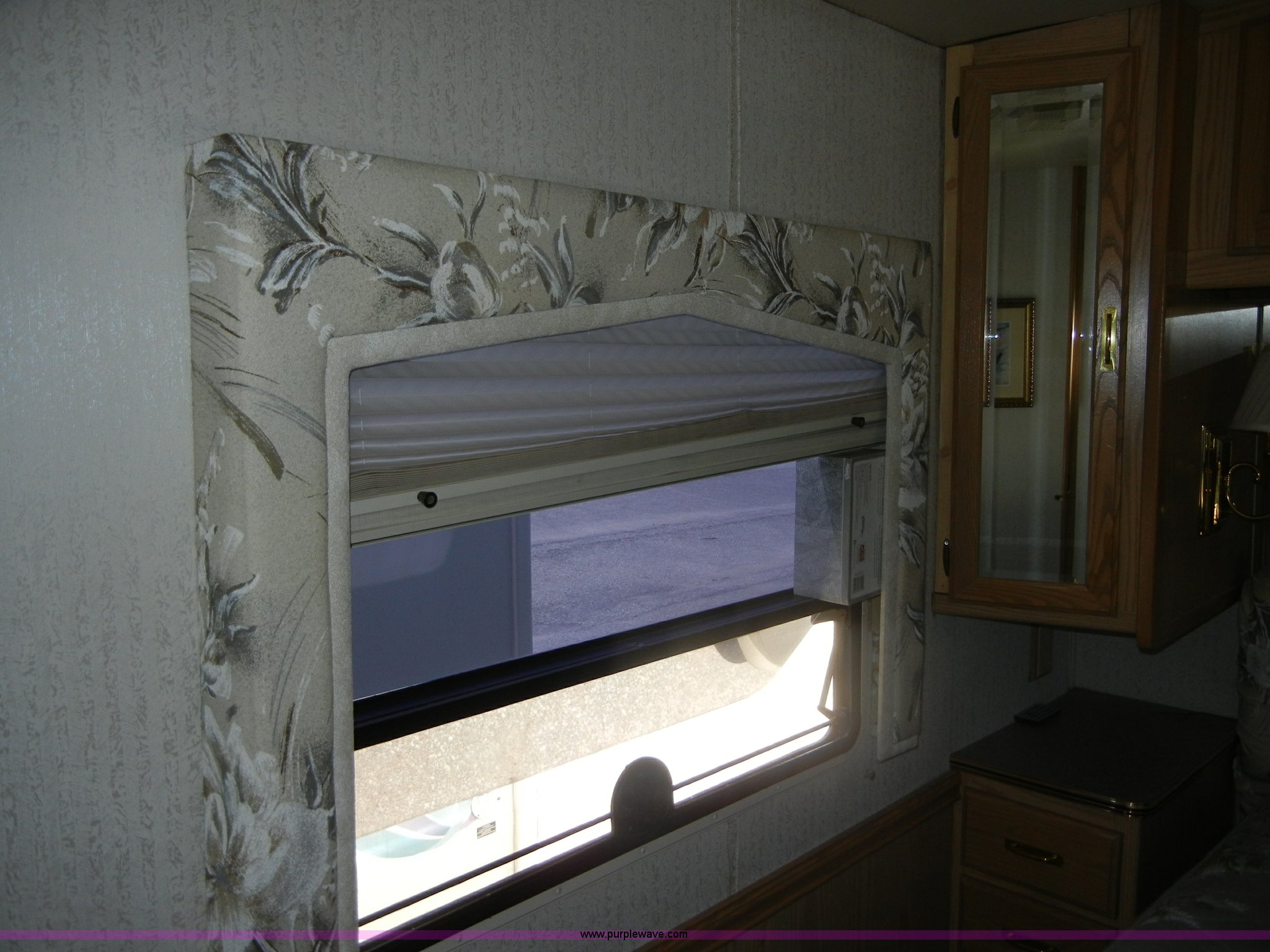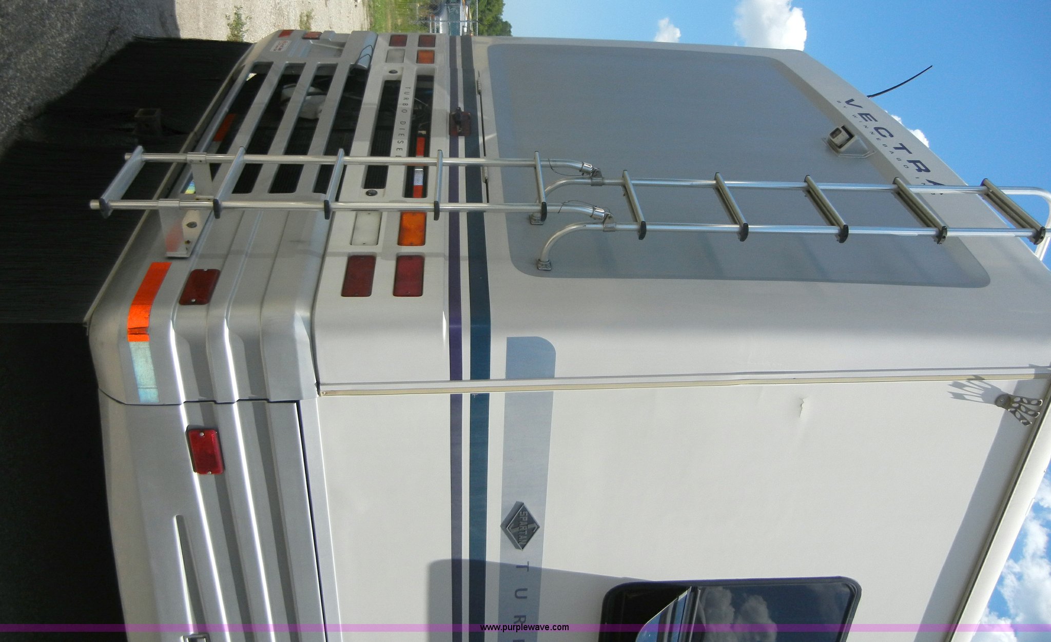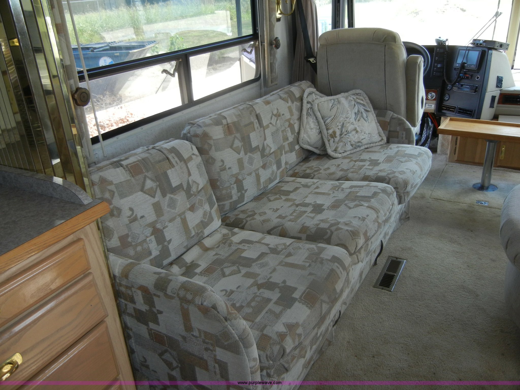 Purple Wave is selling a used RV in Kansas. This item is a 1994 Spartan Vectra Winnebago motor home with the following: 63,498 miles on odometer, Cummins 5.9L diesel engine, Automatic transmission, Push button unit, no gear shift, AC and heat, AM/FM/Cassette, Power windows, locks, and mirrors, Cloth captain chairs, CB unit, Bedroom, Bed, VCR, storage, Bathroom, Shower, toilet, sink, closets, Kitchen, Fridge/freezer, sink, stove, microwave, table with two chairs, Living room, Couch, chair, 26" LED color TV, storage, Awning, LP gas system, Hot water heater, Exterior stereo unit, Sewage outlet, Computerized leveling units, Receiver hitch, Trailer wiring, 8R19.5 tires, GVWR 20,500 lbs, FAWR 7,000 lbs, RAWR 13,500 lbs, Model WSM35RQ, Type MPV, Dead battery, Kitchen wood flooring needs repaired, Serial 80M824228150
