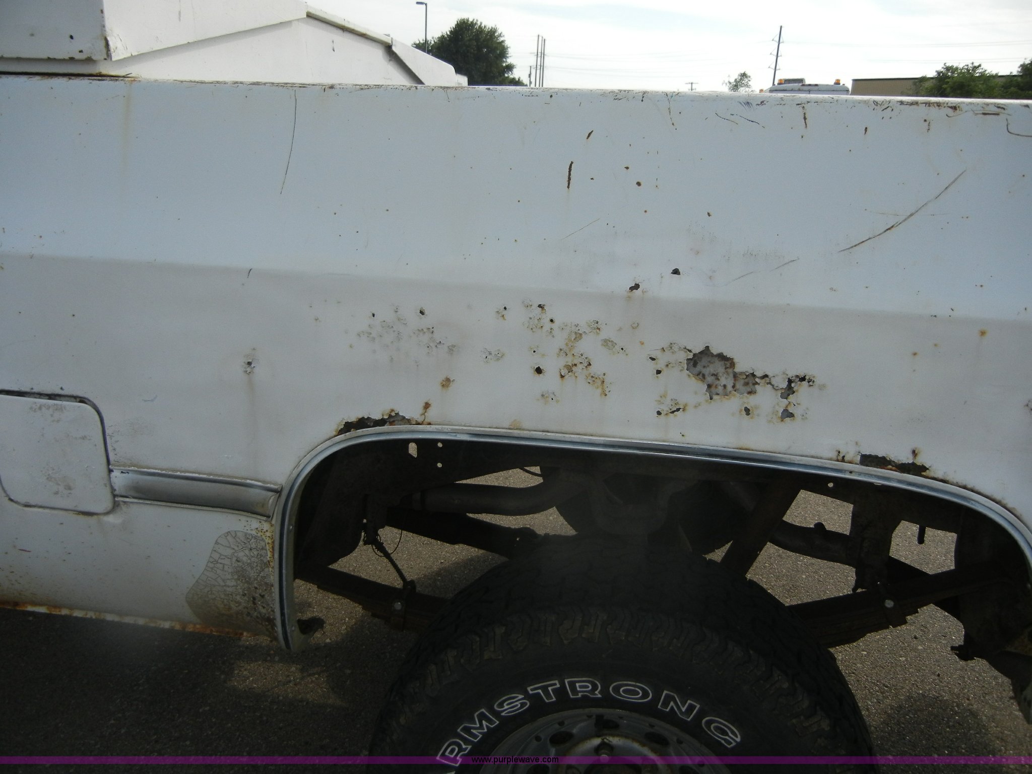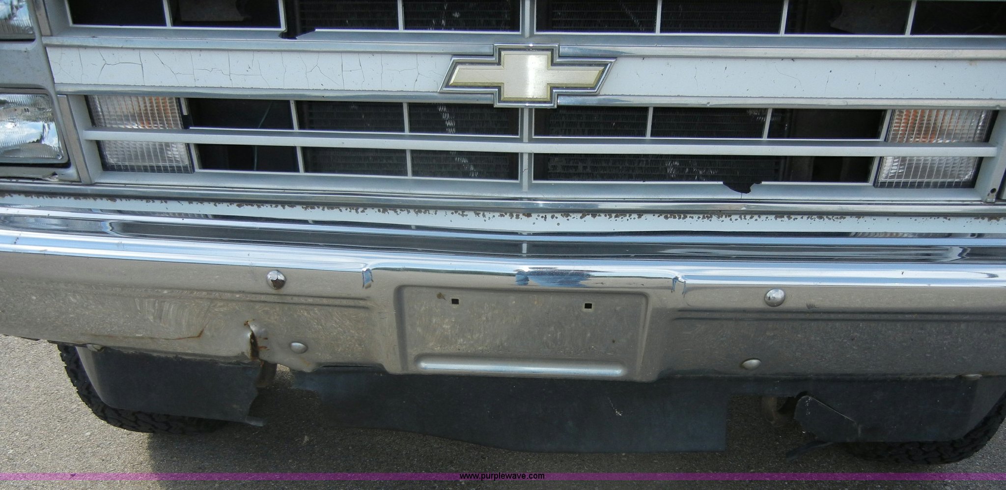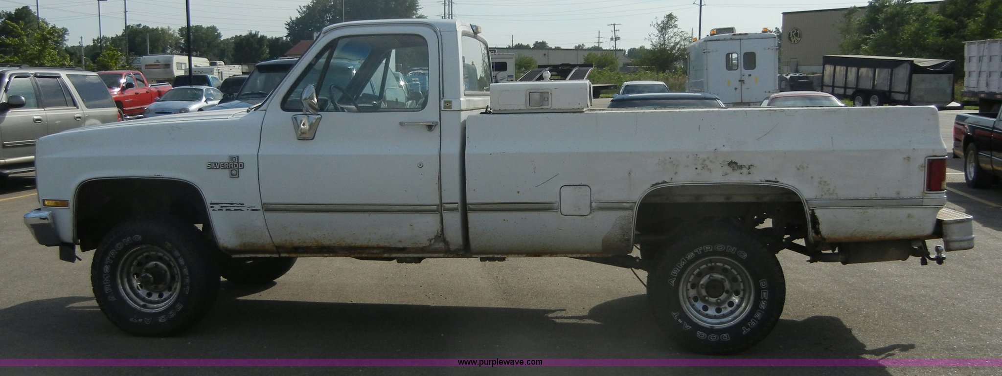 Purple Wave is selling a used Passenger Vehicle in Kansas. This item is a 1987 Chevrolet Silverado 10 pickup truck with the following: 28,595 miles on odometer, 5.0L V8 TBI engine, Automatic transmission, Four wheel drive, AC and heat, Tilt, Manual windows and locks, Vinyl bench seat with cover, Toolbox with ball attached, Receiver hitch, Trailer wiring, 31x10.50R15 tires, Cracked windshield, Cracked dash, Interior/exterior cosmetic damage, Rust, Stereo missing