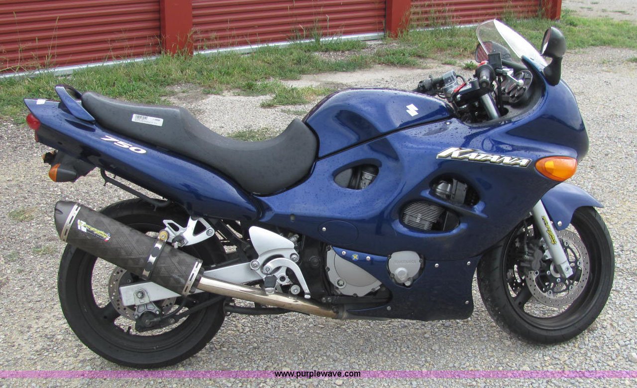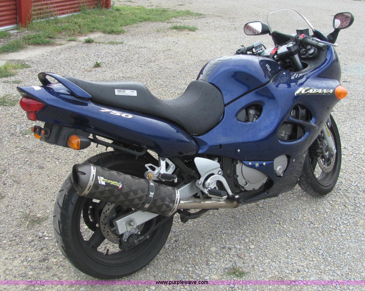 Purple Wave is selling a used Motorcycle in Kansas. This item is a 2004 Suzuki Katana 750 motorcycle with the following: 2,015 miles on odometer, 750cc engine, Two brothers exhaust, Suzuki Performance Series jacket, 3XL, Icon helmet, XL