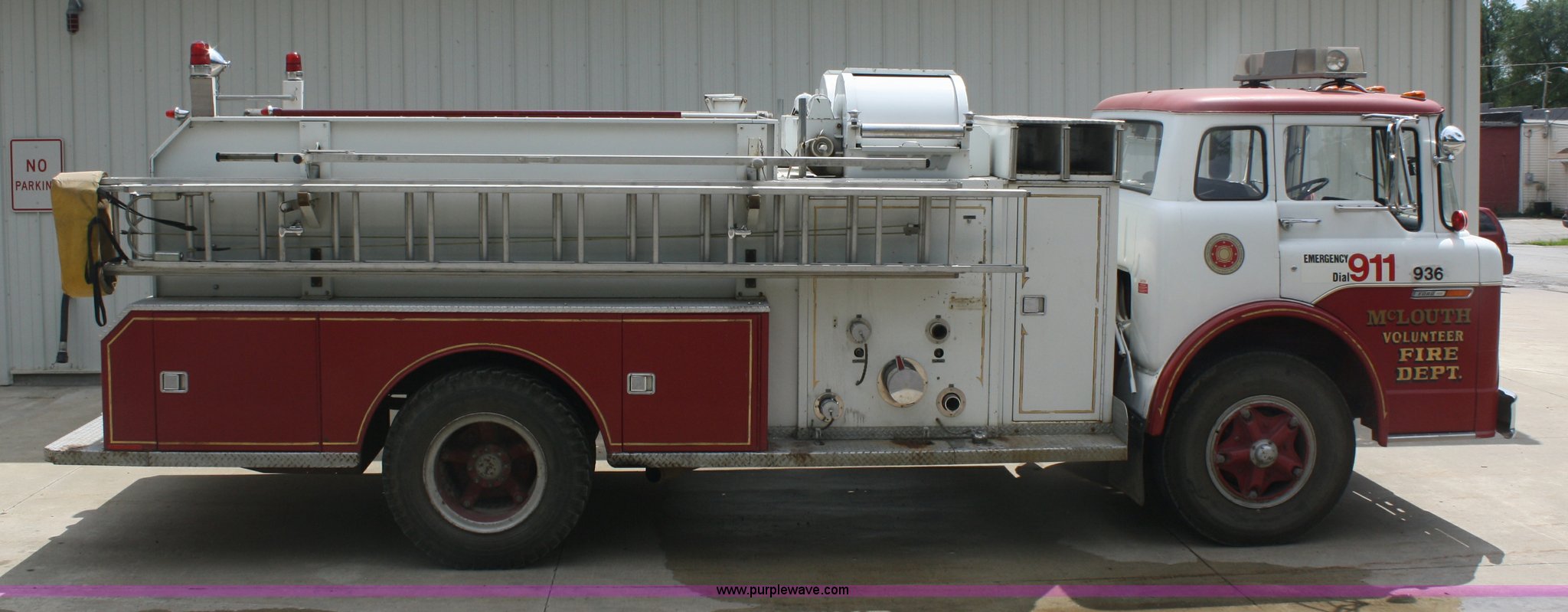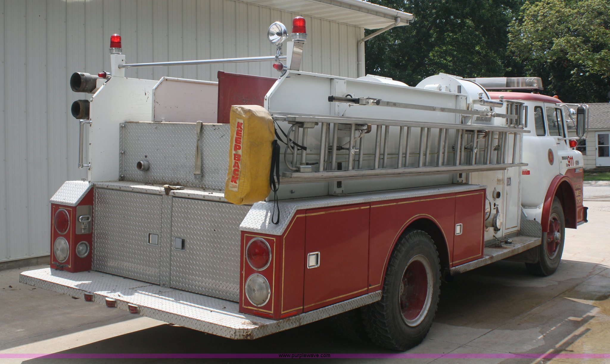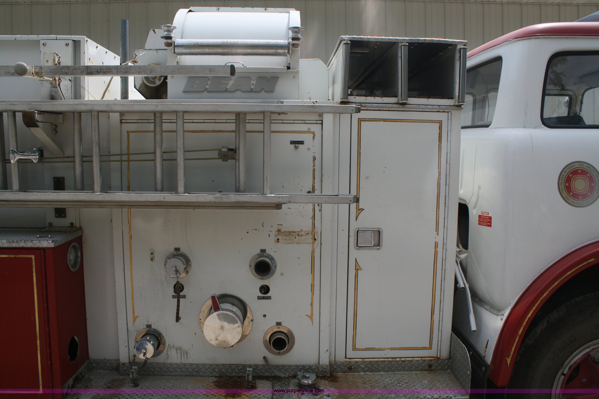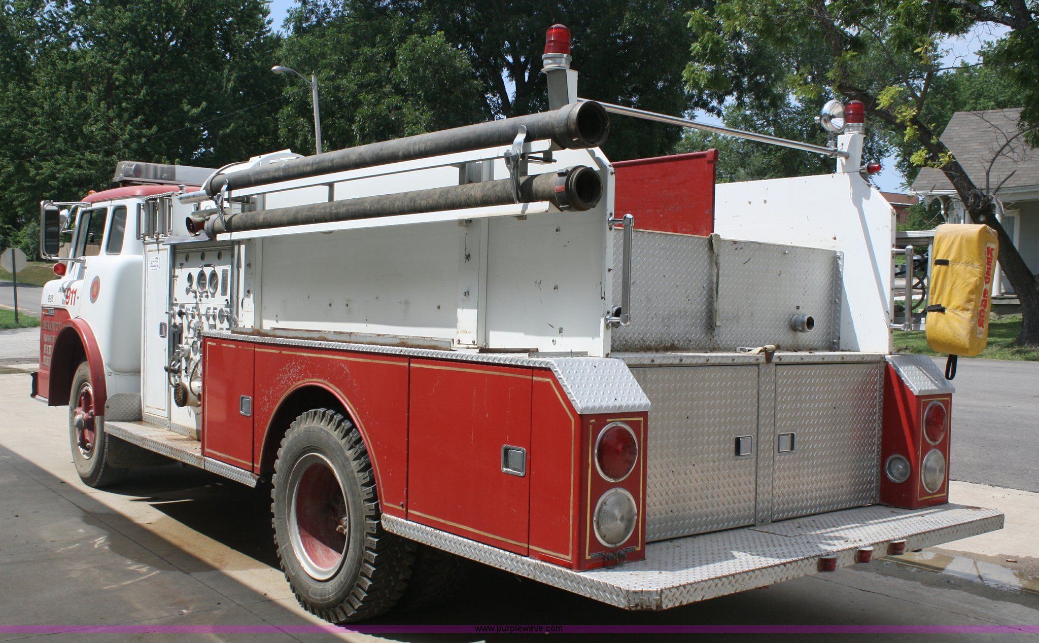 Purple Wave is selling a used Fire Truck or Emergency Vehicle in Kansas. This item is a 1975 Ford Bean fire truck with the following: 19,268 miles on odometer, 535 V8 gas engine, Approx. 150 miles on engine, Runs rough, Five speed manual transmission, Micro-lok brake system, 1.5 KW gas generator, (3) spotlights, (2) front, one rear, Federal signal light bar, Sonic siren with controller, 1,000 gpm Hale pump, 750 gallon tank, Water outlets, (2) 2.5" rear, (2) 2.5" passenger side, (2) 2.5" driver side, Water intakes, 5" passenger side, (2) 2.5" passenger side, 5" and 2.5" driver side, (2) 1" hose reels with hose and nozzle, 24' extension ladder, 14' roof ladder, 10' attic ladder, (2) 5" x 10' section hoses, 9.00-20 tires, One battery missing