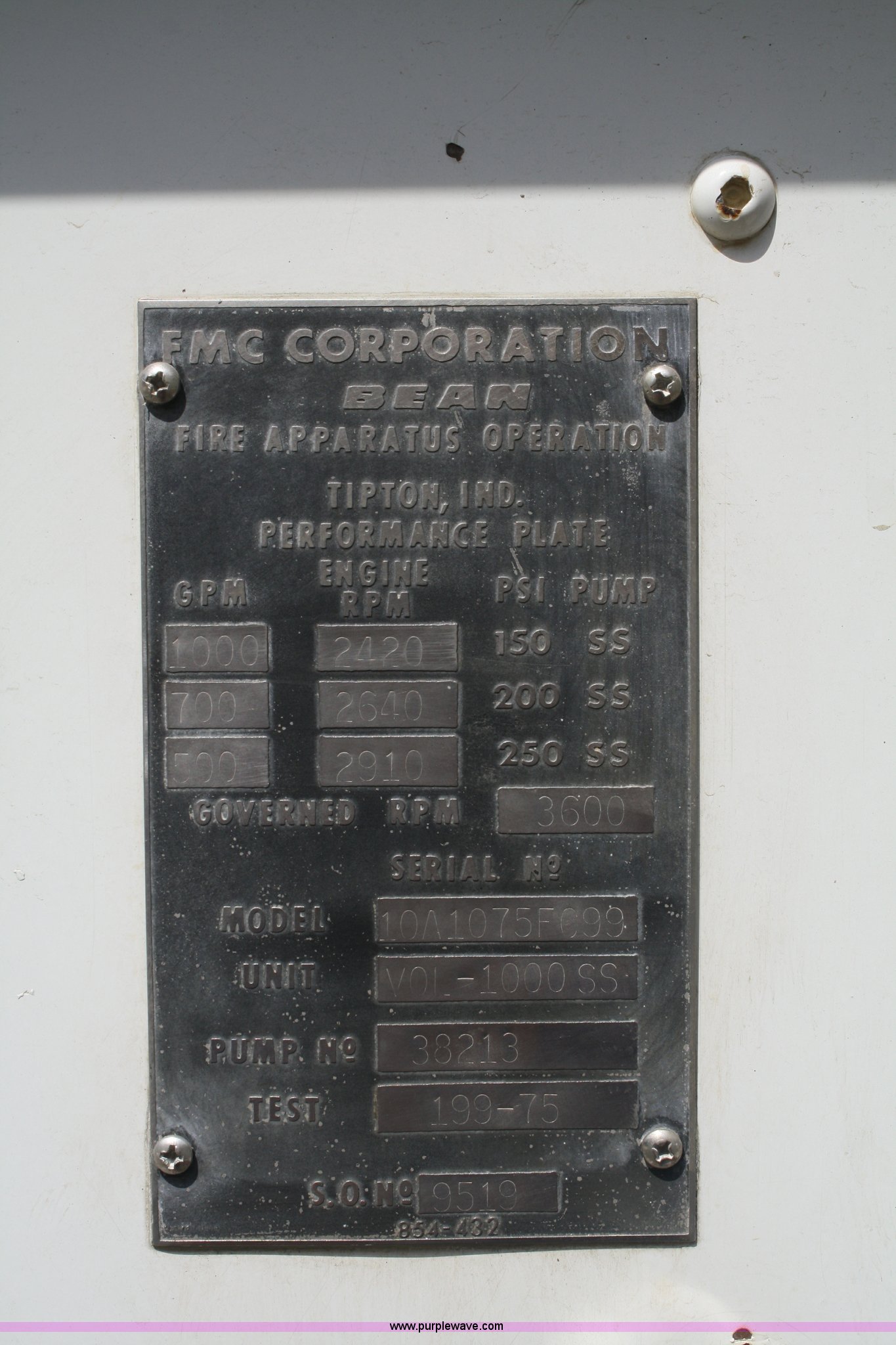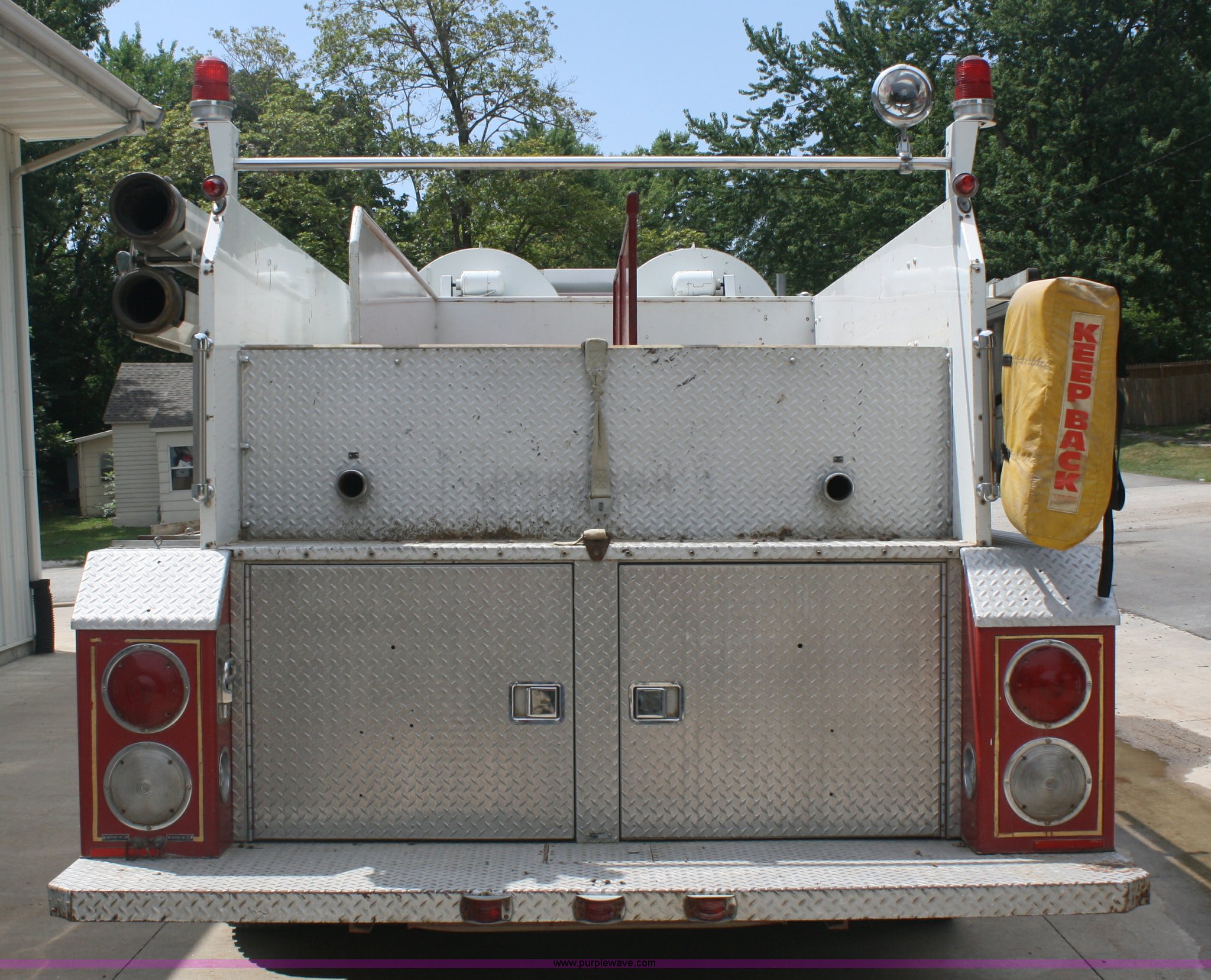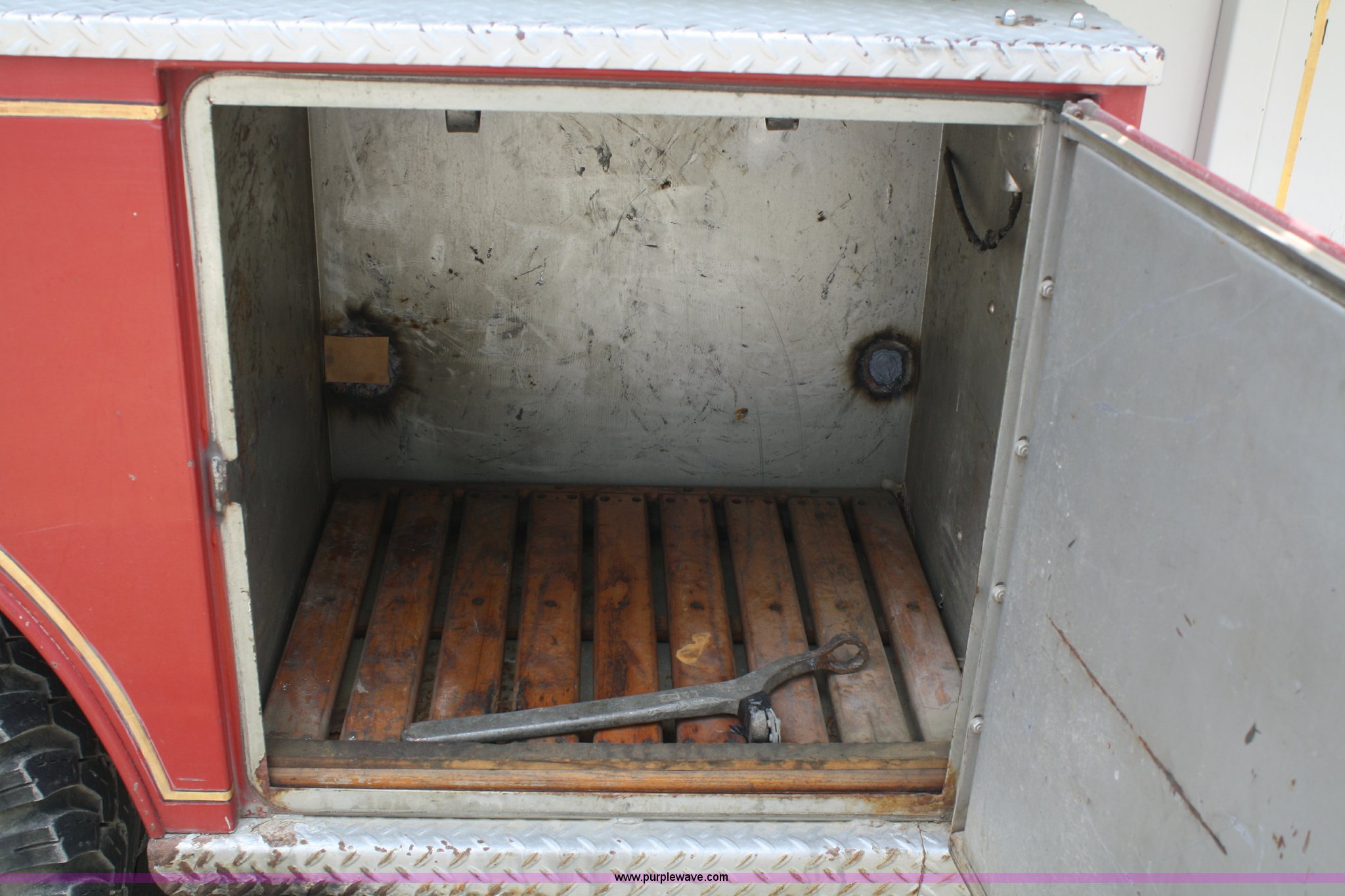 Purple Wave is selling a used Fire Truck or Emergency Vehicle in Kansas. This item is a 1975 Ford Bean fire truck with the following: 19,268 miles on odometer, 535 V8 gas engine, Approx. 150 miles on engine, Runs rough, Five speed manual transmission, Micro-lok brake system, 1.5 KW gas generator, (3) spotlights, (2) front, one rear, Federal signal light bar, Sonic siren with controller, 1,000 gpm Hale pump, 750 gallon tank, Water outlets, (2) 2.5" rear, (2) 2.5" passenger side, (2) 2.5" driver side, Water intakes, 5" passenger side, (2) 2.5" passenger side, 5" and 2.5" driver side, (2) 1" hose reels with hose and nozzle, 24' extension ladder, 14' roof ladder, 10' attic ladder, (2) 5" x 10' section hoses, 9.00-20 tires, One battery missing