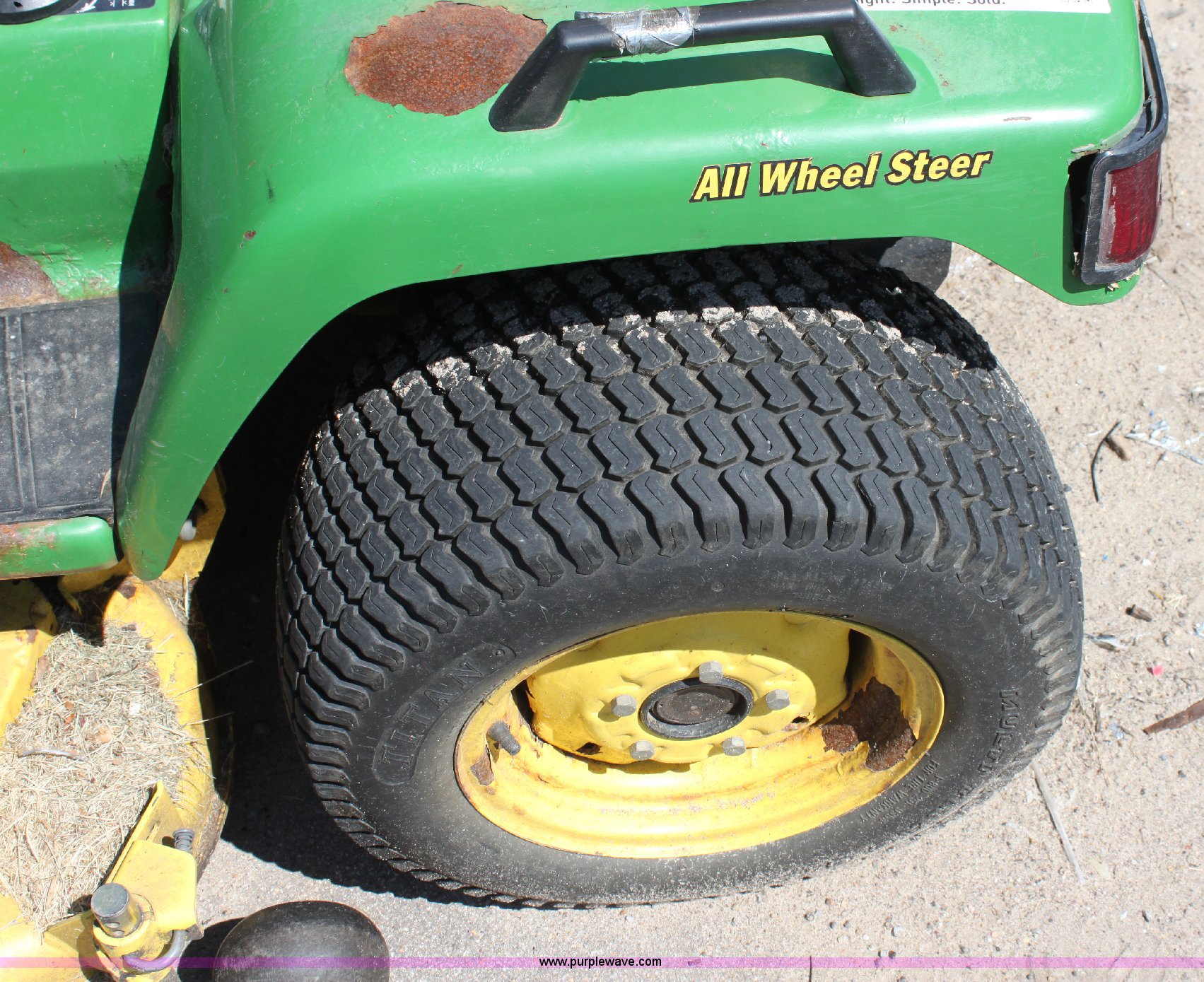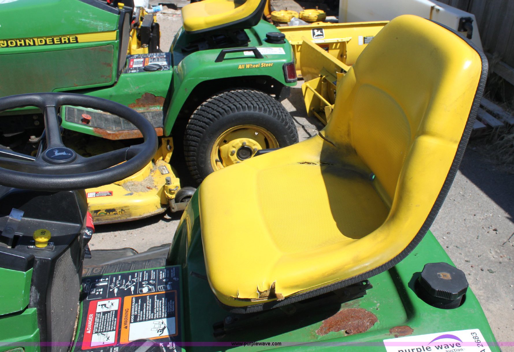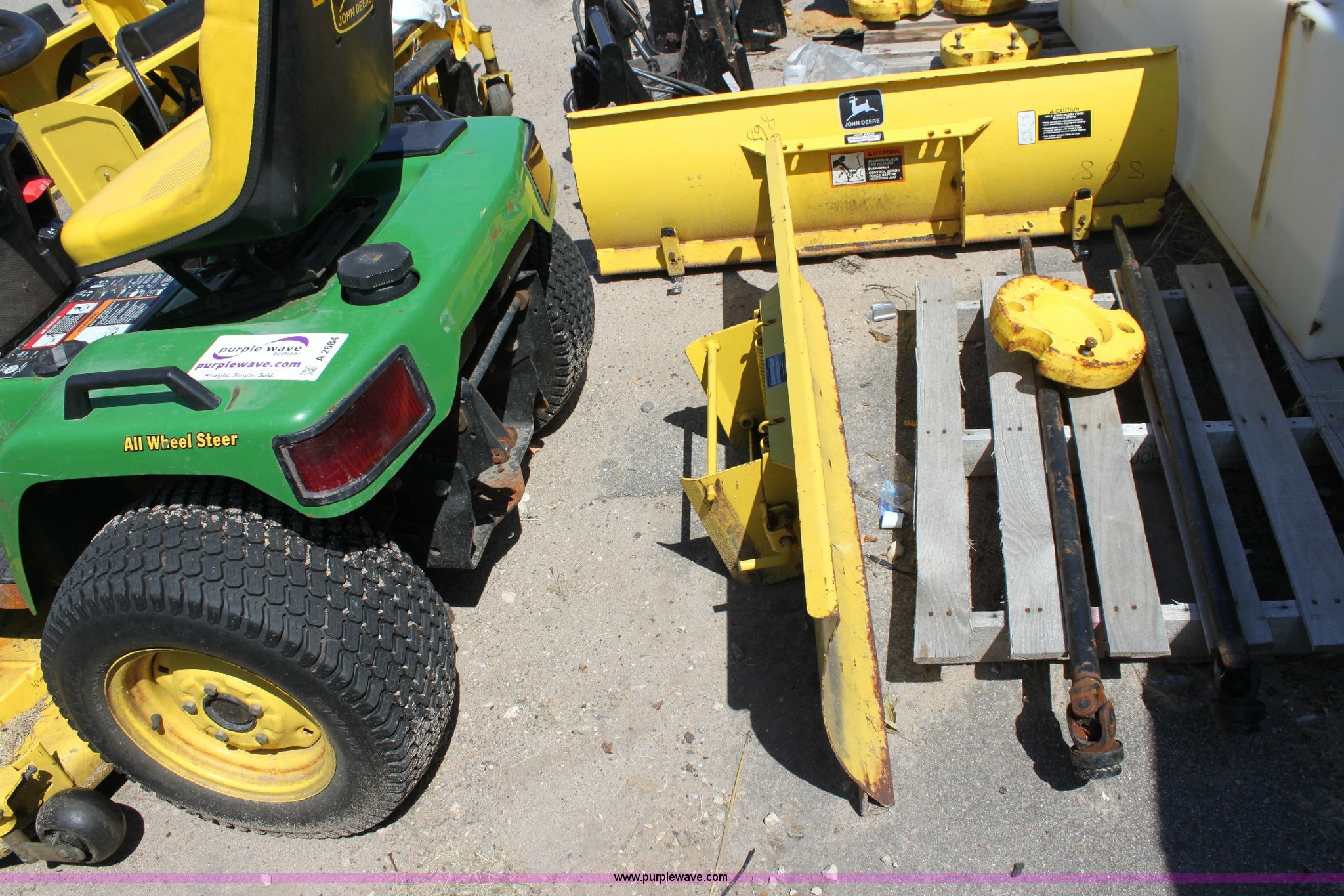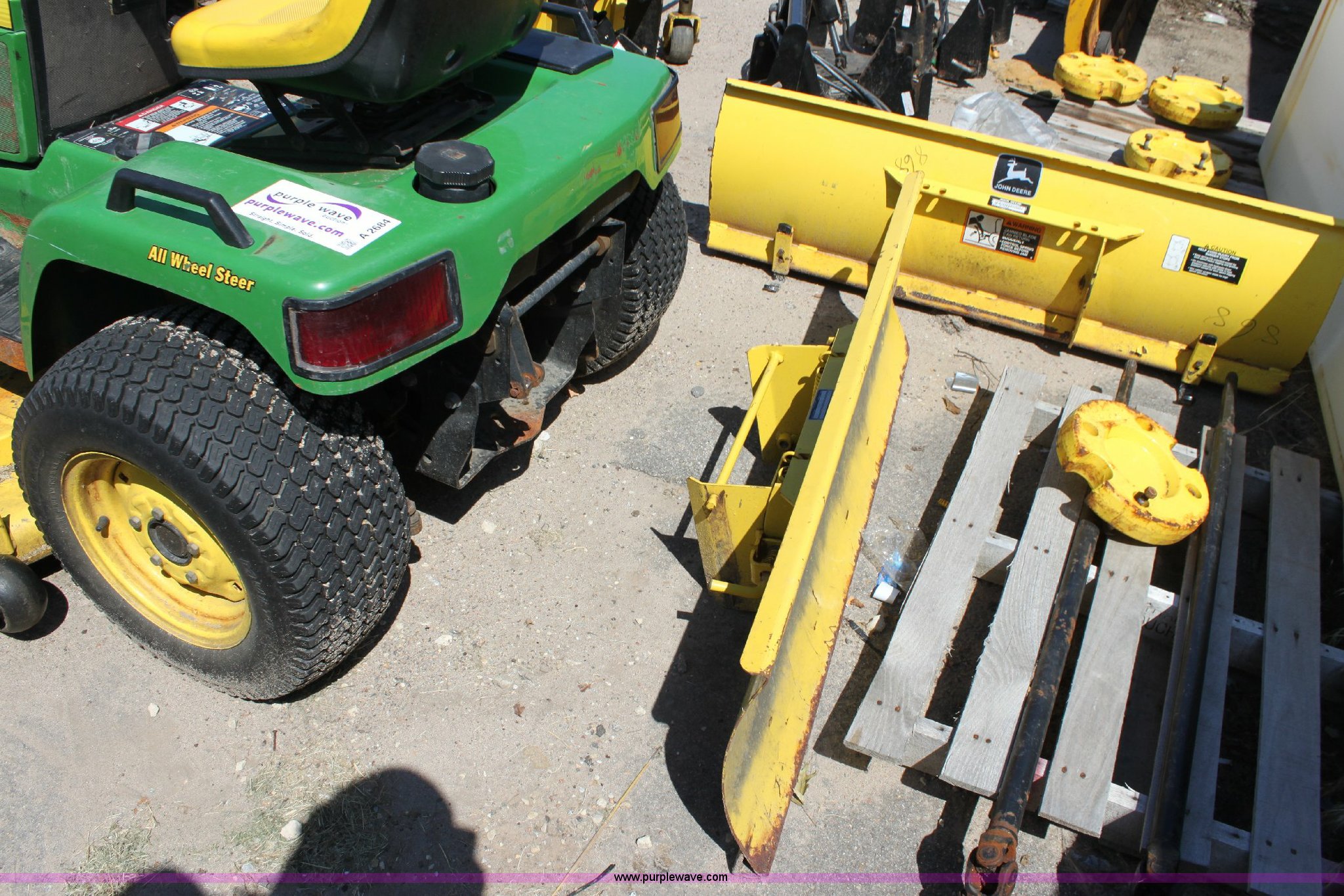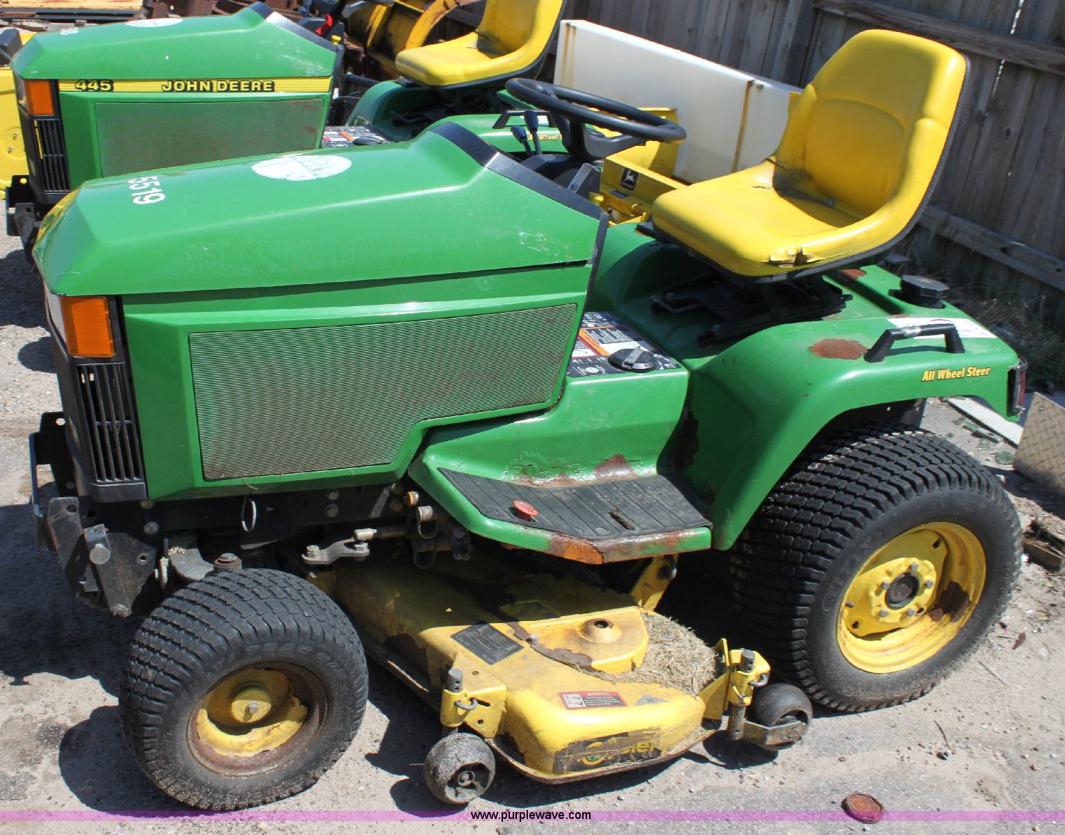 Purple Wave is selling a used Commercial Turf Mower in Kansas. This item is a John Deere 445 lawn mower with the following: 1,028 hours on meter, 48" cut, John Deere 22 HP gas engine, Hydrostatic transmission, Locking differential, John Deere attachments included, 47" snow blower, 51" broom, 54" blade, Equip# 5517