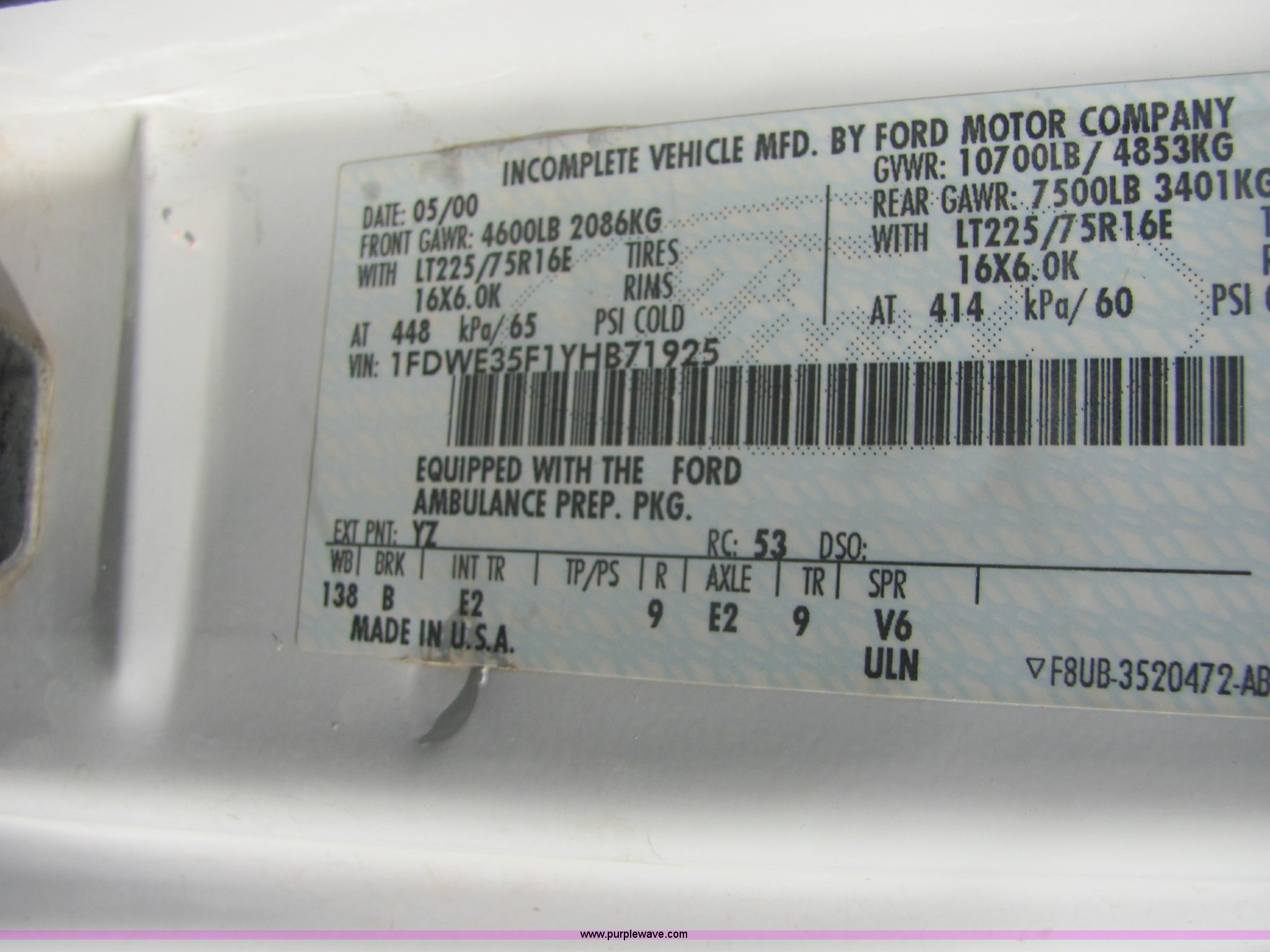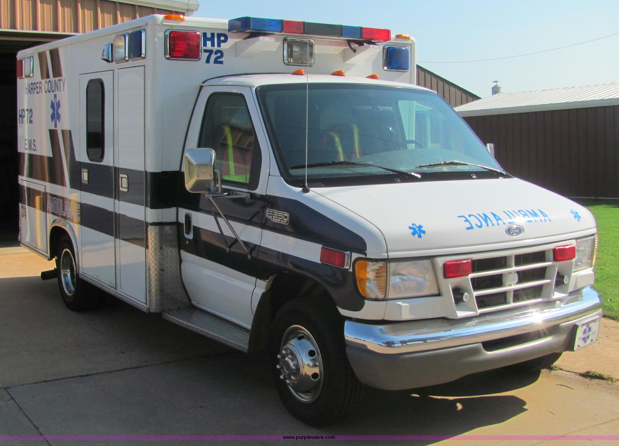 Purple Wave is selling a used Fire Truck or Emergency Vehicle in Kansas. This item is a 2000 Ford E350 Super Duty ambulance with the following: 110,528 miles on odometer, Mileage will vary, in use, Powerstroke 7.3L V8 diesel engine, Automatic transmission, AC and heat, front and rear, Tilt, Cruise, Power windows and locks, Contents not included
