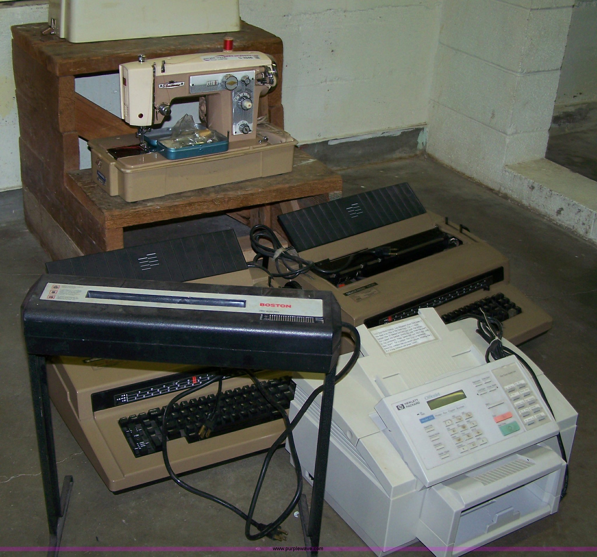 Assorted appliances. Sewing machine, Paper shredder, Silver Reed typewriter, Scanner/copier. City of Hoisington. 109 E 1st. Hoisington, KS 67544