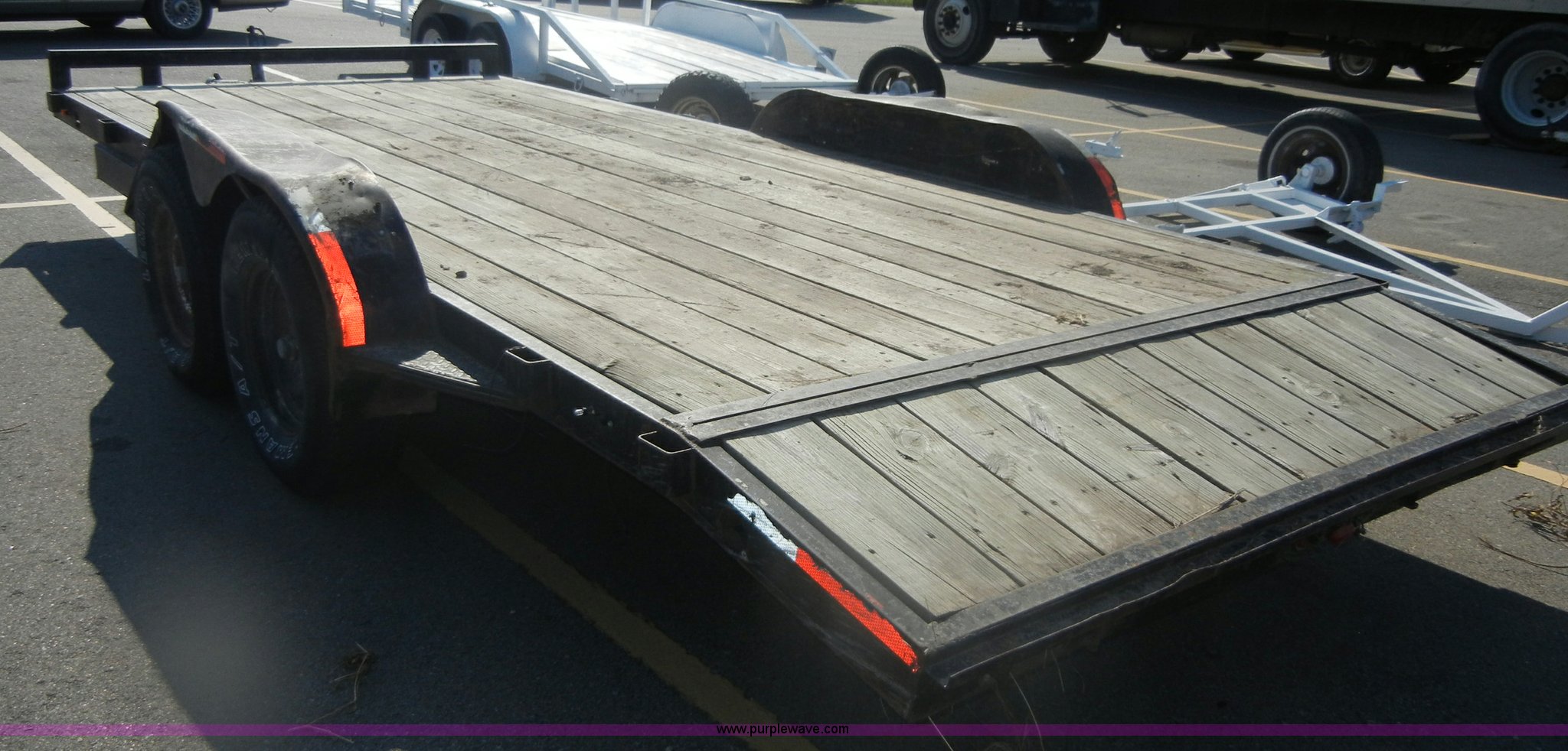 Purple Wave is selling a used Manufactured Home or Office in Kansas. This item is a 1998 Oklahoma 16' car trailer with the following: 16' wood floor, 2' dove tail, 5' tongue, 23' overall length, Wiring for lights, Not all lights are functional, Jack, Chains, 2" ball, 235/75R15 tires, GVWR 5,600 lbs, GAWR 3,500 lbs each axle