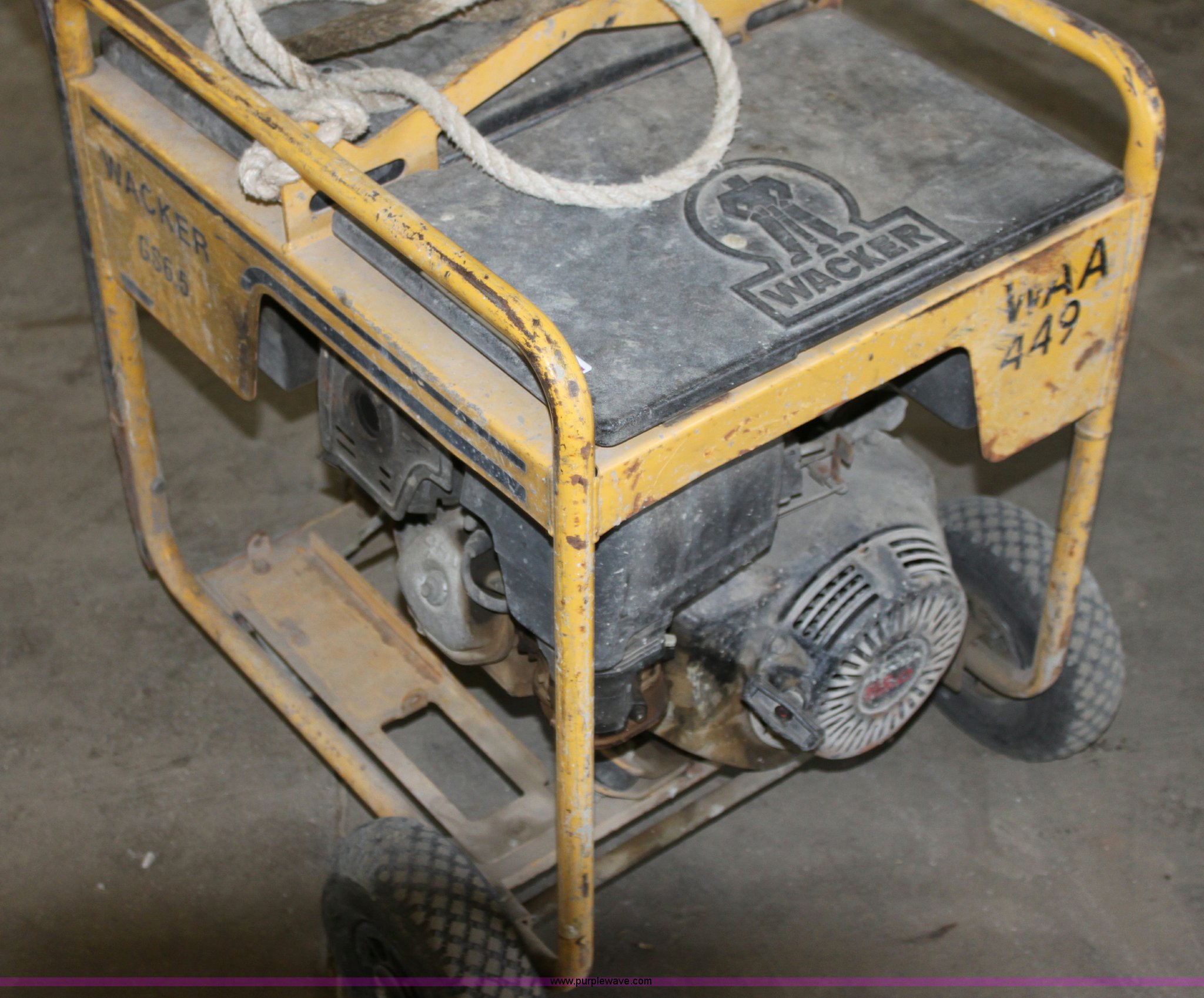 Purple Wave is selling a used Generator Set in Kansas. This item is a Wacker GS6.5 generator with the following: Honda 13 HP gas engine, (4) 120v outlets, 240v outlet