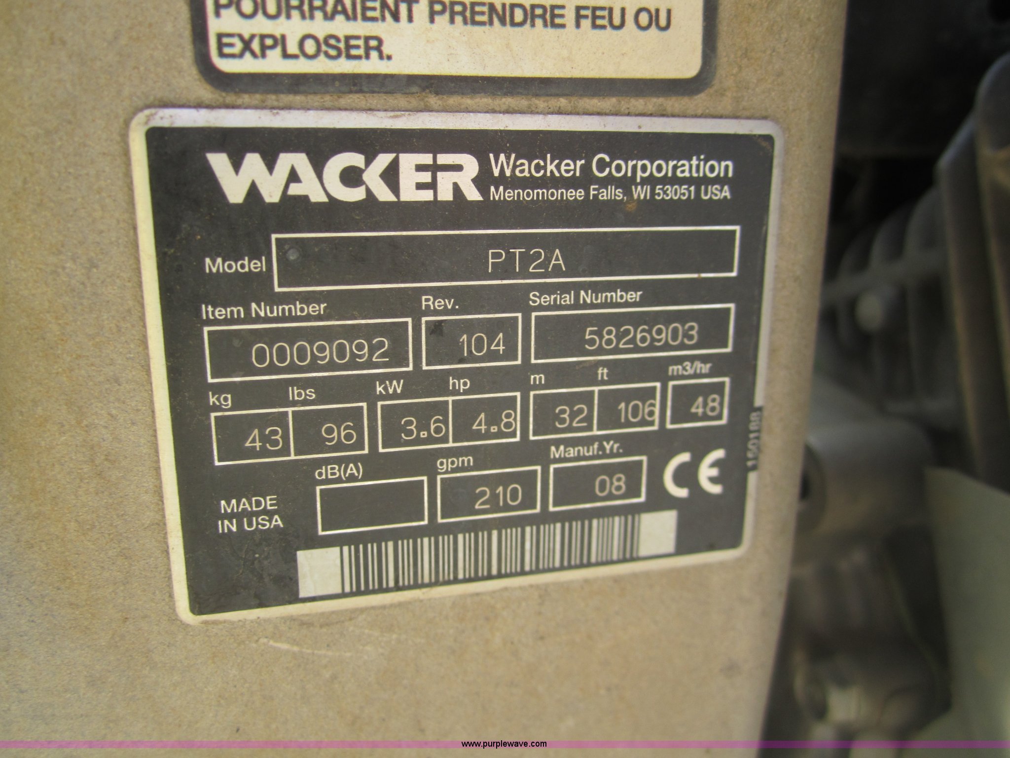 Purple Wave is selling a used Pump in Colorado. This item is a Wacker PT2A centrifugal 2" trash pump with the following: 210 gpm, Honda 16 HP gas engine, EIN 789948