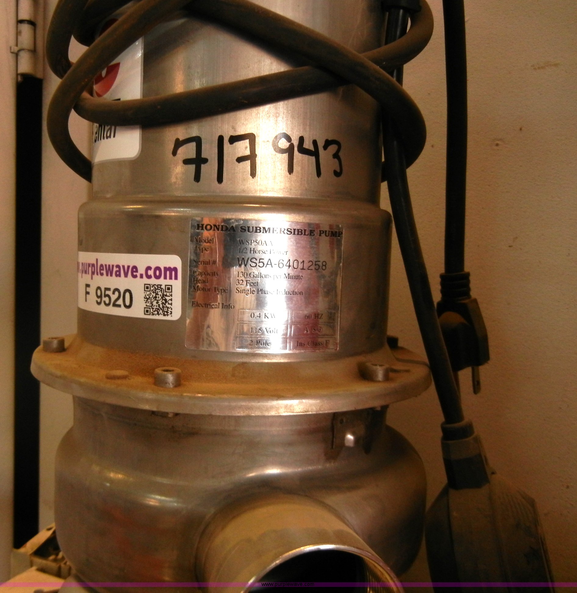 Purple Wave is selling a used Pump in Colorado. This item is a Honda electric submersible pump with the following: Model WSP33AA, 55 gpm, 1/2 HP motor, Single phase, 115v, Ins class F, Model WP50AA, Serial WS5A-6401258, EIN 717943