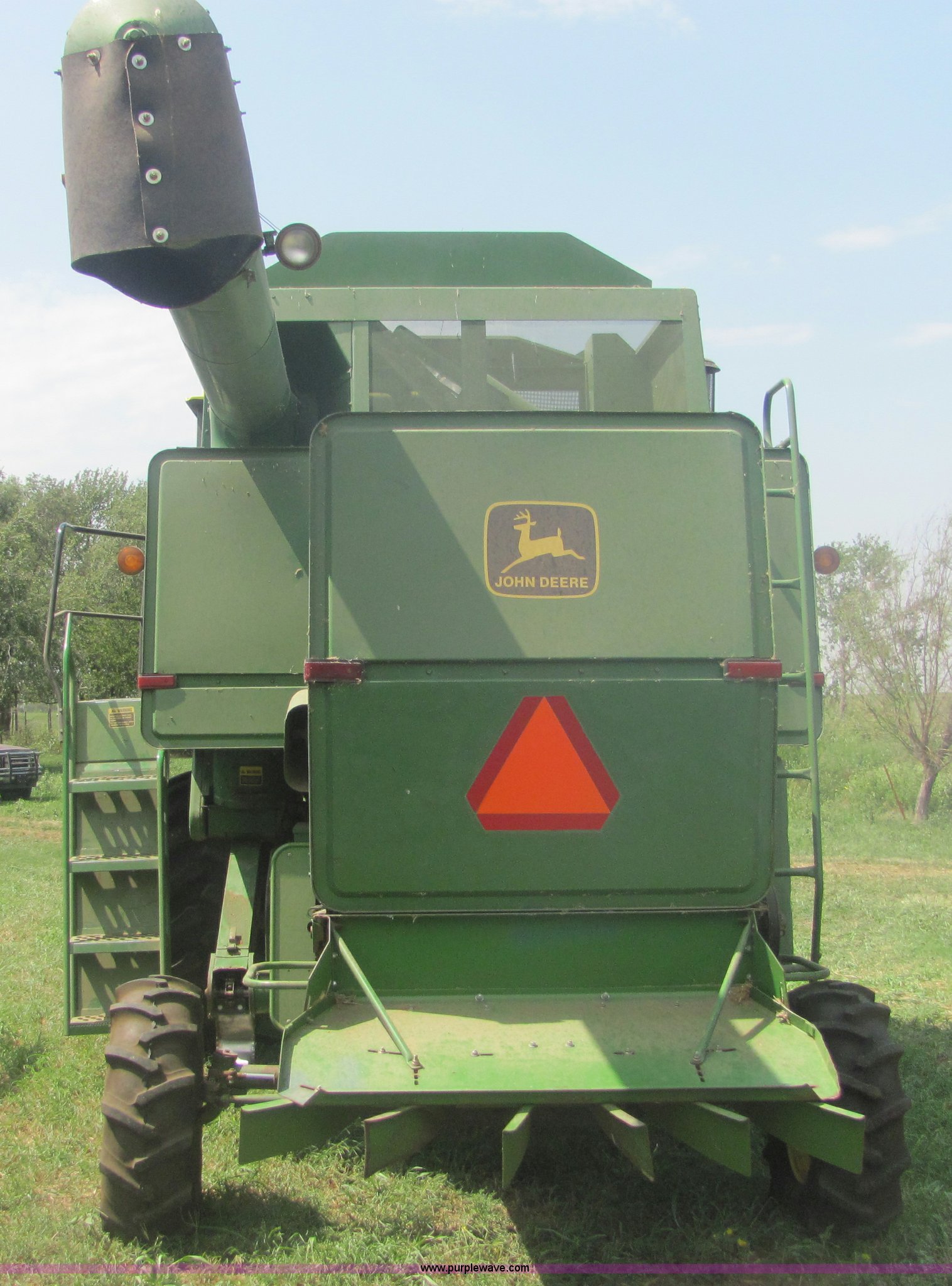 Purple Wave is selling a used Combine in Oklahoma. This item is a 1980 John Deere 6620 combine with the following: 2,215 hours on meter, John Deere six cylinder diesel engine, Hydrostatic transmission, Power reverser, Straw chopper, Recently replaced batteries, Recently replaced main auger/hopper shaft, Recently replaced belts on right side, 28L-26 front tires, 12.4-16 rear tires, One owner, AC needs charged, Serial 406871