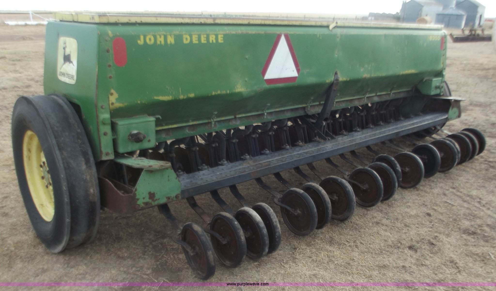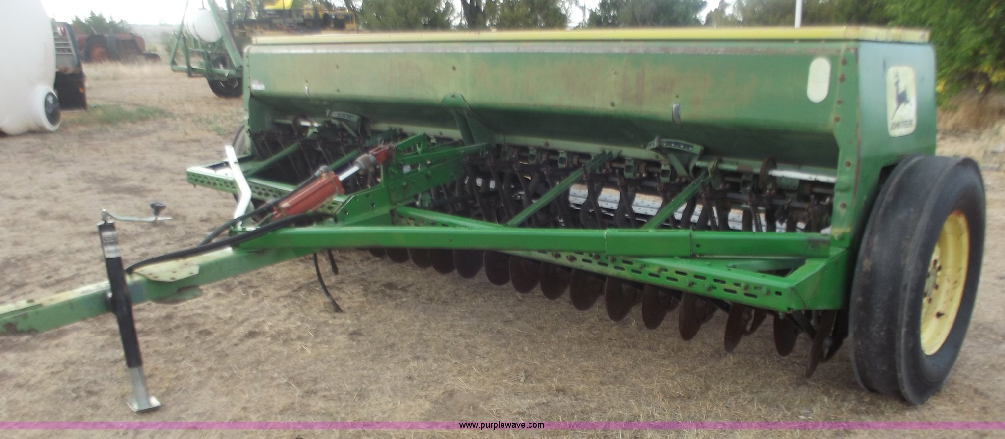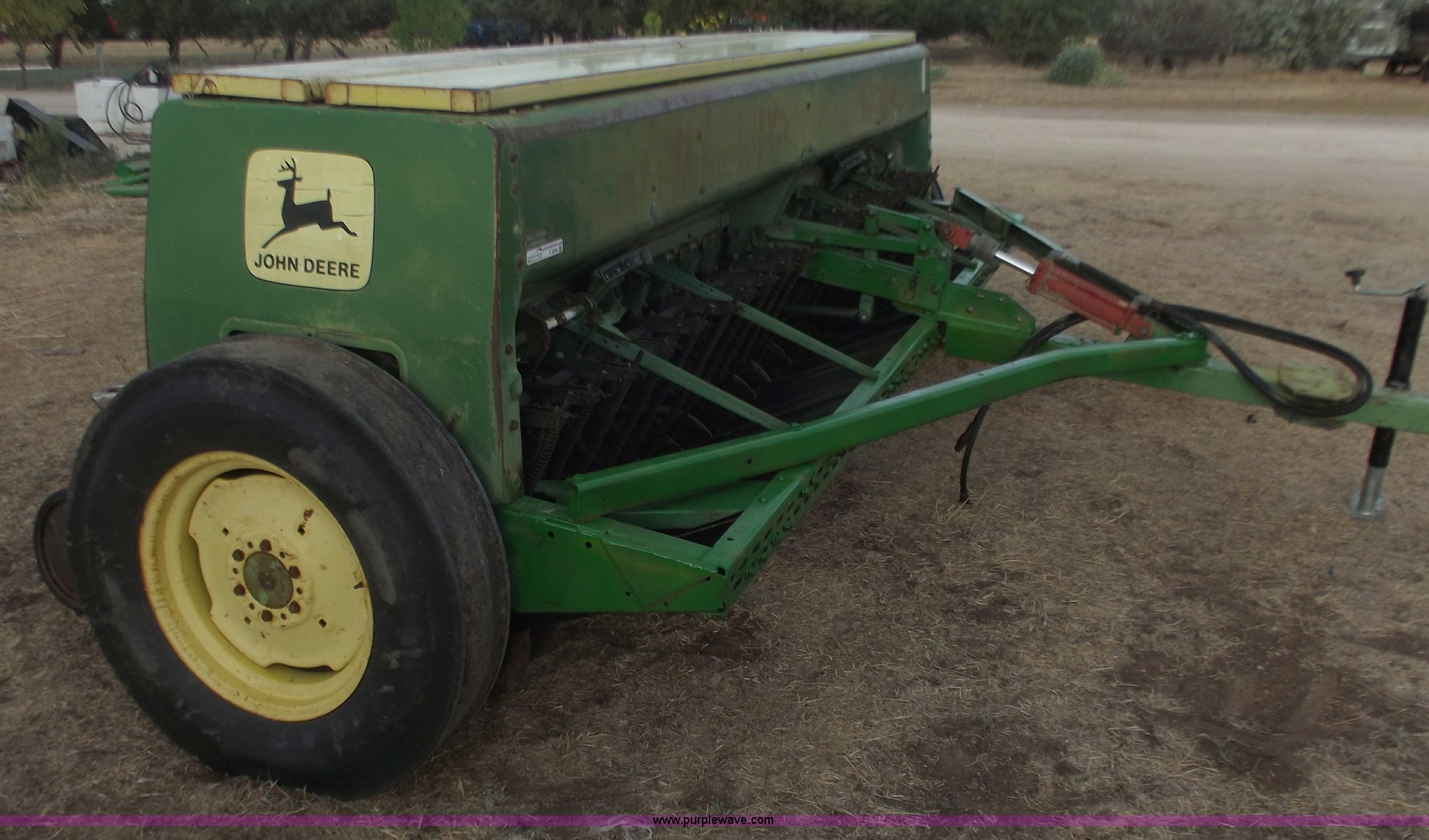 Purple Wave is selling a used Grain Drill or Seeder in Texas. This item is a John Deere 8350 grain drill with the following: 20 hole single disk openers, 8" spacing, Rear press wheels, Seed and dry fertilizer combo seed box, Hydraulic lift with cylinder, Fluted feed, 7.50x20 tires, Serial 001679