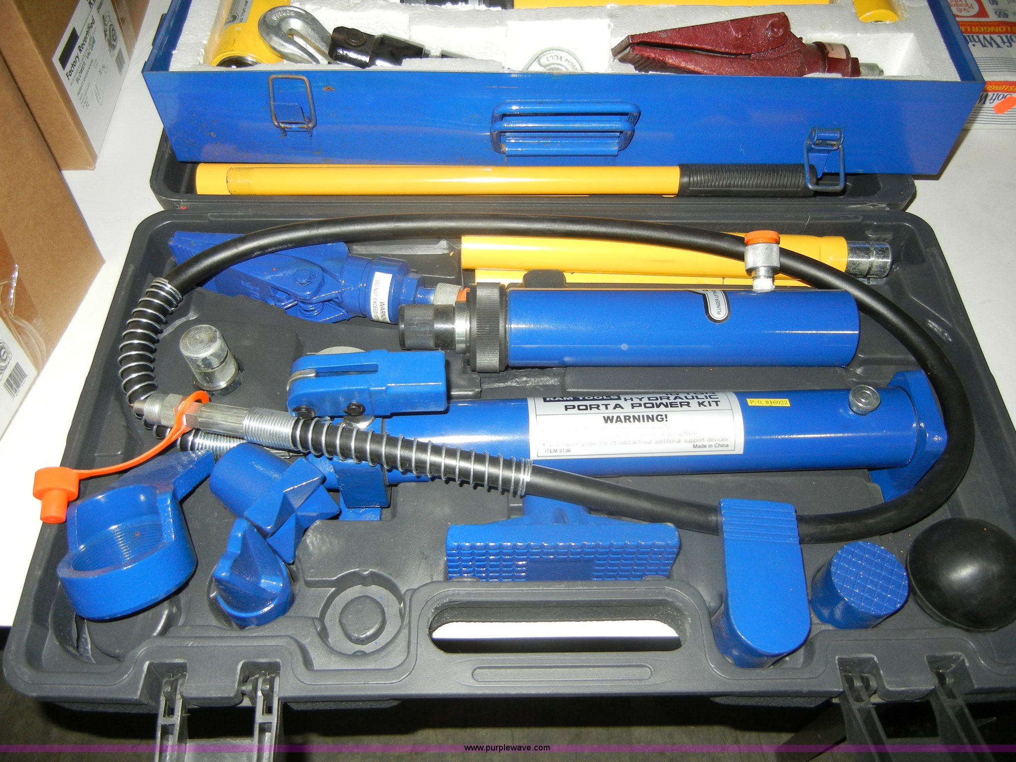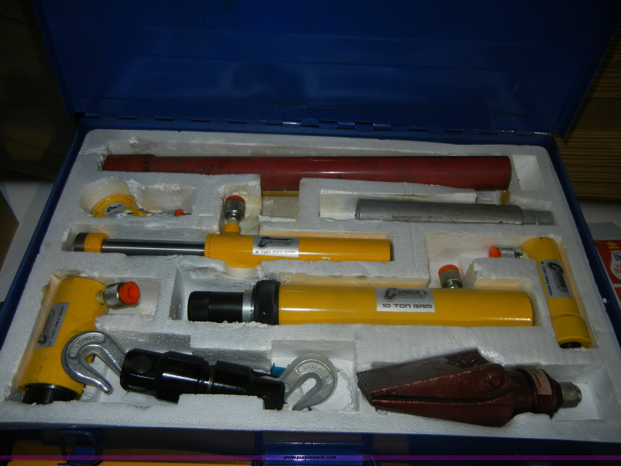 Purple Wave is selling a used Tools in Kansas. This item is a Assorted shop tools with the following: Ram 10 ton hydraulic porta power kit, Cummins porta power accessory kit, Fits 4 ton and 10 ton units