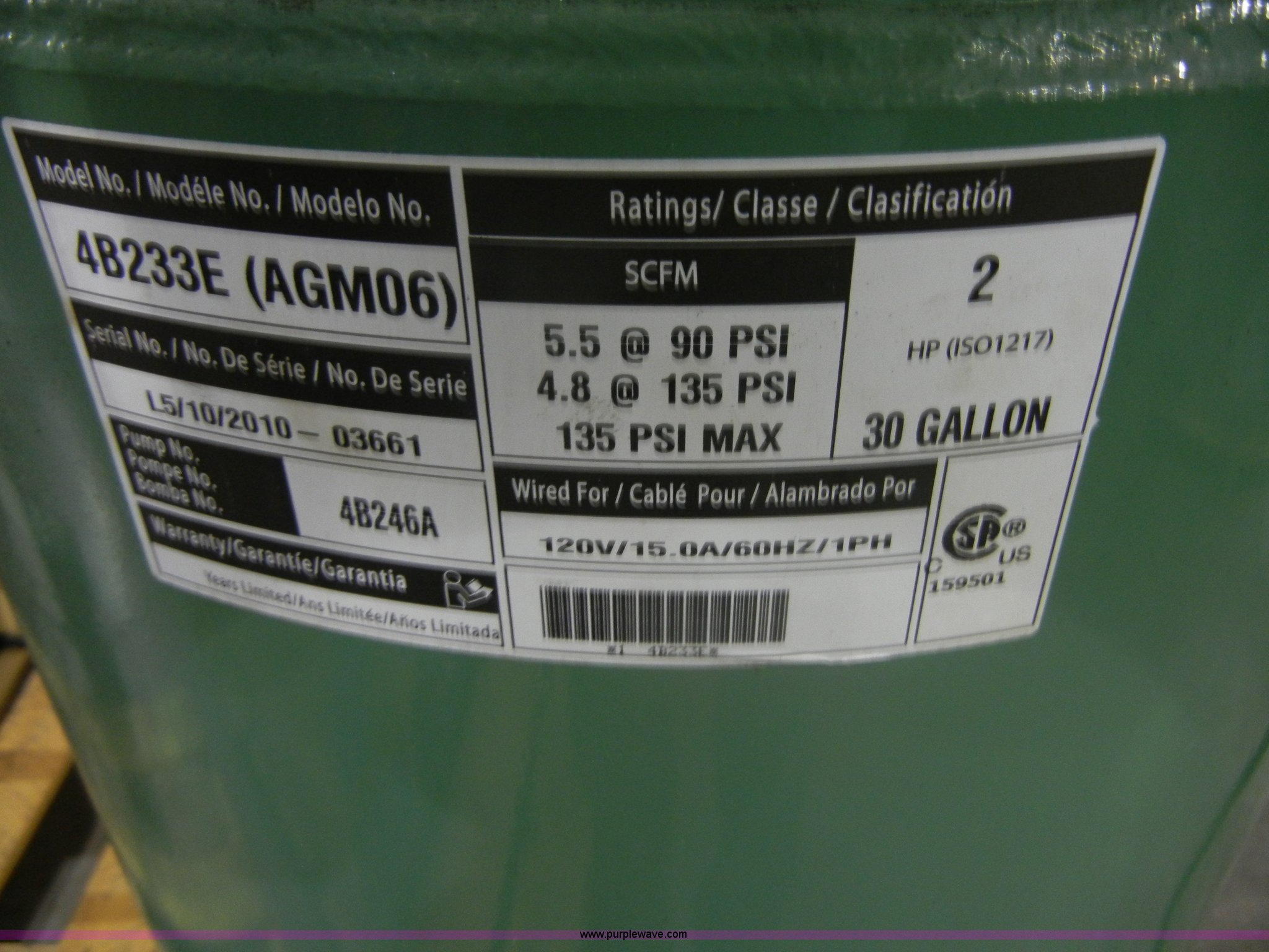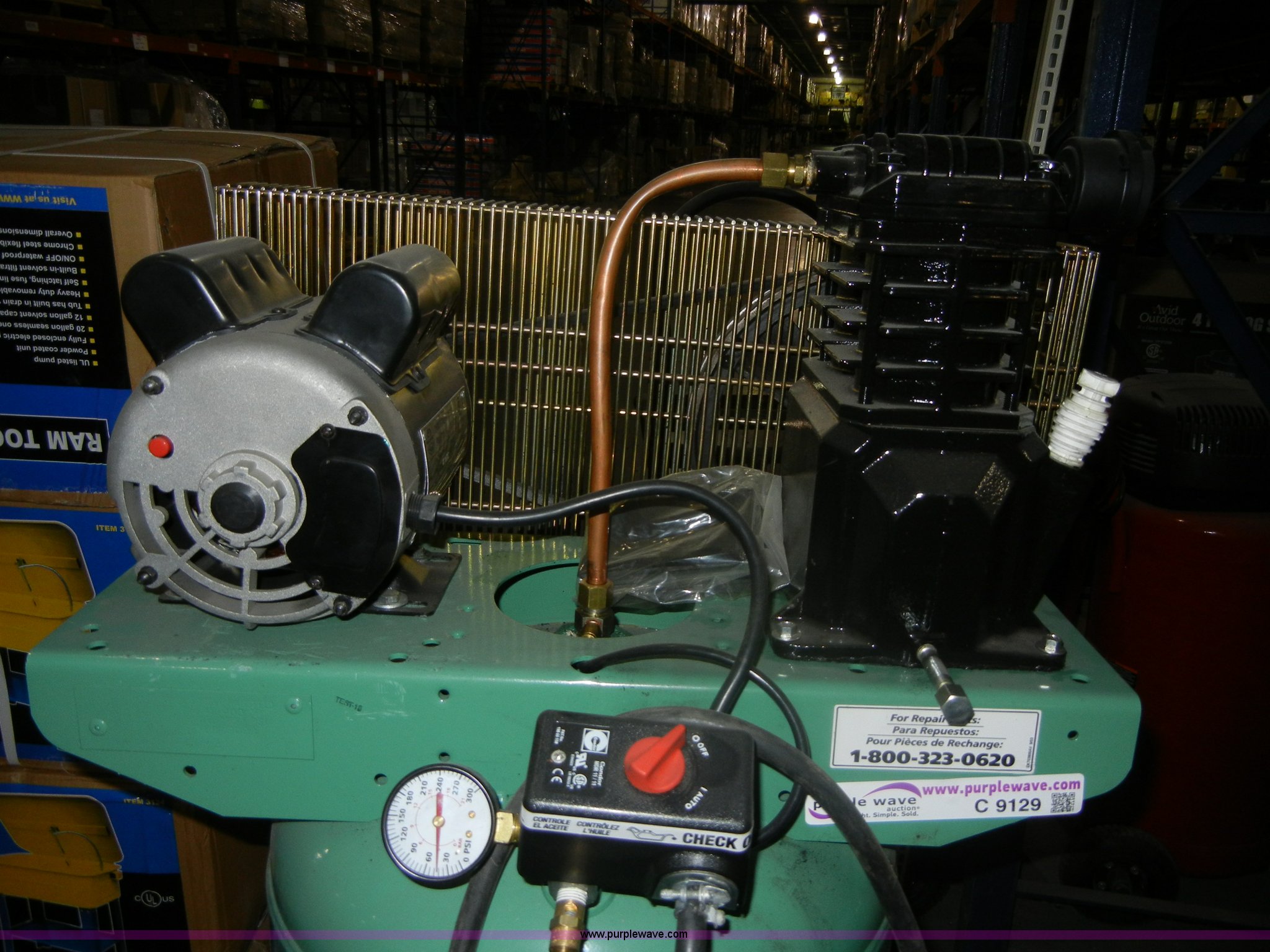 Purple Wave is selling a used Air Compressor in Kansas. This item is a SpeedAire 30 gallon air compressor with the following: 135 psi, 2 HP motor, single phase, Pressure switch with gauge, Model 4B233E