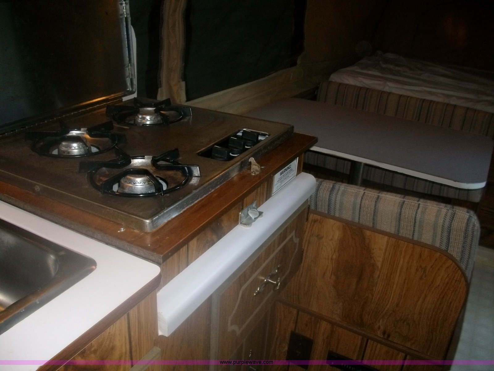 Purple Wave is selling a used RV in Kansas. This item is a 1991 Palomino Yearling camper with the following: 12'9"L x 6'7"W, 1,190 lbs, AC, Refrigerator, Table, Sink, Water holding tank, Removable indoor/outdoor stove, AM/FM/Cassette radio, Recently replaced propane tank, Inside lights, Storage shelving for transport, Leveling jacks, 2" ball, Spare tire