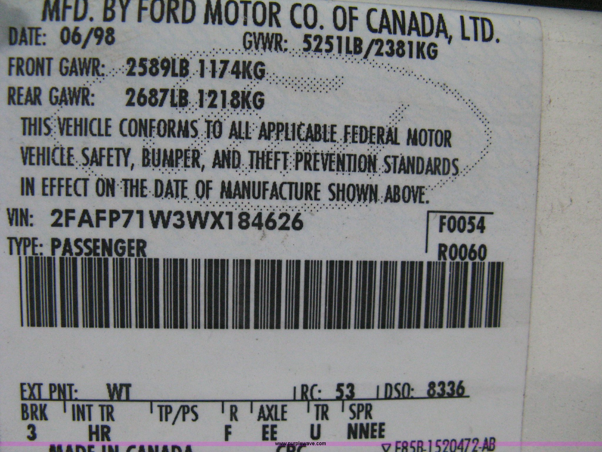 Purple Wave is selling a used Passenger Vehicle in Kansas. This item is a 1998 Ford Crown Victoria Police Interceptor with the following: 170,213 miles on odometer, 4.6L V8 EFI engine, Automatic transmission, AC and heat, Tilt, Cruise, AM/FM, Power windows, locks, mirrors, and seats, 225/65R16 front tires, P225/60R16 rear tires, Antenna ports on roof, Interior cosmetic damage, Currently not running