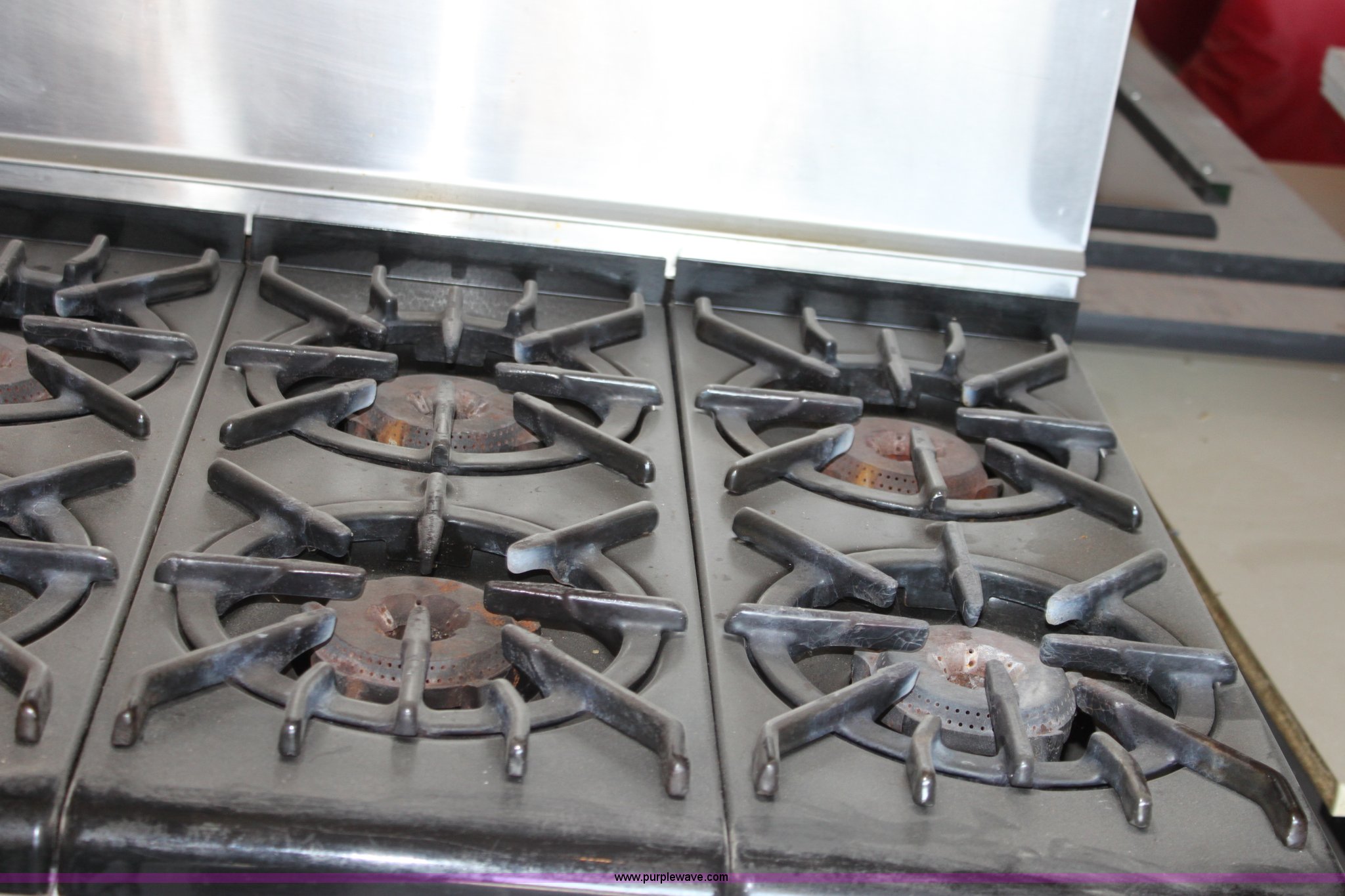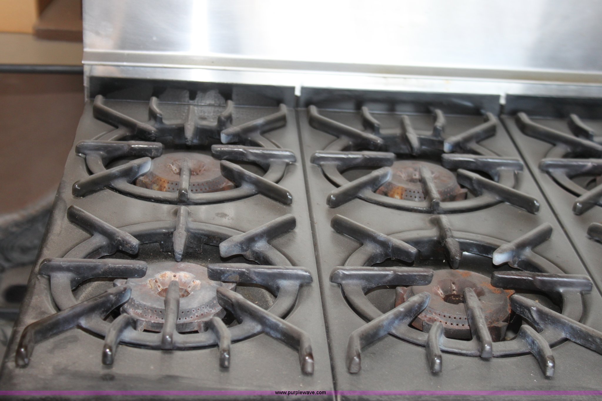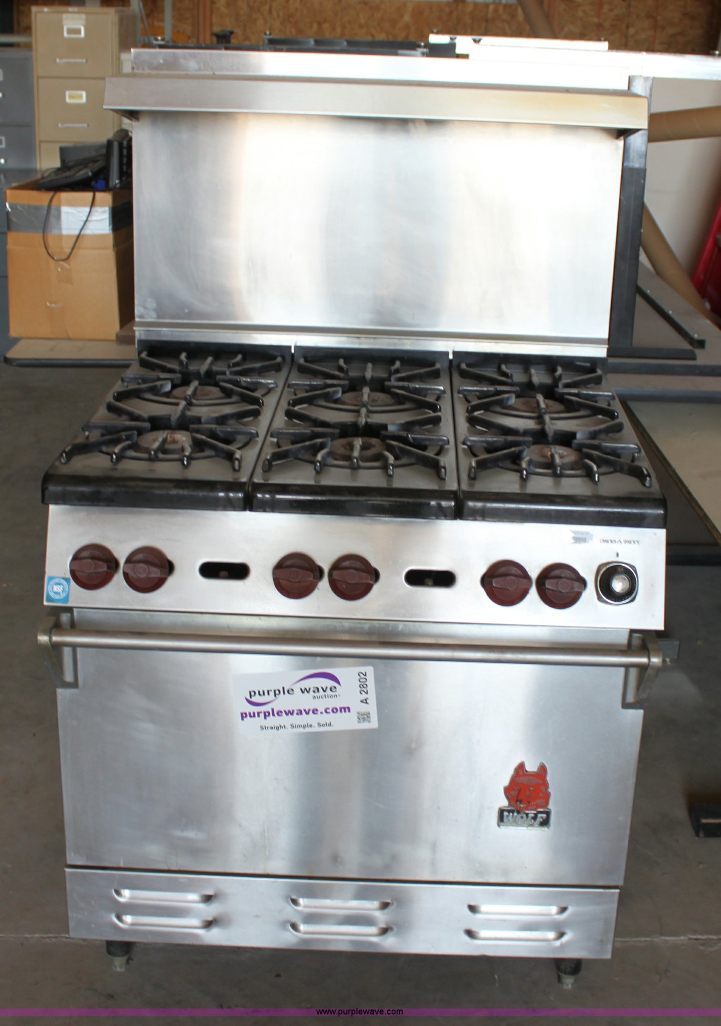 Purple Wave is selling a used Restaurant Equip. in Kansas. This item is a Wolf stainless steel commercial oven with the following: (6) burners, (2) oven racks, Natural gas