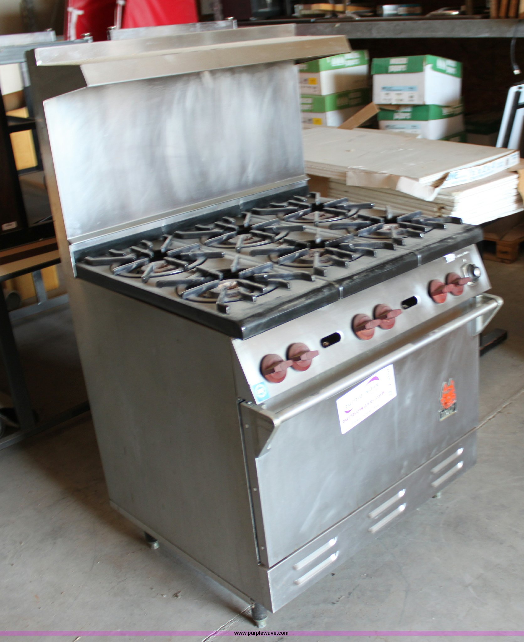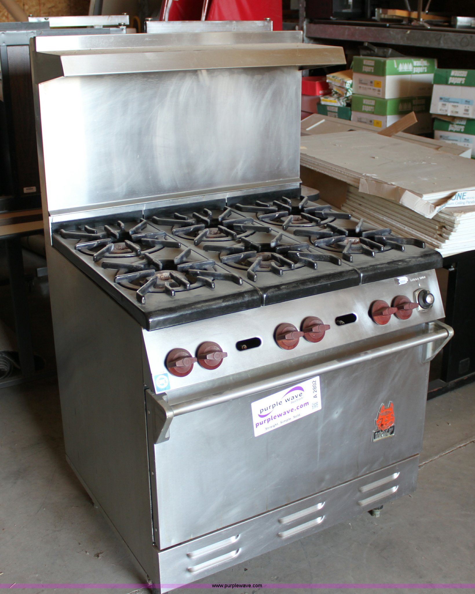 Wolf stainless steel commercial oven. (6) burners, (2) oven racks, Natural gas. USD 460. 150 N Ridge Rd. Hesston, KS 67062