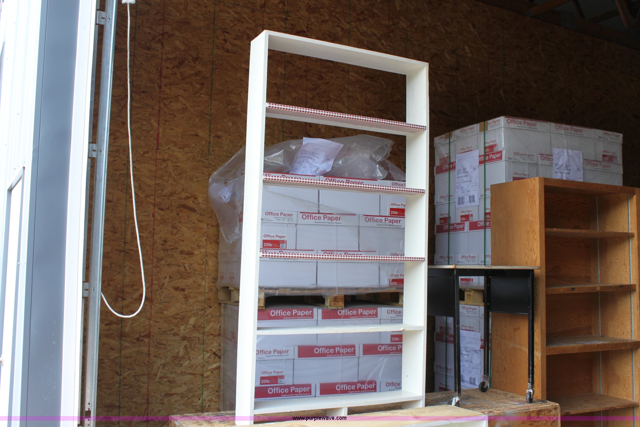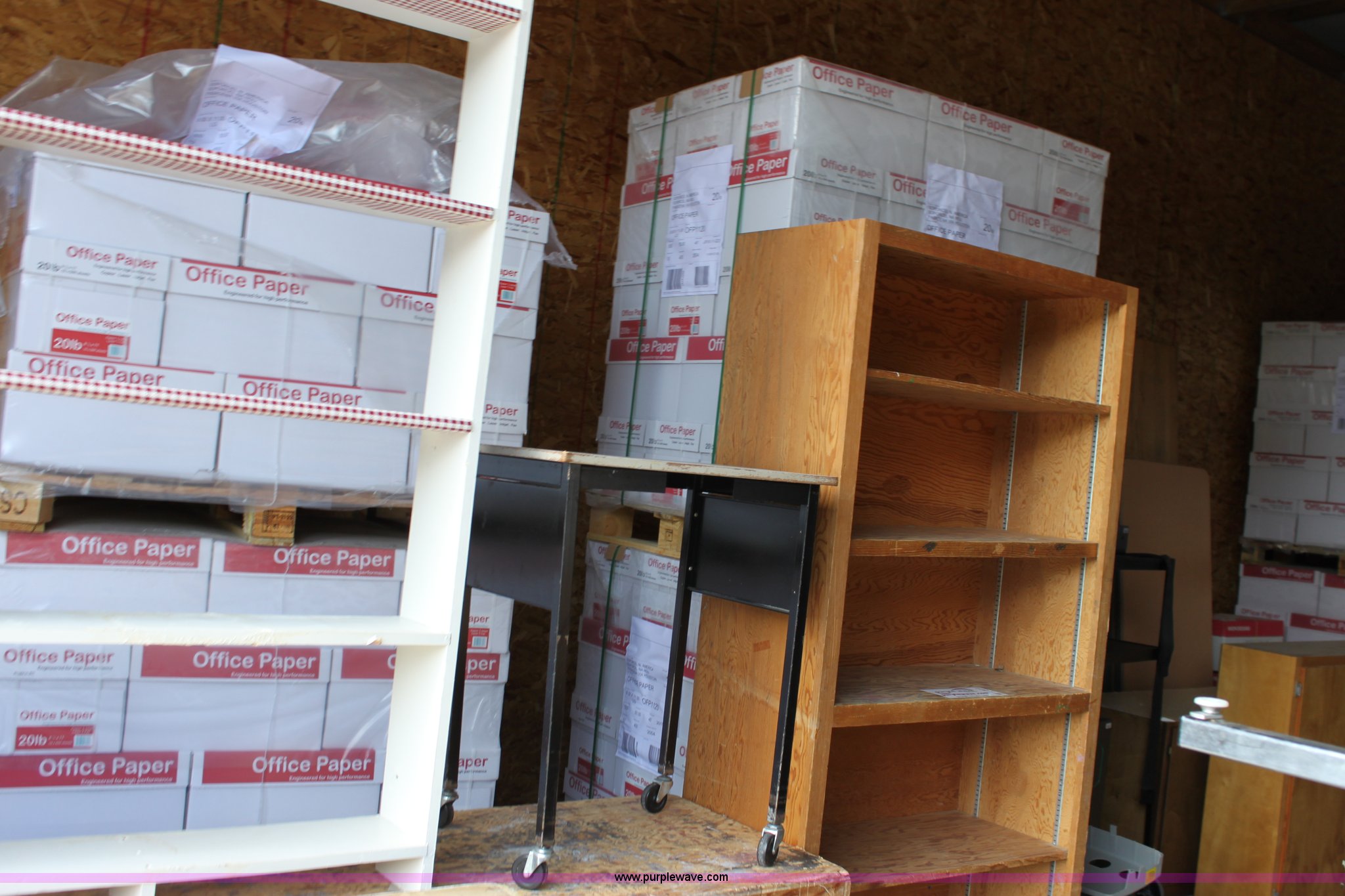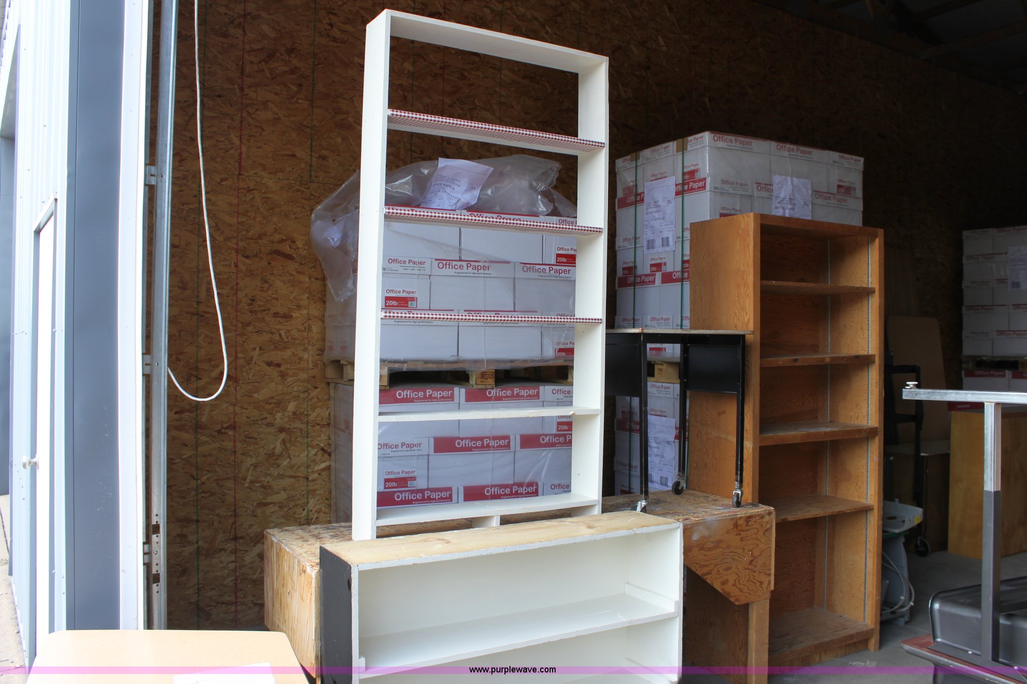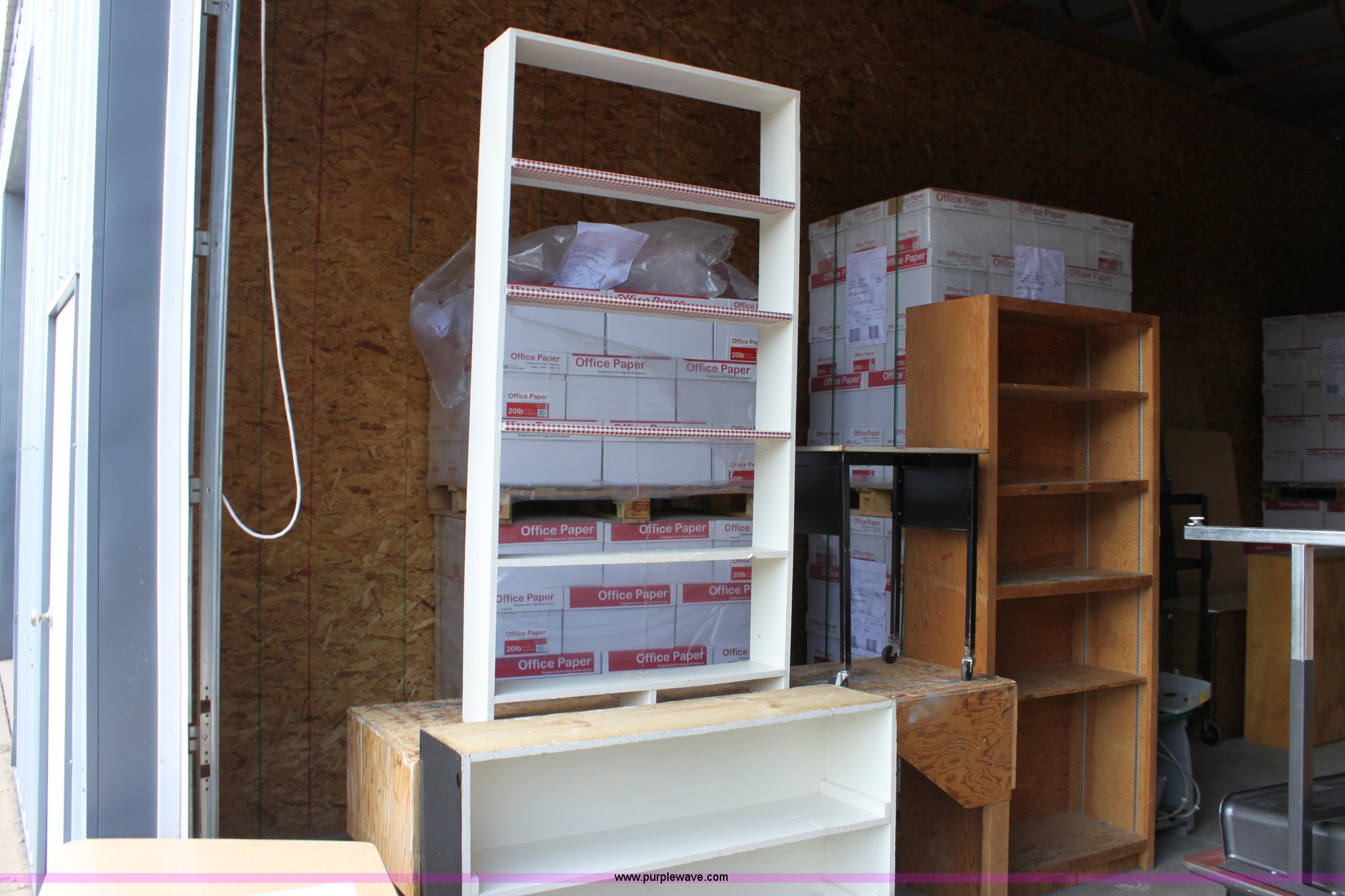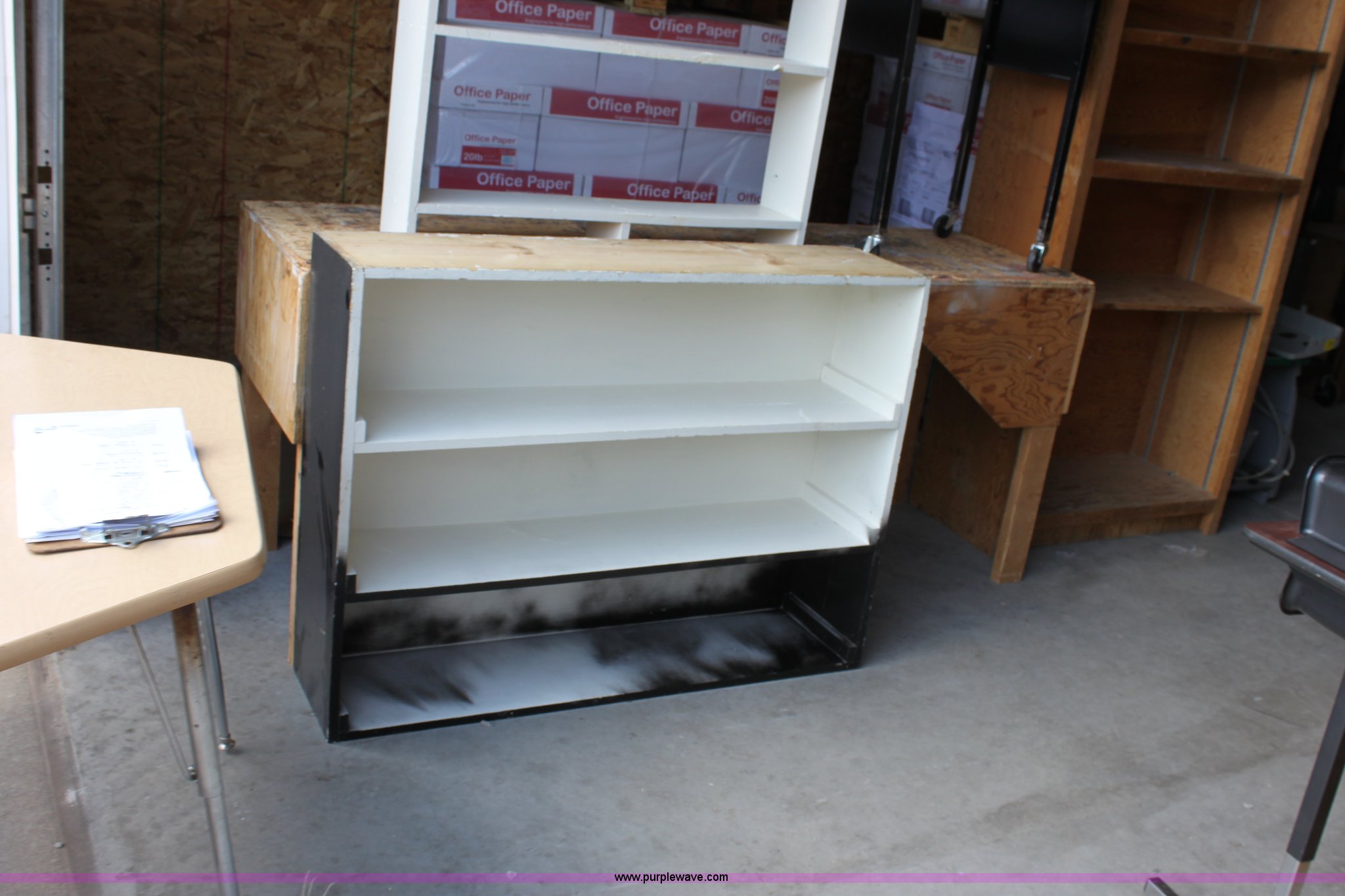 Purple Wave is selling a used Furniture in Kansas. This item is a Assorted wood shelving units and tables with the following: (3) shelving units, 37" x 16.5" x 84", 37" x 7" x 72", 48" x 11.5" x 36", 79.5" x 24" x 33.5" table, 24" x 18" x 29.75" rolling table