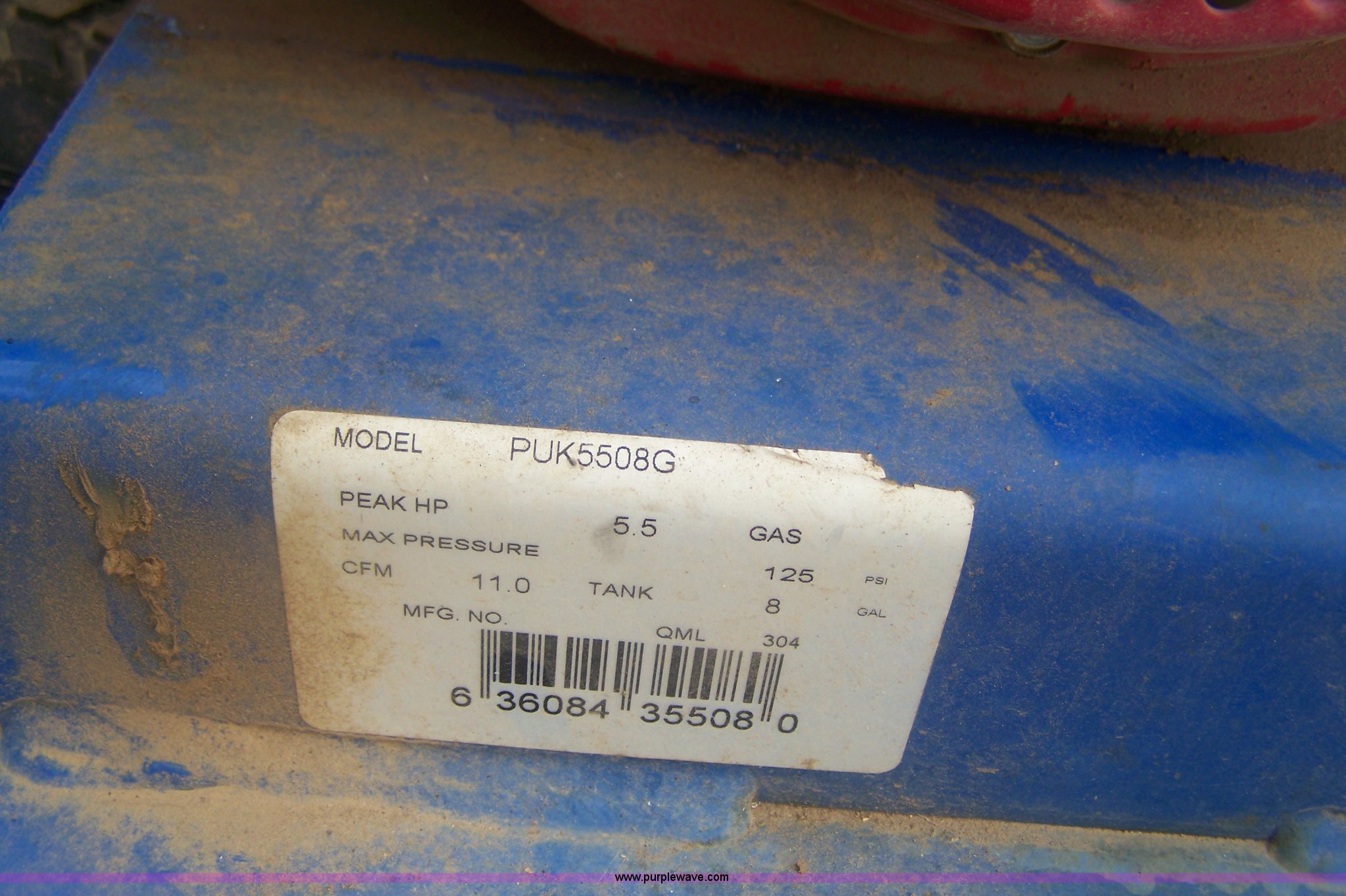 Purple Wave is selling a used Air Compressor in Kansas. This item is a Puma 8 gallon air compressor with the following: 5.5 HP gas engine, Model PUK5508G