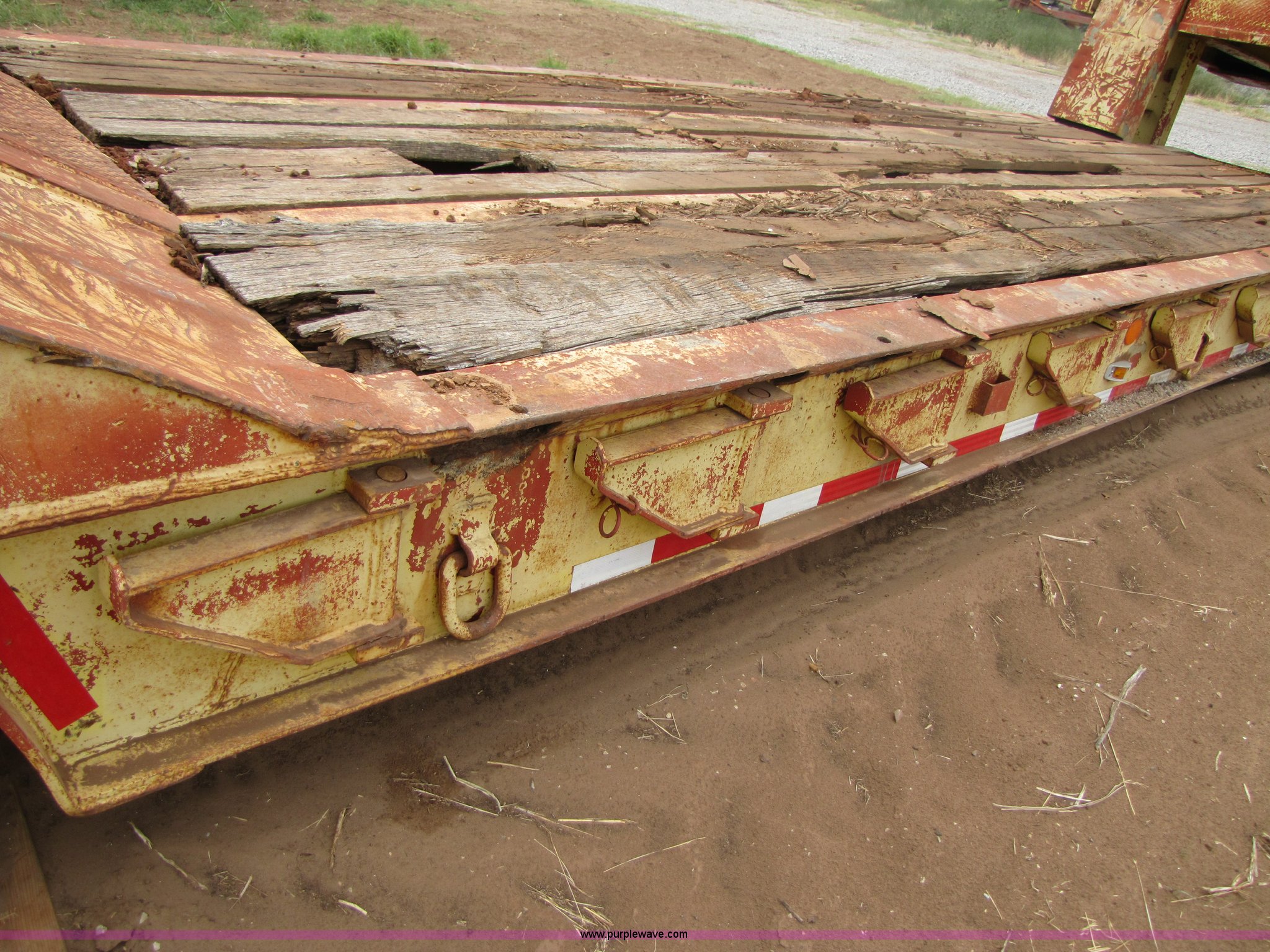 Purple Wave is selling a used Equip. Trailer in Oklahoma. This item is a 1979 Hyster 45' 50 ton equipment trailer with the following: 96" width, 19' deck, 10'4" upper deck, Mechanical folding tongue, Rolling tailboard, Air brakes, New brakes last year, Manual outriggers, 10.00R20 tires
