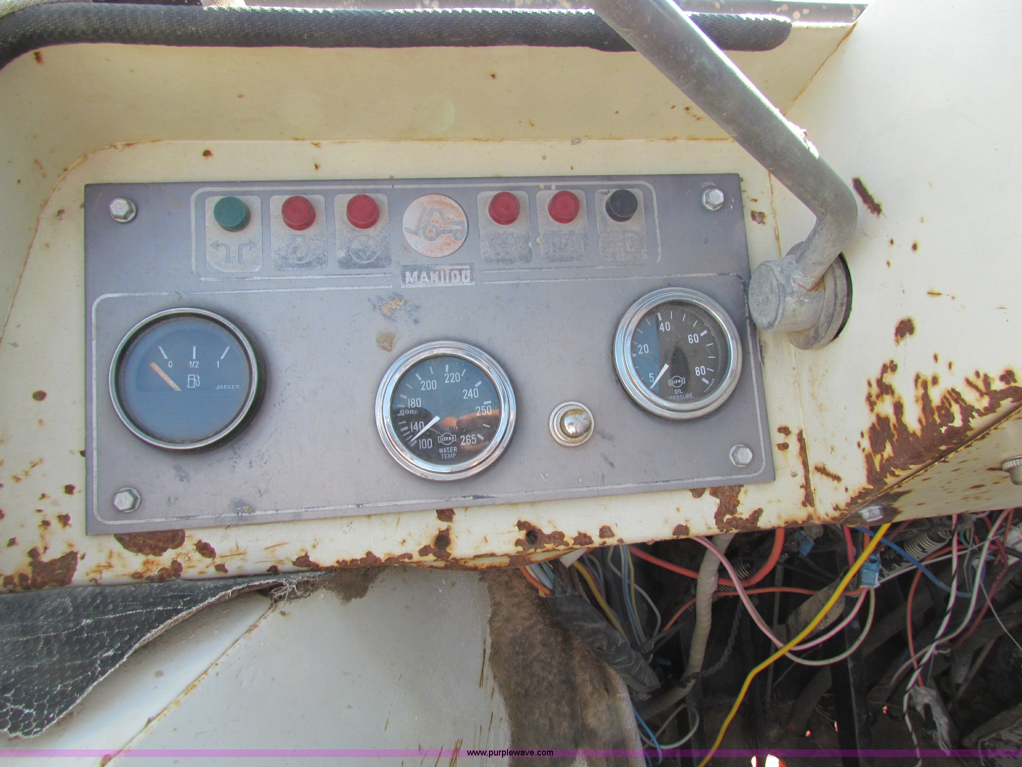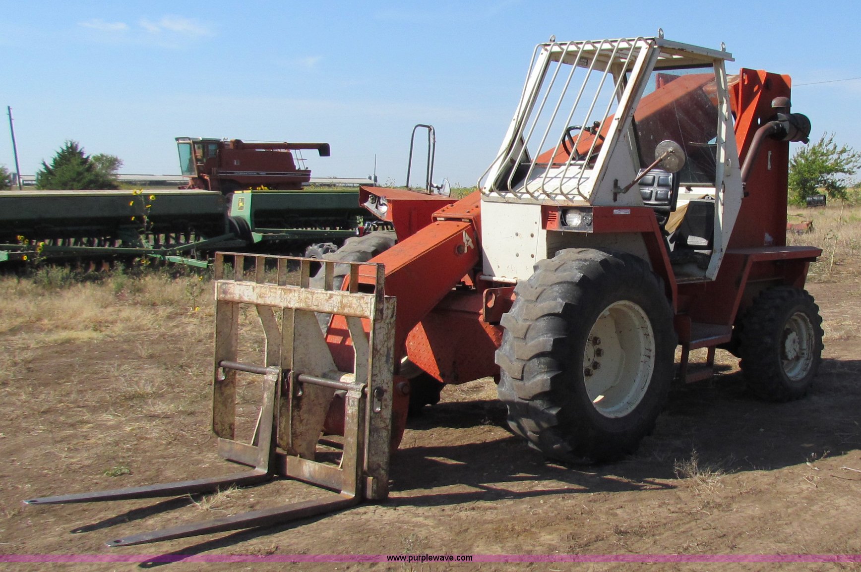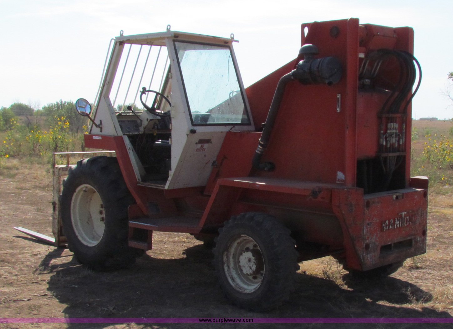 Purple Wave is selling a used Telehandler in Kansas. This item is a 1984 Manitou R522-4TC all terrain telehandler with the following: Ford four cylinder diesel engine, Four speed transmission, Four wheel drive, 25' reach, Forks included, New tire included, 16.9-24 front tires, 10.5/80-18 rear tires, 21,260 lbs. base operating weight, Serial 63091