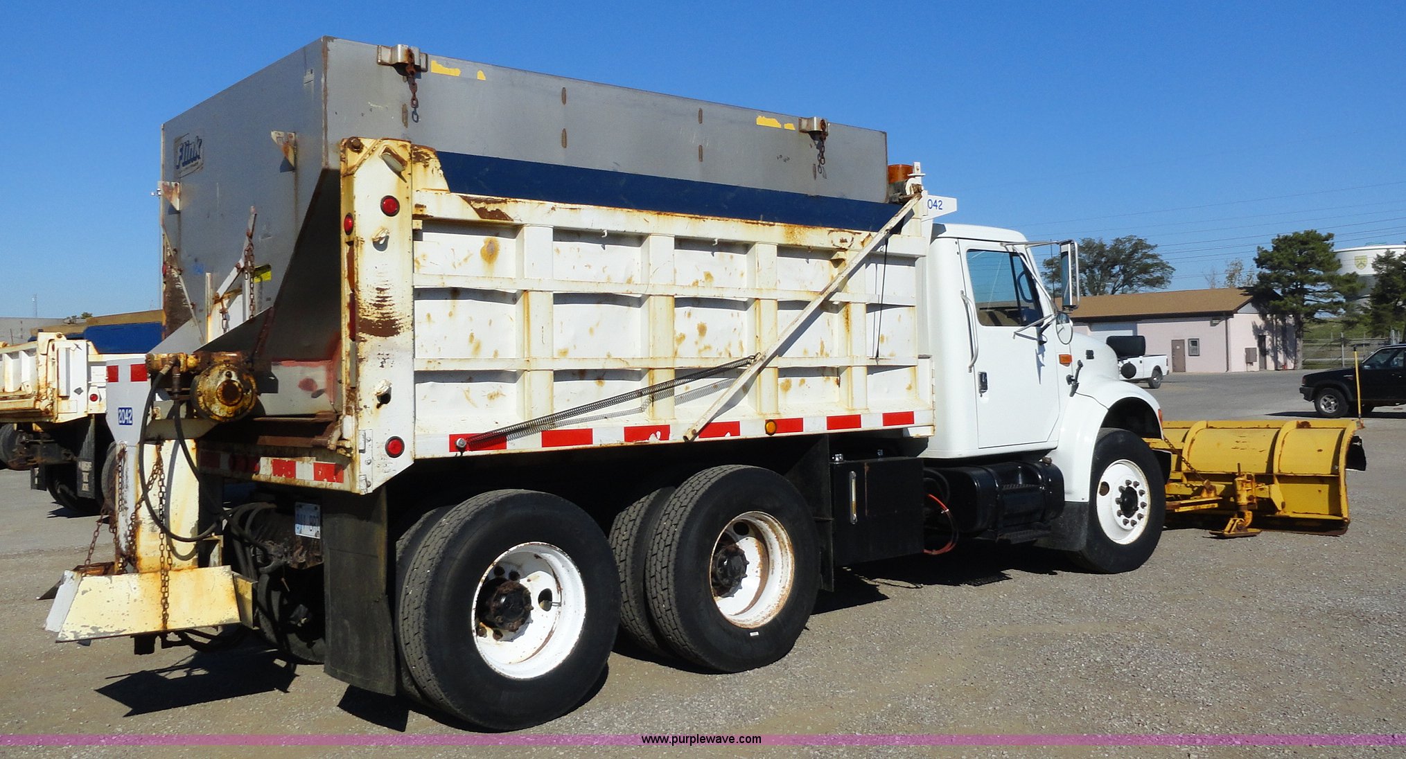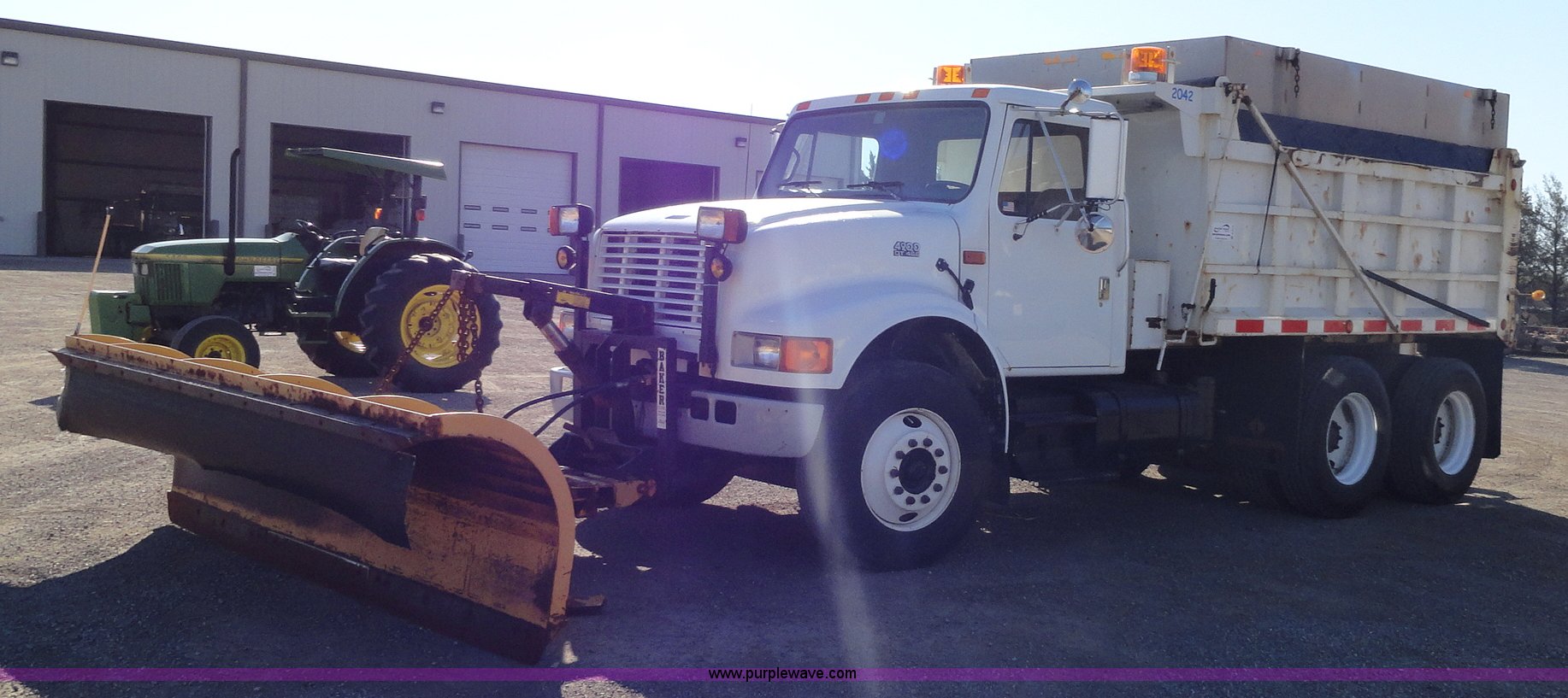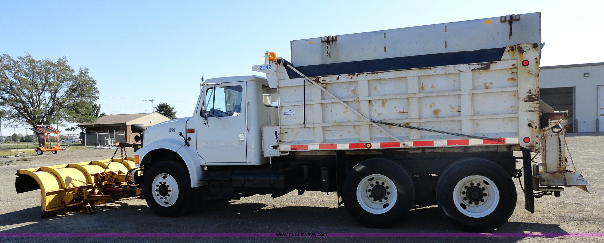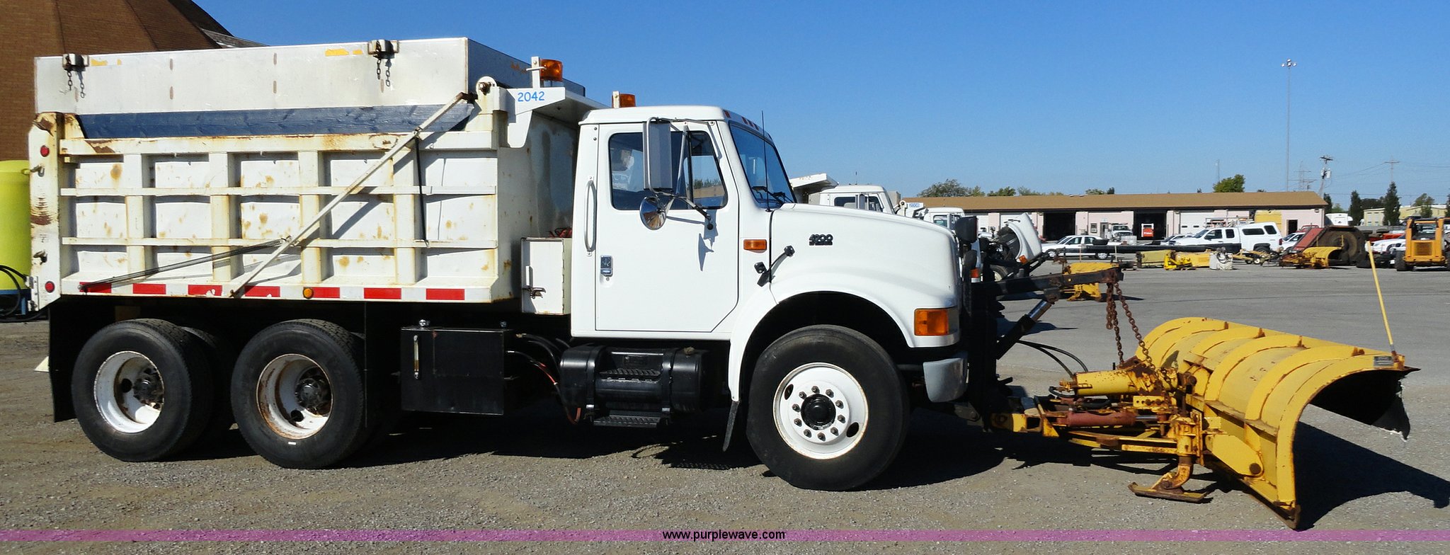 Purple Wave is selling a used Construction Dump Truck in Kansas. This item is a 1995 International 4900 tandem axle dump truck with plow and spreader with the following: 105,159 miles on odometer, 6,296 hours on meter, Navistar DT466 7.6L diesel engine, 250 HP, Eaton Fuller 10 speed manual transmission, Twin screw, Heater, AM/FM/Cassette, Power windows, 12' dump bed, Manual end gate, Flink 11' snow plow, Model 11PA38B, Serial 189, Plow lights, Flink 10 yd. stainless steel spreader, Tailgate included, Strobe lights and power supply, 6' x 20" x 12" toolbox, Spring suspension, Dual 50 gallon fuel tanks, PTO, Air brakes, Tow hooks, 11R22.5 tires, Equip# 2042