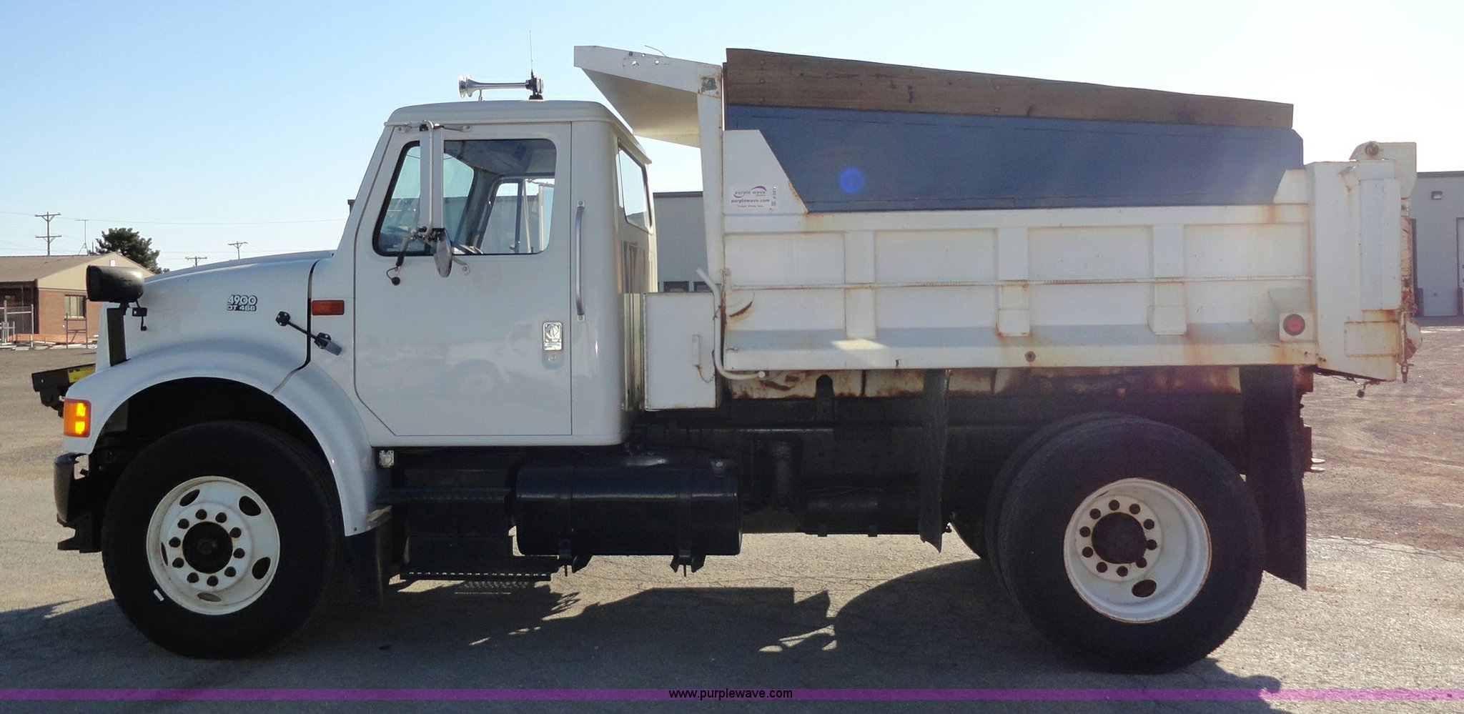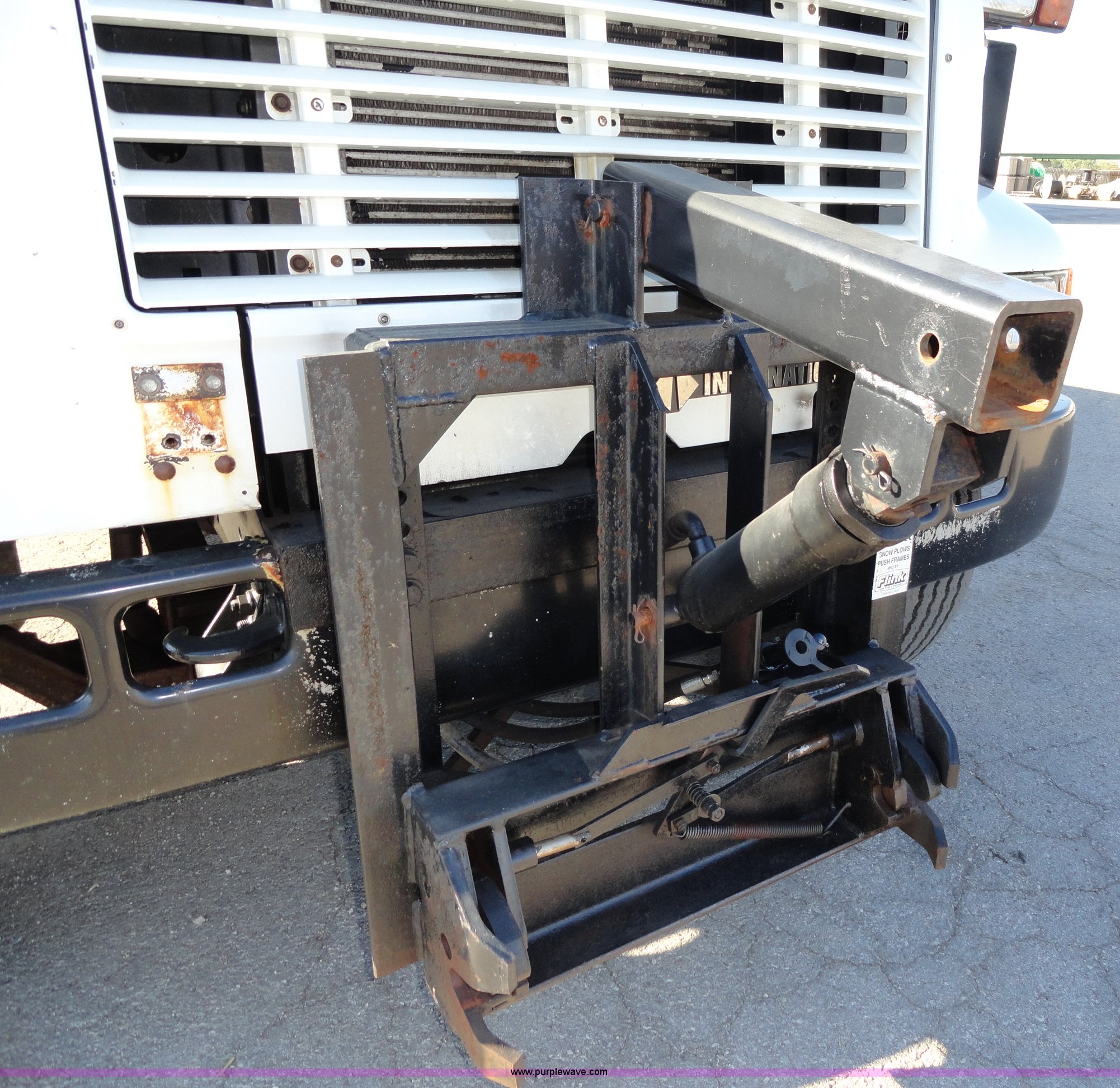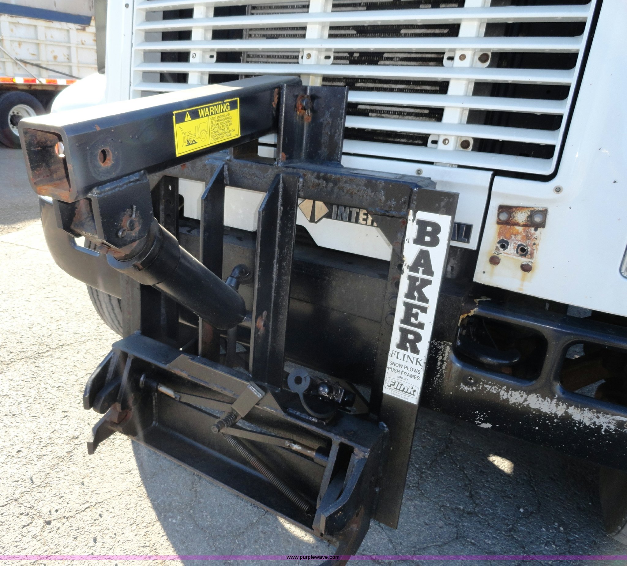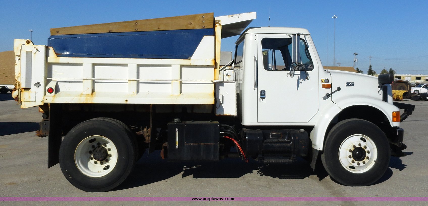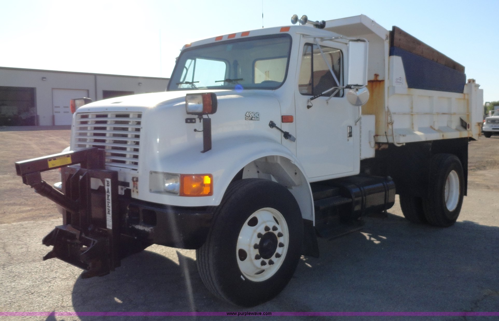 Purple Wave is selling a used Construction Dump Truck in Kansas. This item is a 1996 International 4900 dump truck with the following: 96,565 miles on odometer, Navistar DT466 7.6L diesel engine, 230 HP, Eaton Fuller eight speed manual transmission, Heater, AM/FM, Air ride seat, 9' dump bed, Manual end gate, Tailgate spreader, Flink 11' snow plow, Model 11PA38B, Serial 270, Flink plow mounting bracket, Strobe light power supply, 6' x 20" x 12" toolbox, Dual 50 gallon fuel tanks, Spring suspension, Pintle hitch, Trailer brake controller, Rear hydraulic hookup, PTO, Air brakes, 11R22.5 tires, Equip# 2067