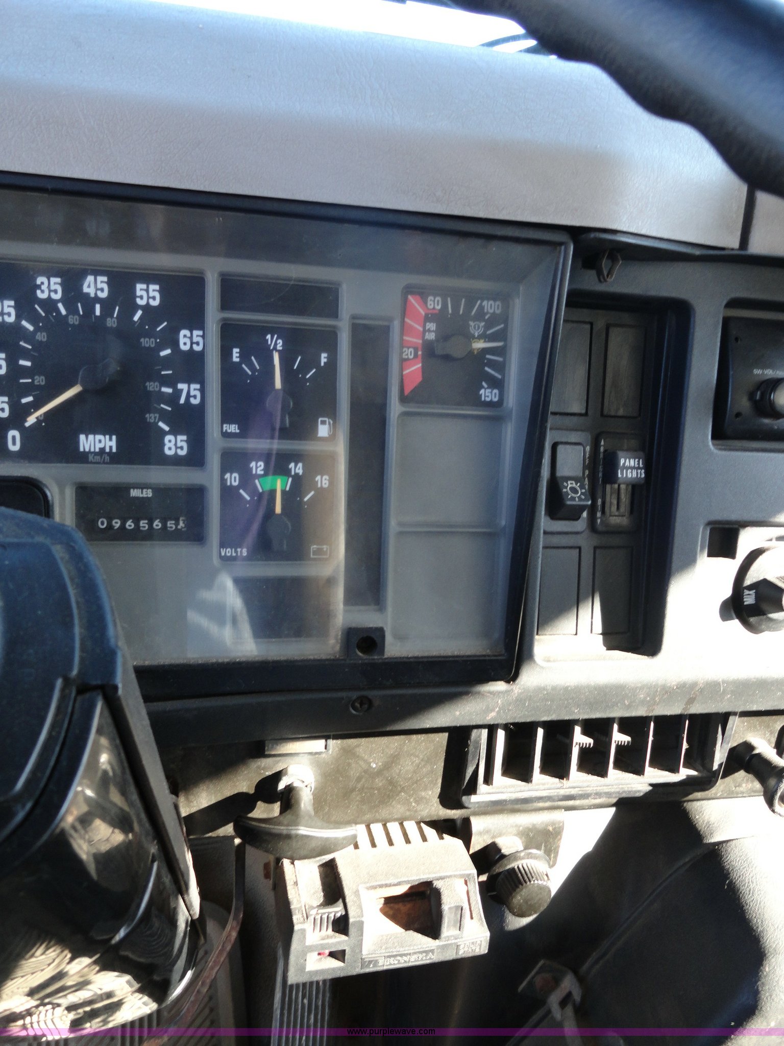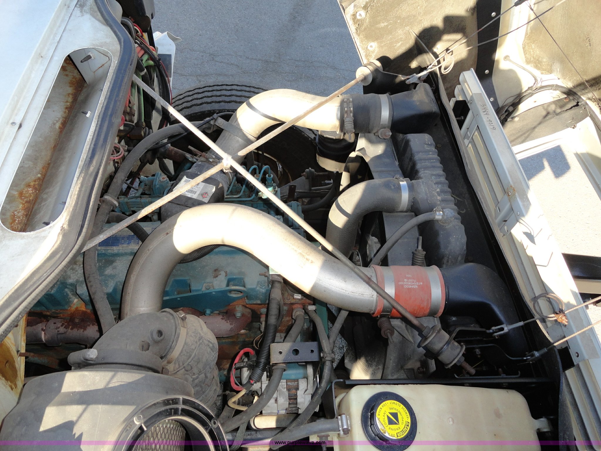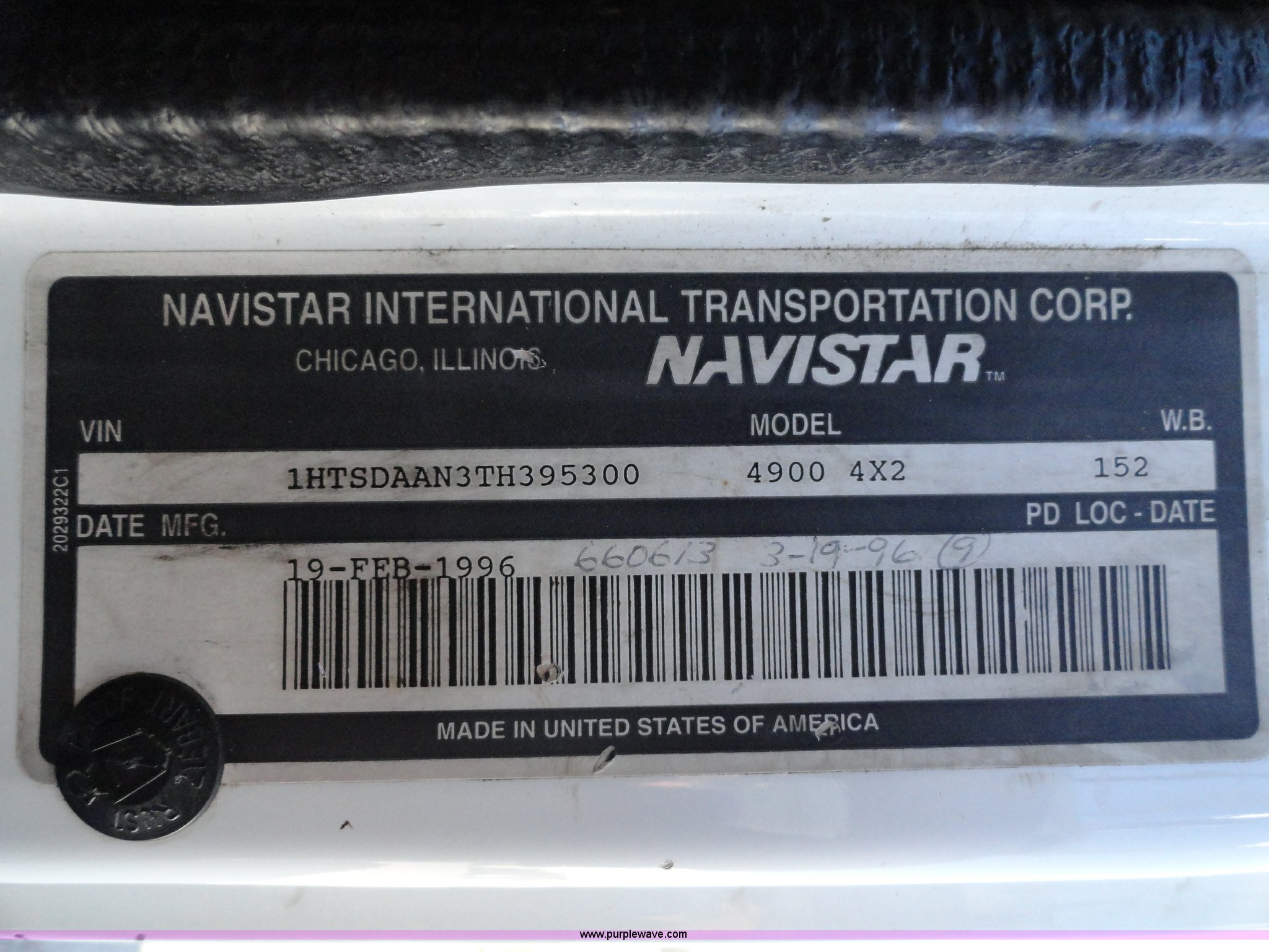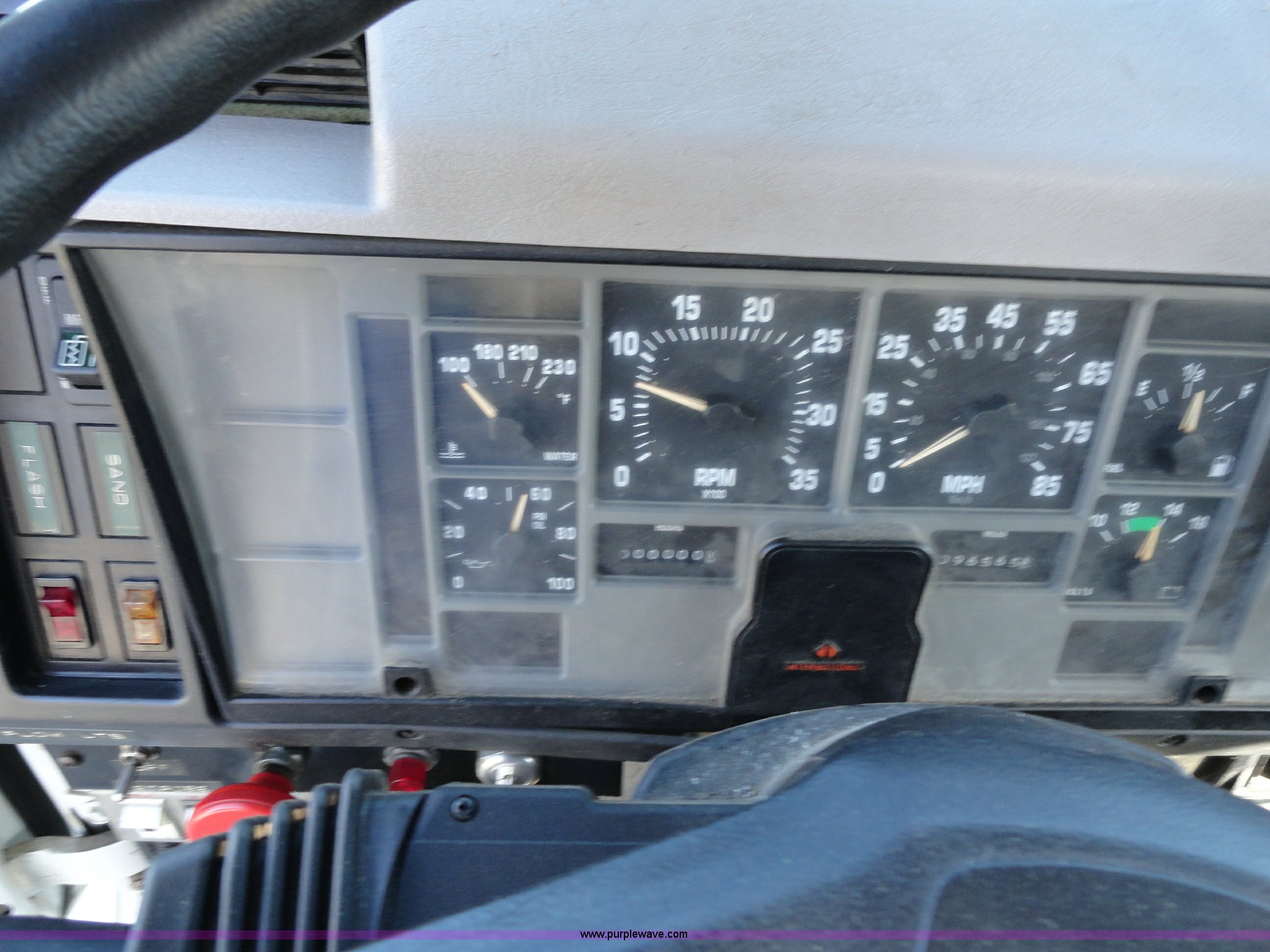 Purple Wave is selling a used Construction Dump Truck in Kansas. This item is a 1996 International 4900 dump truck with the following: 96,565 miles on odometer, Navistar DT466 7.6L diesel engine, 230 HP, Eaton Fuller eight speed manual transmission, Heater, AM/FM, Air ride seat, 9' dump bed, Manual end gate, Tailgate spreader, Flink 11' snow plow, Model 11PA38B, Serial 270, Flink plow mounting bracket, Strobe light power supply, 6' x 20" x 12" toolbox, Dual 50 gallon fuel tanks, Spring suspension, Pintle hitch, Trailer brake controller, Rear hydraulic hookup, PTO, Air brakes, 11R22.5 tires, Equip# 2067