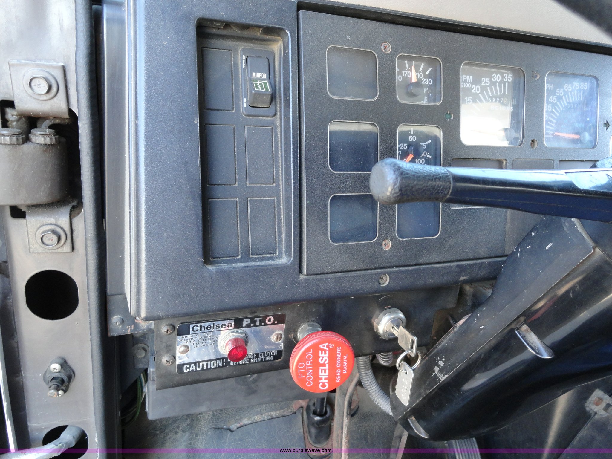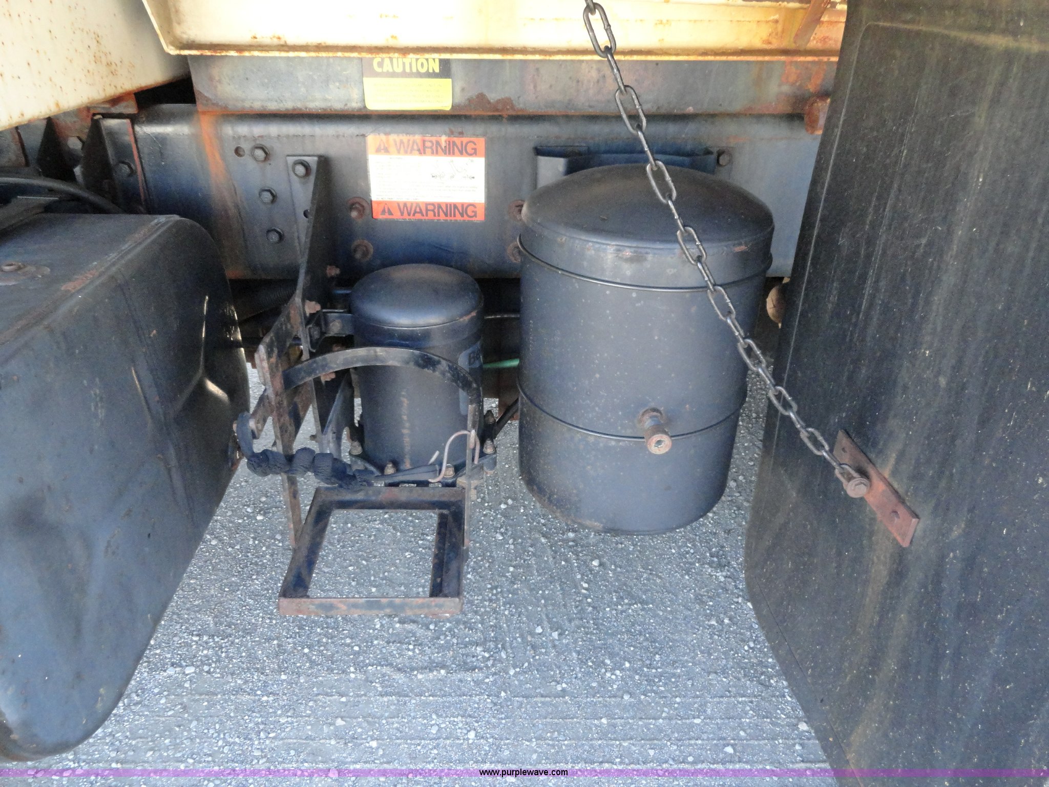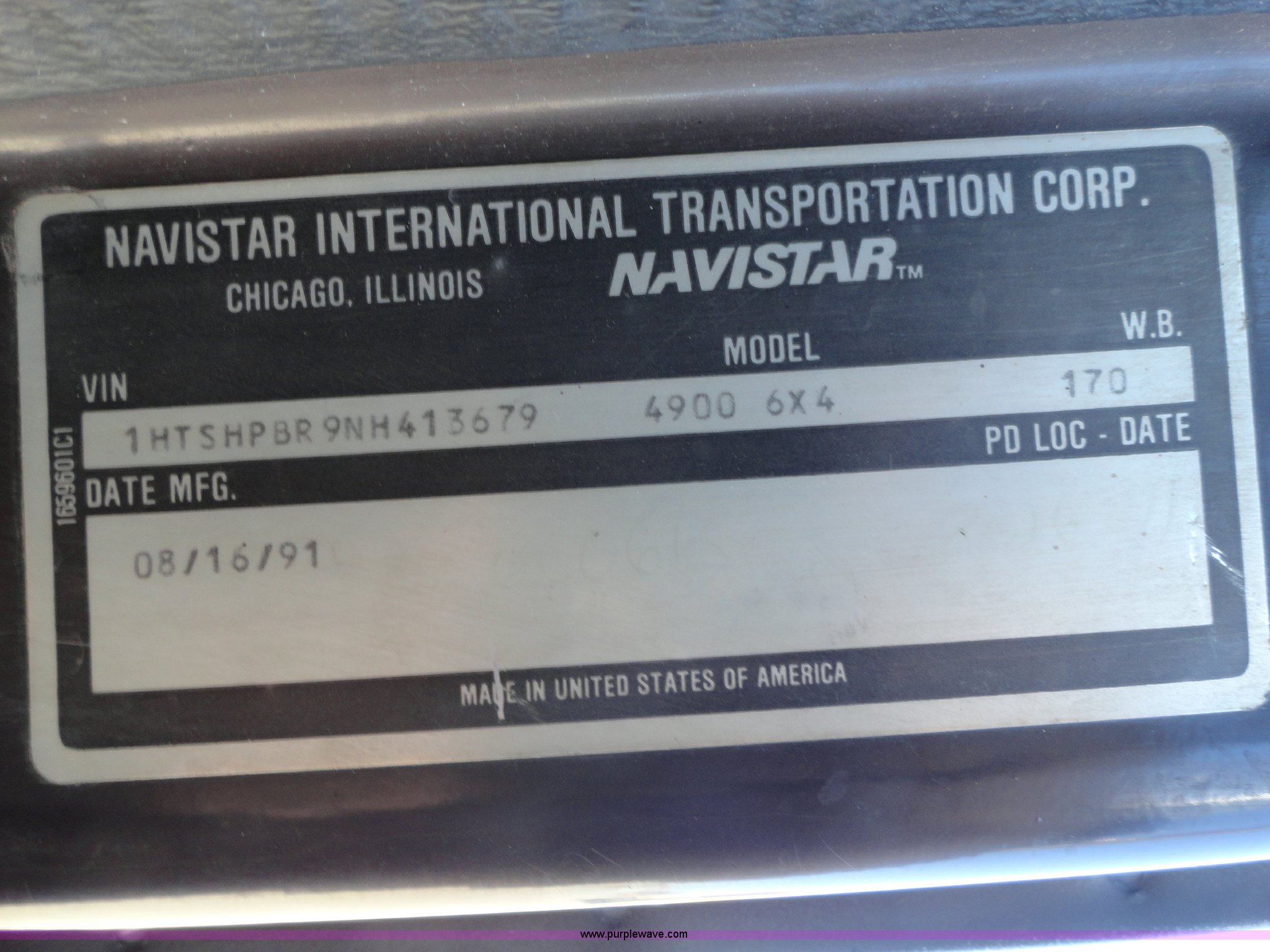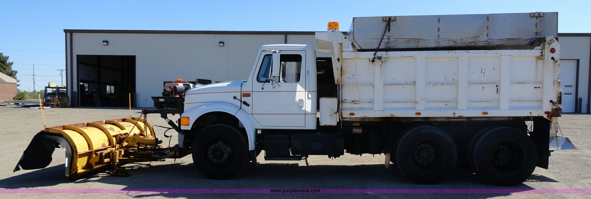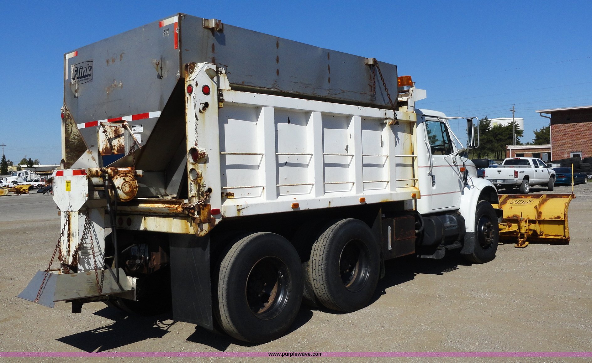 Purple Wave is selling a used Construction Dump Truck in Kansas. This item is a 1992 International 4900 tandem axle dump truck with plow and spreader with the following: 107,377 miles on odometer, 5,927 hours on meter, Navistar DT466 7.6L diesel engine, Eaton Fuller 10 speed manual transmission, Twin screw, Heater, AM/FM/Cassette, Power windows, Heated mirrors, 12' dump bed, Manual end gate, Flink 11' plow, Flink 10 yd. stainless steel spreader, Plow lights, Strobe light power supply, Dual 50 gallon fuel tanks, 6' x 20" x 12" toolbox, Spring suspension, PTO, Air brakes, 11R22.5 tires, Tailgate included, Equip# 5268