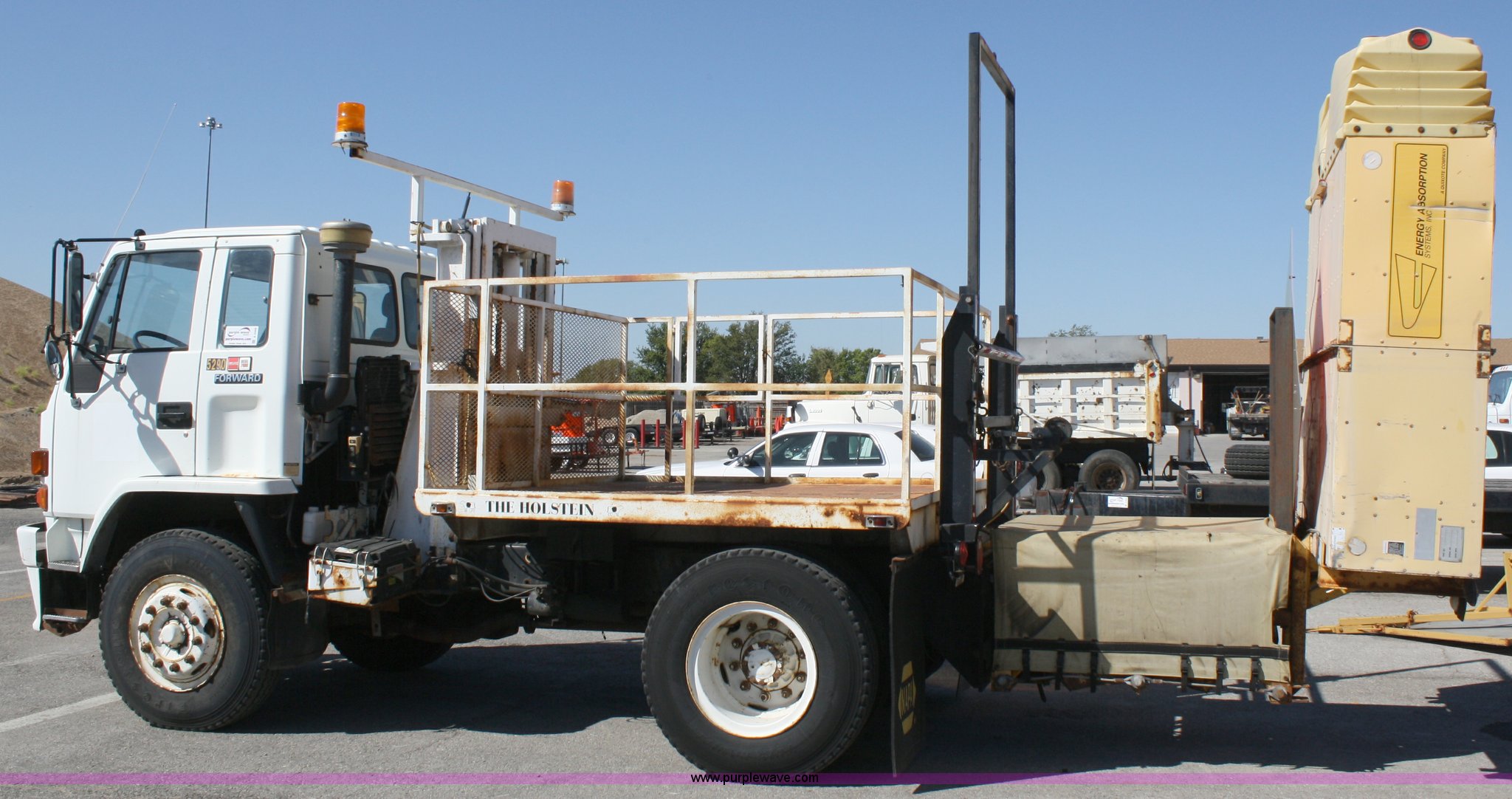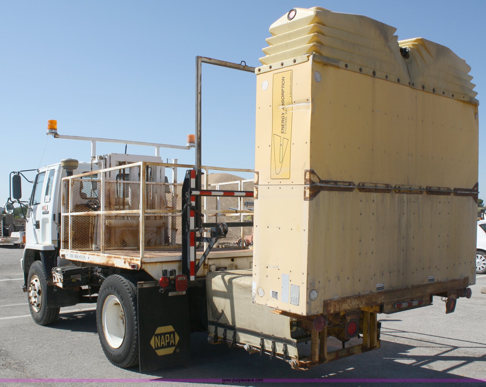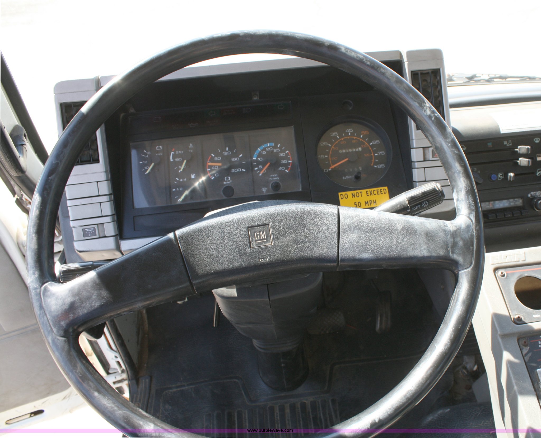Purple Wave is selling a used Flat Bed Truck in Kansas. This item is a 1991 GMC 7000 lift truck with the following: 81,634 miles on odometer, 3,922 hours on meter, Isuzu 5.8L six cylinder diesel engine, 170 HP, Automatic transmission, 8' x 7.5' lift platform, 10.00R20 tires, 1996 energy absorption crash attenuator, Serial M02263